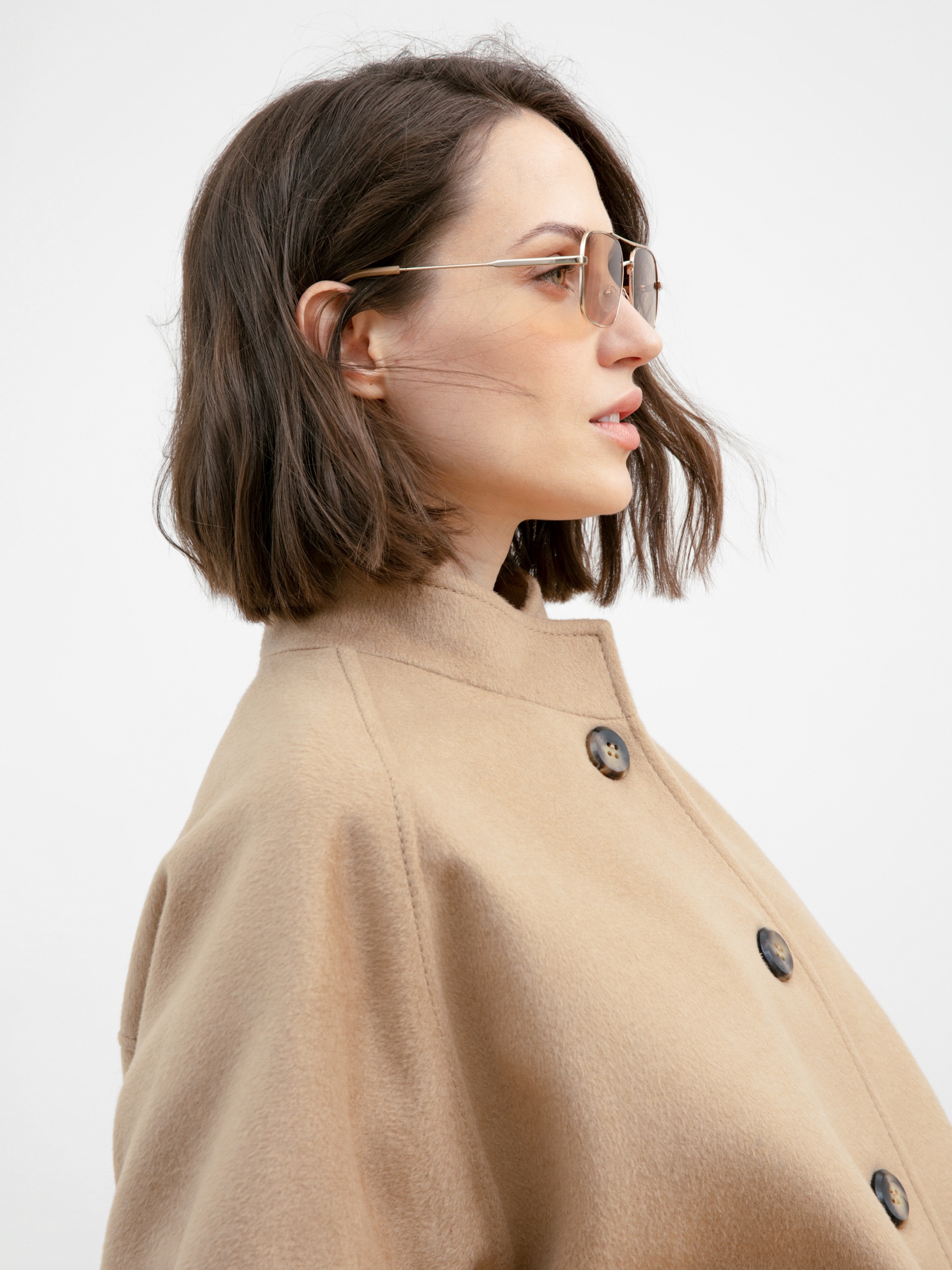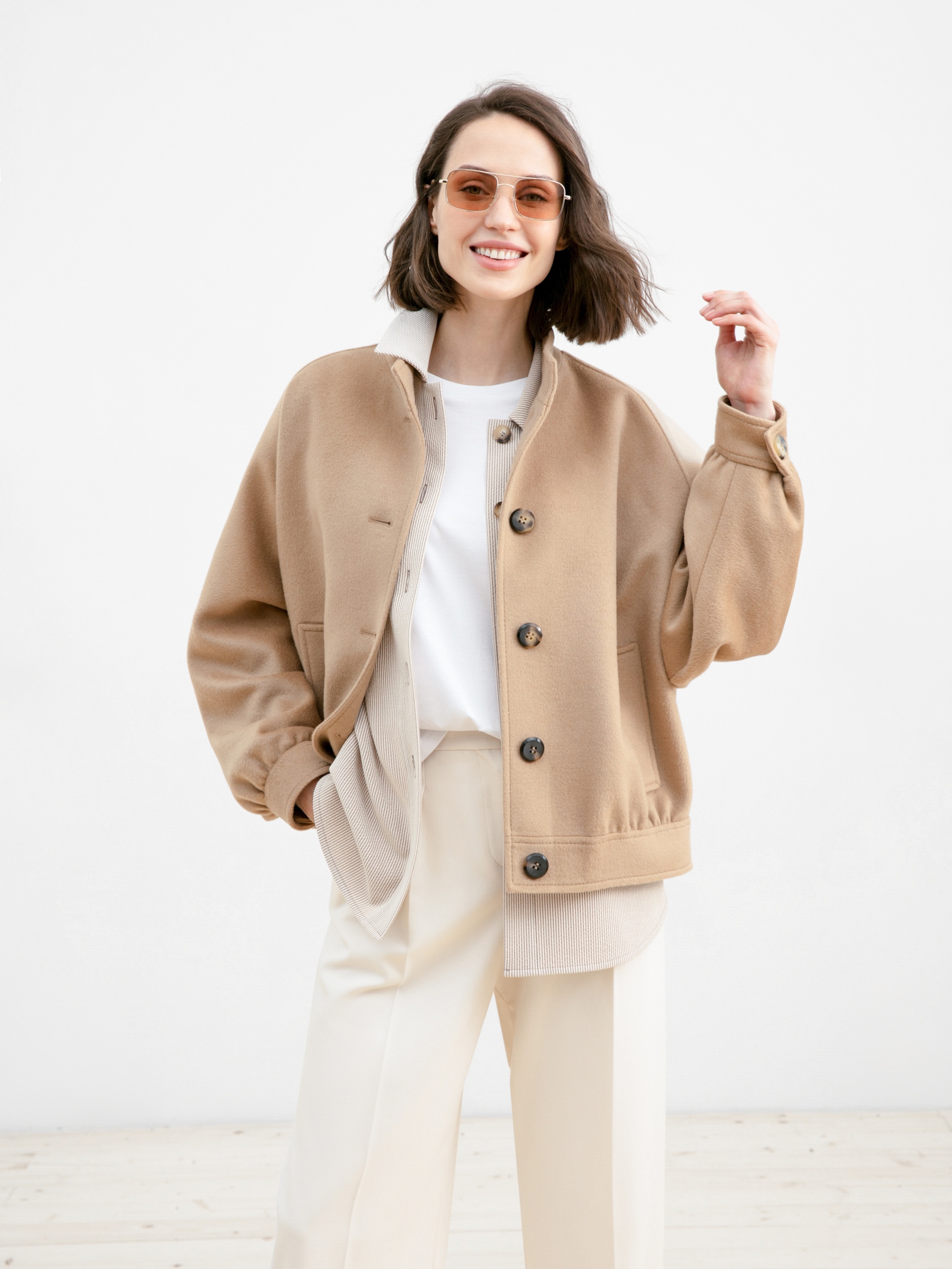 Укороченное пальто-жакет из ворсовой ткани с 70% содержанием шерсти. Легкое демисезонное пальто с воротником-стойкой. Прямой силуэт, застежка на ряд крупных пуговиц под натуральный рог. Комфортный рукав-реглан со спущенной линией плеча. Низ рукава обработан декоративной манжетой с застежкой на пуговицу, что не только служит декором, но и создает дополнительное прилегание для наилучшего сохранения тепла. Два глубоких кармана с геометричными листочками. Премиальная ткань с высоким содержанием шерсти невесомая, но при этом очень теплая, приятная к телу. Натуральные волокна в составе делают ткань упругой и прочной, наполняют ее такими свойствами, как гигроскопичность и терморегуляция. Пальто выполнено на подкладке. Произведено в Санкт-Петербурге.