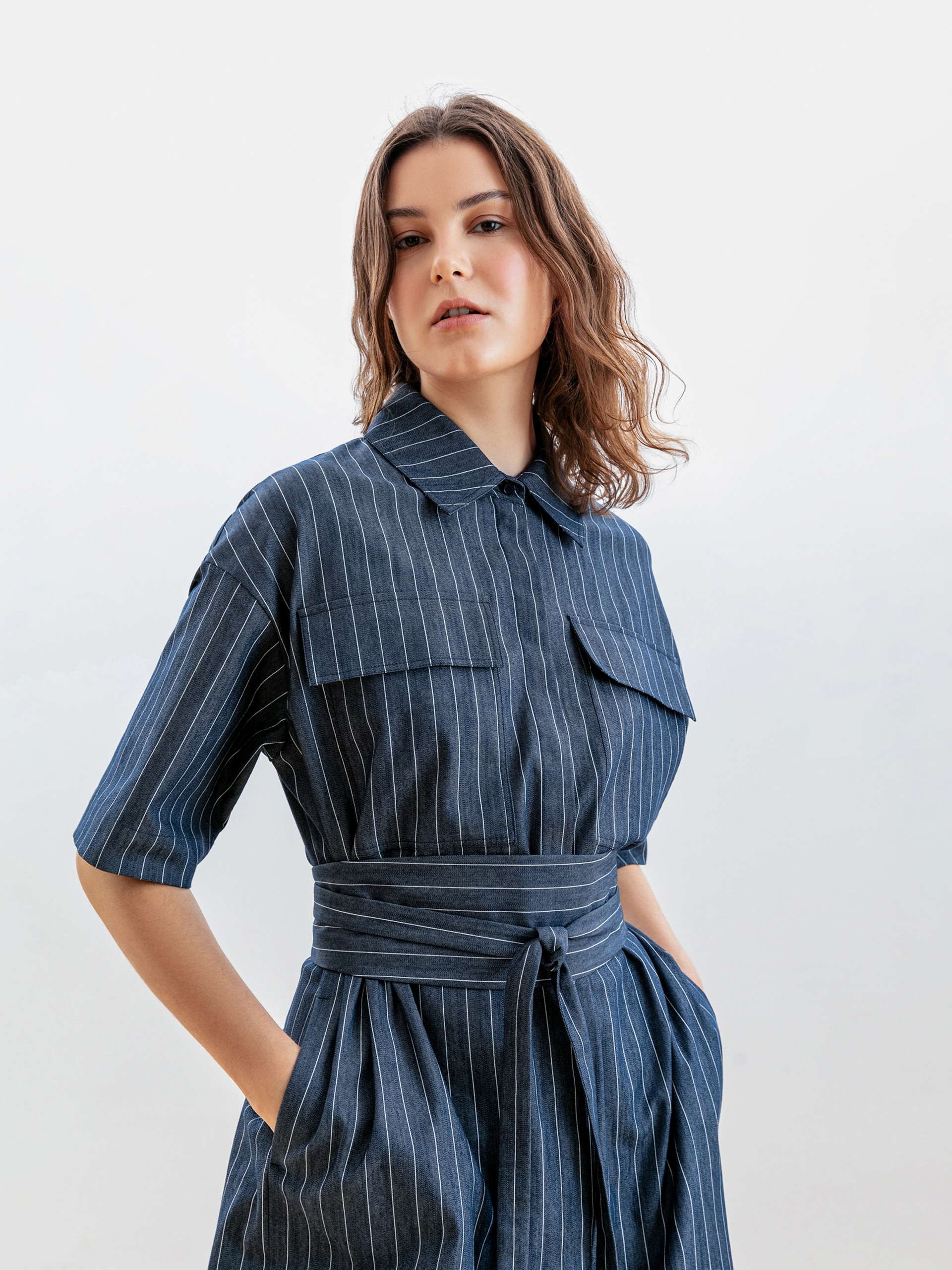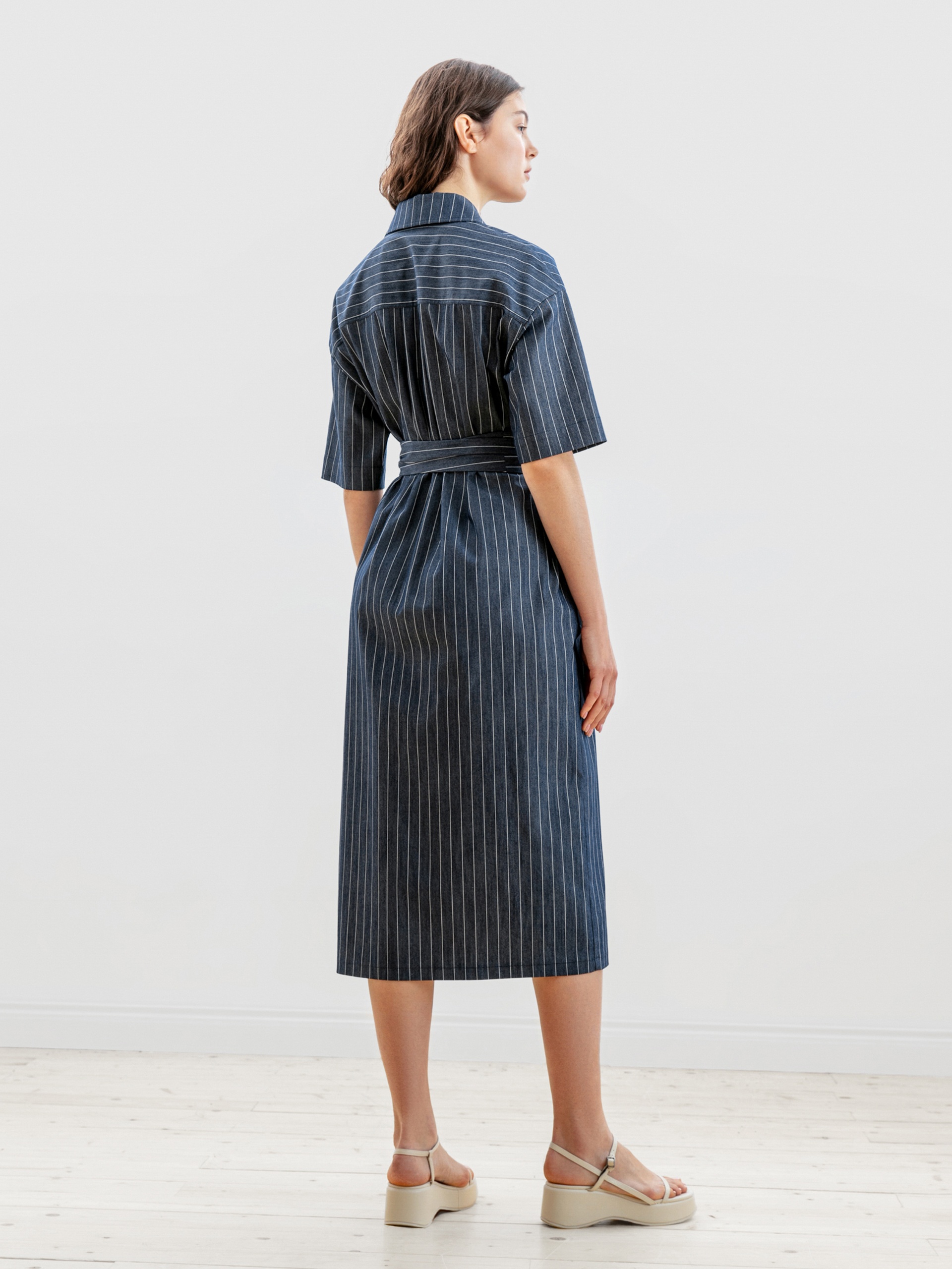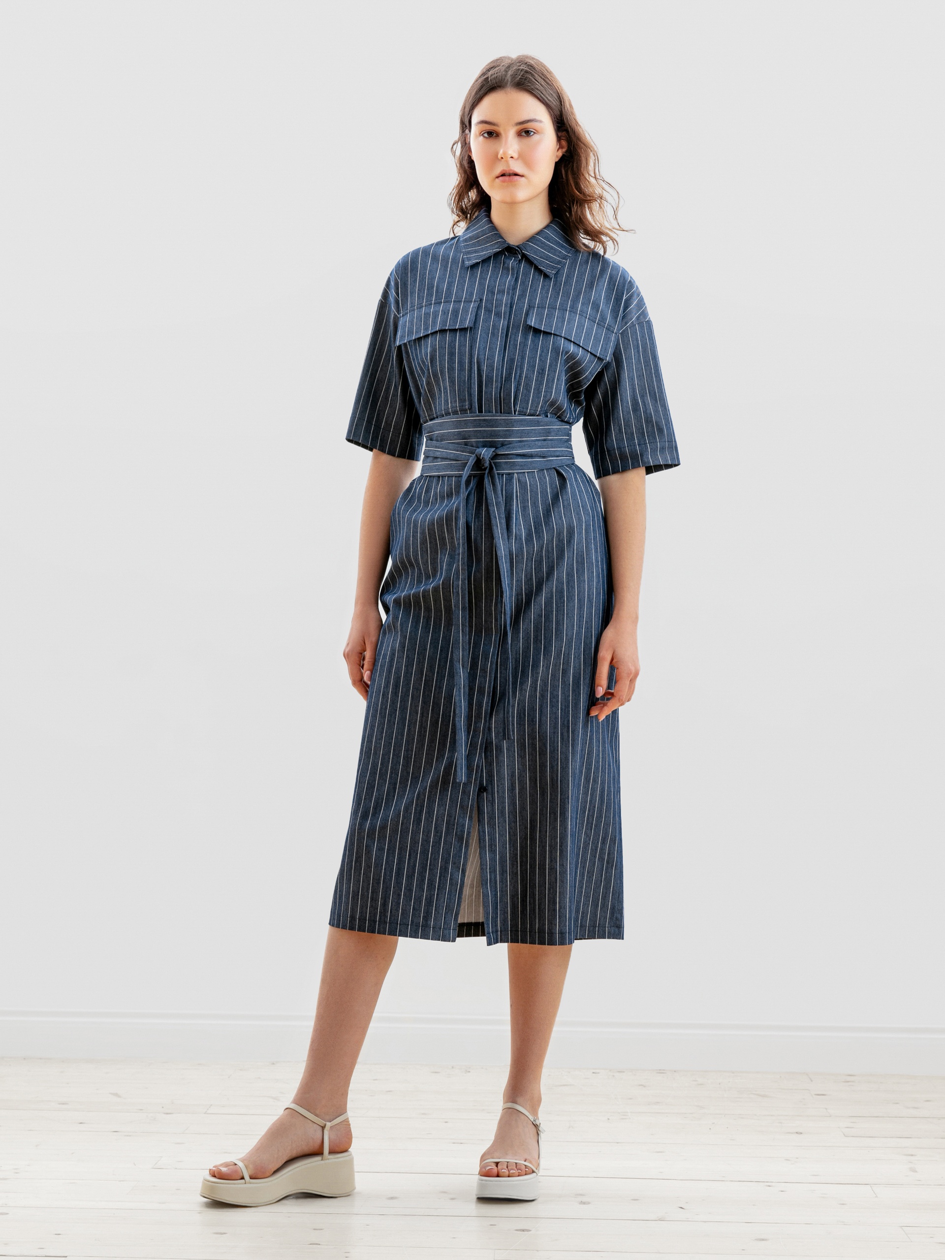 Платье длины миди полуприлегающего силуэта из облегченной летней джинсовой ткани в полоску с отложным воротником и укороченным рубашечным рукавом. Застежка спереди потайная на пуговицы.