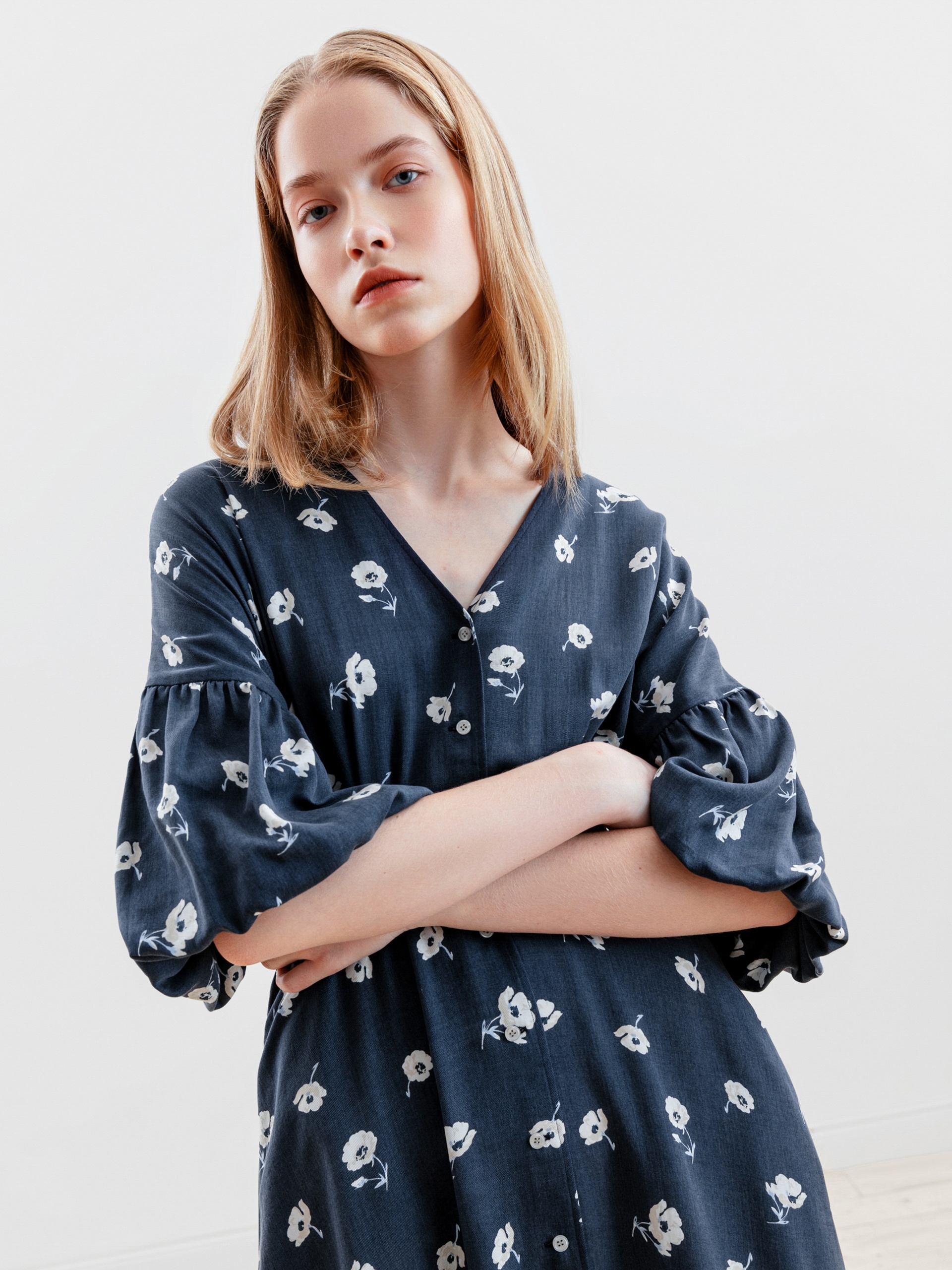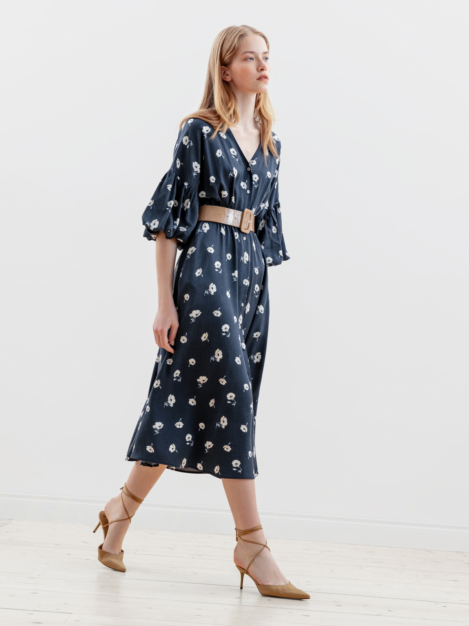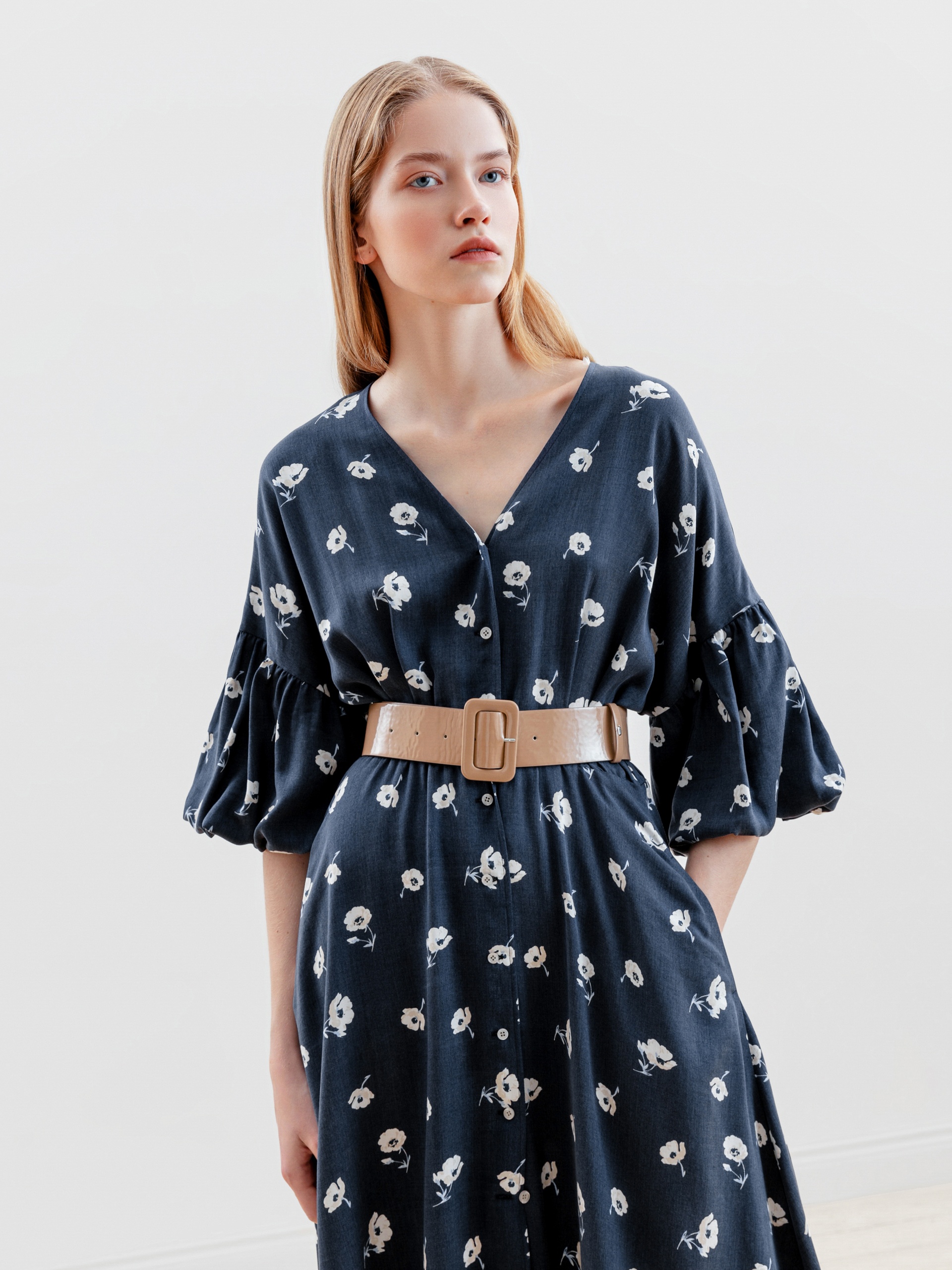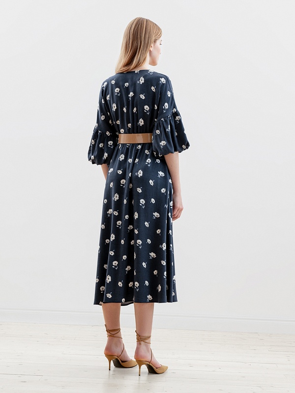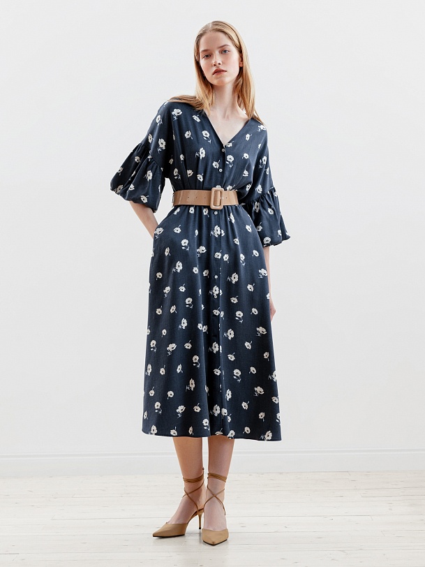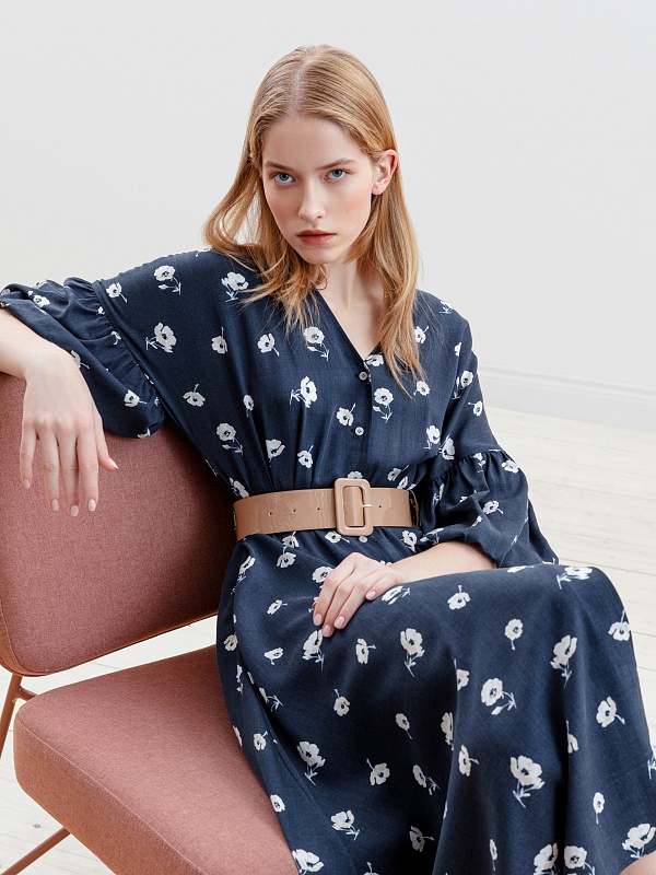 Романтическое платье полуприлегающего силуэта длины миди из натуральной вискозы в цветочном принте. Вырез горловины V-образный, рукав-кимоно с широким женственным воланом по низу. Застежка спереди на ряд пуговиц. В комплект входит ремень из светлой экокожи для создания более приталенного силуэта.