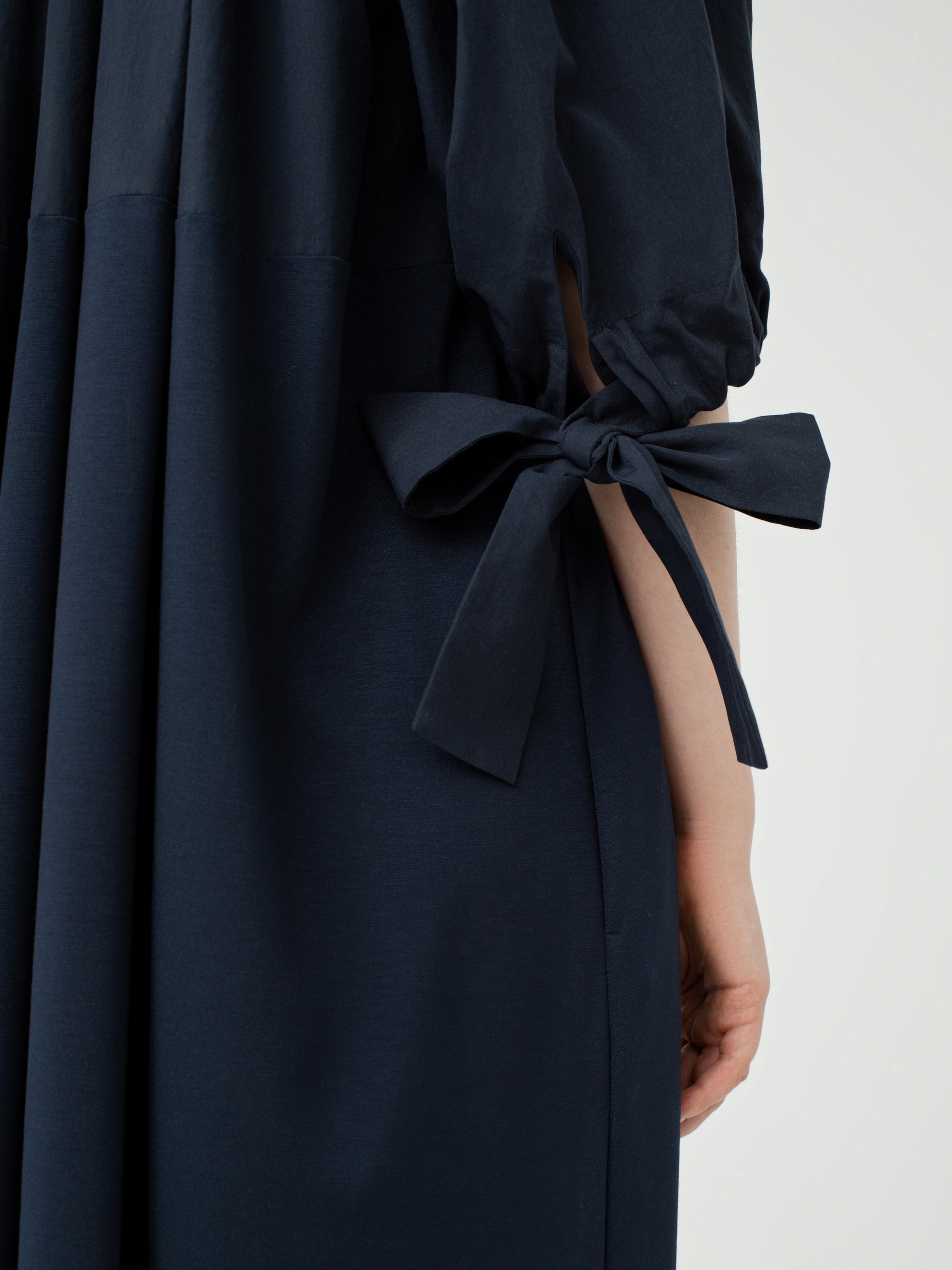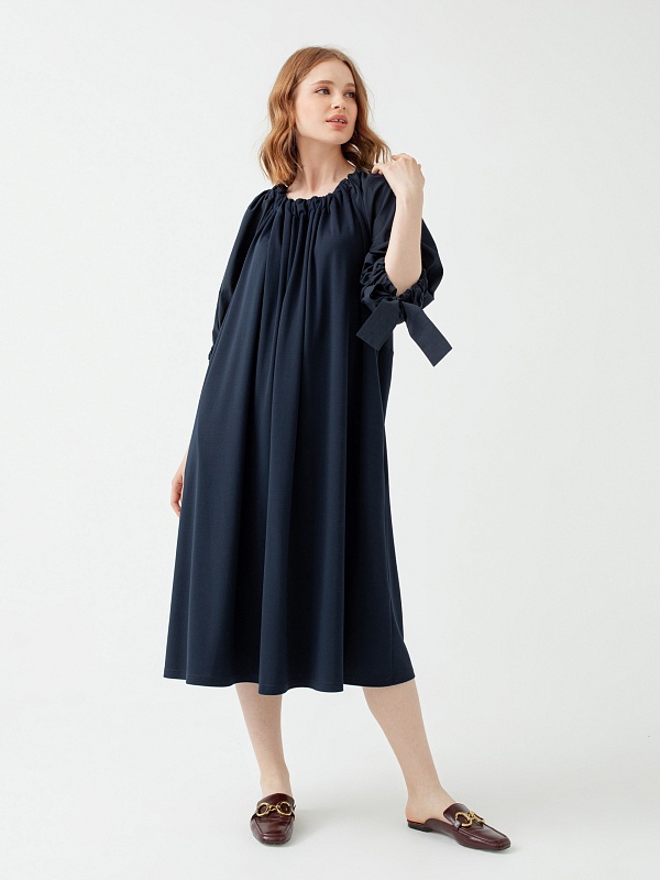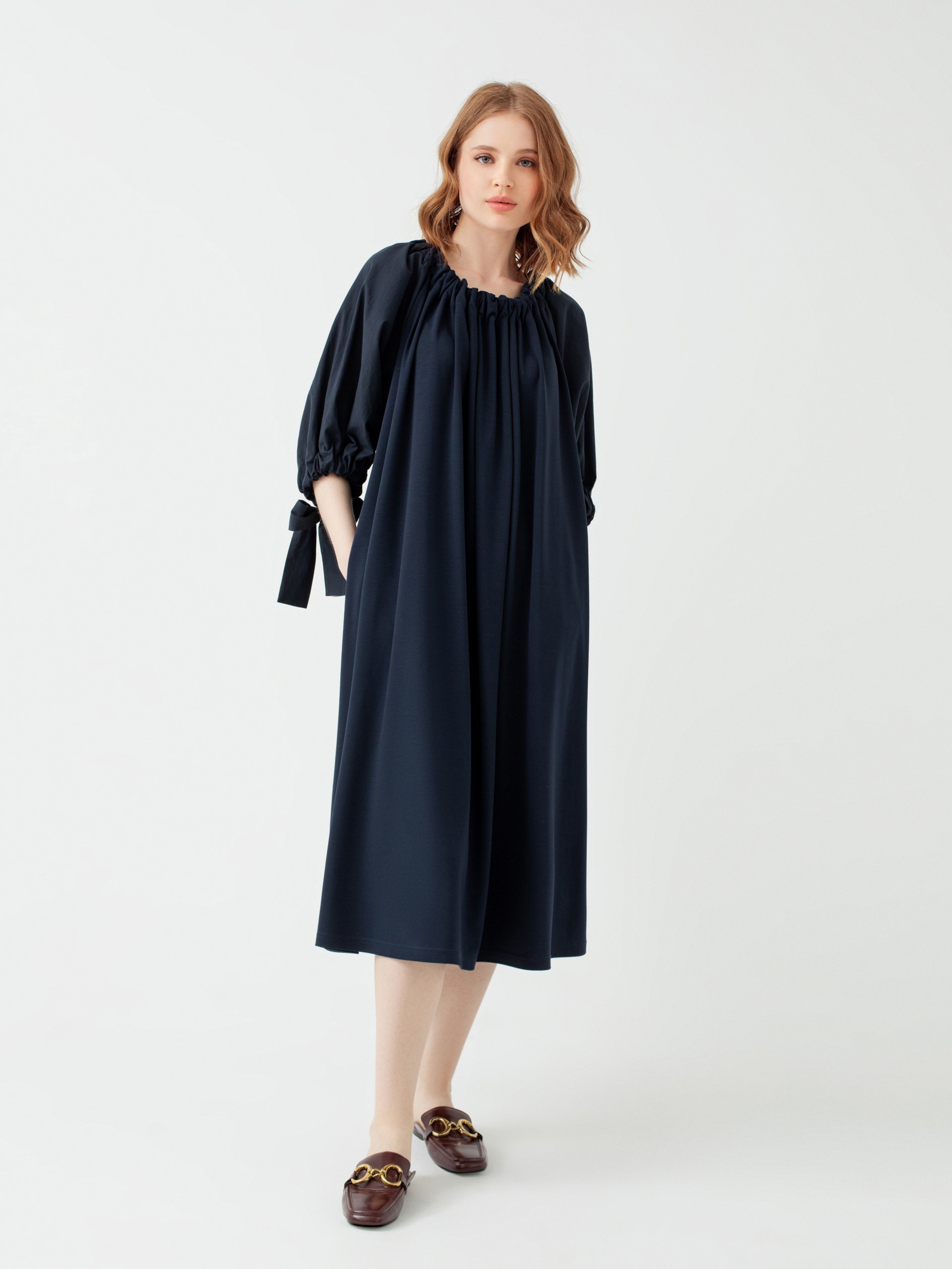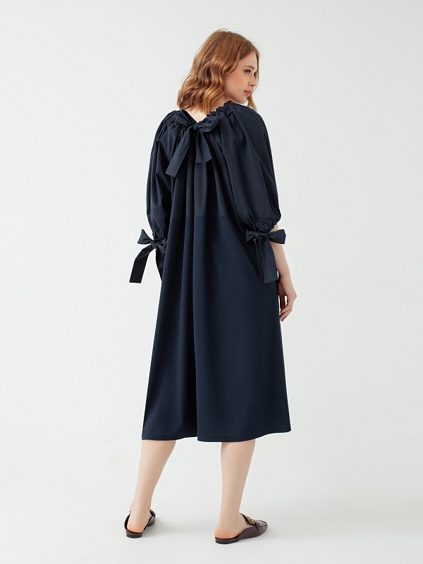 Платье прямого силуэта из трикотажного полотна тёмно-синего цвета с обьёмным укороченным рукавом реглан. Платье очень нежное и женственное, несмотря на глубокий цвет. Благодаря большому количеству сборок платье подчеркнет вашу хрупкость и нежность, а банты на рукавах и спинке добавляют платью романтического настроения.