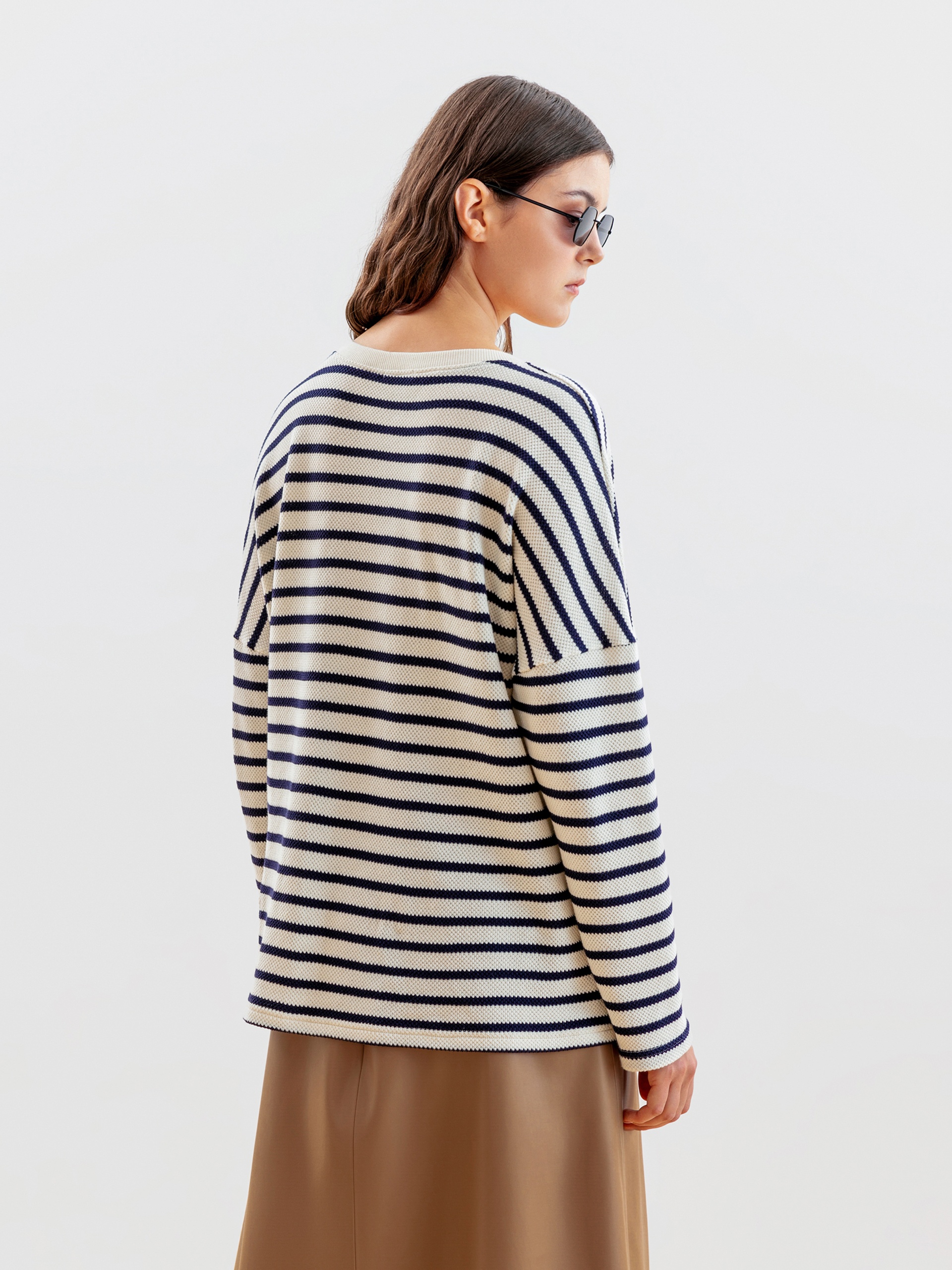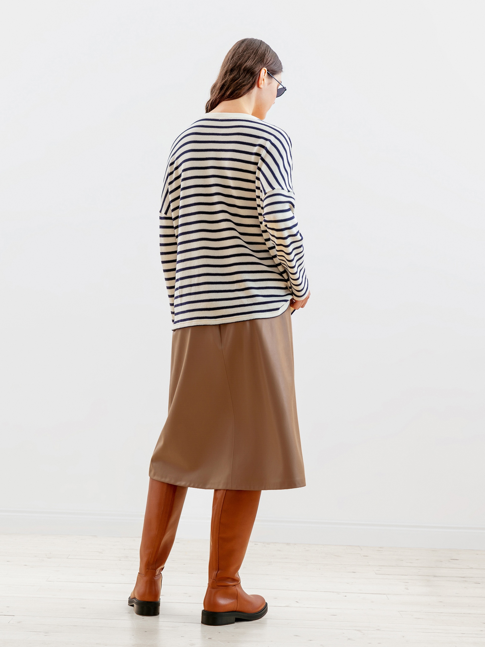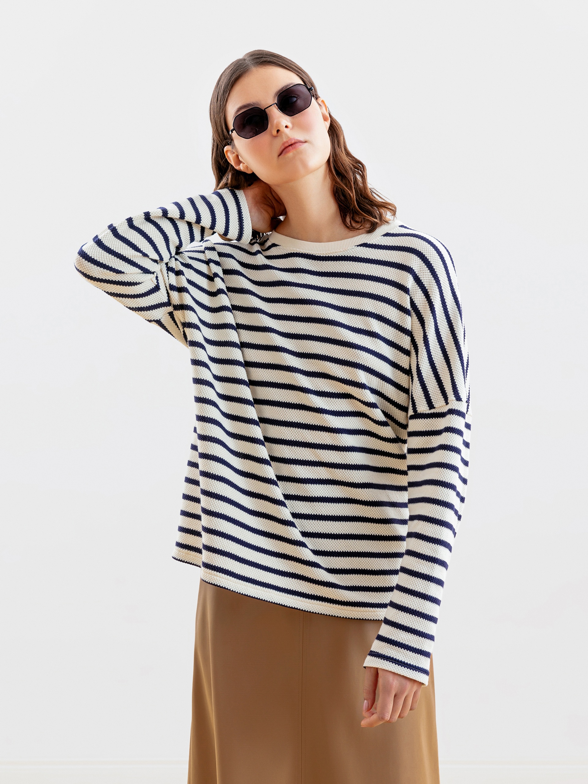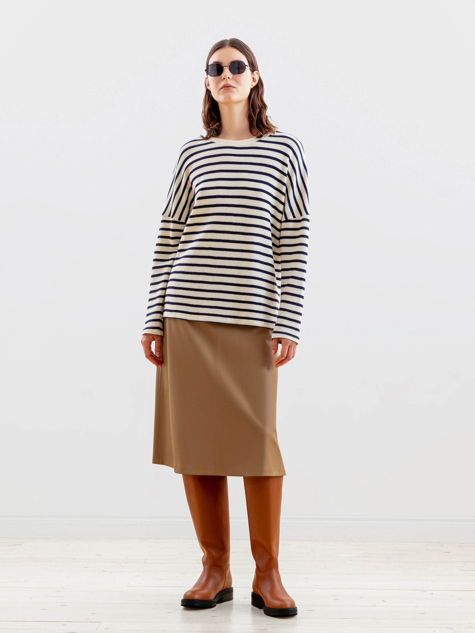 Женский джемпер прямого силуэта из трикотажного полотна в бежево-синюю полоску.