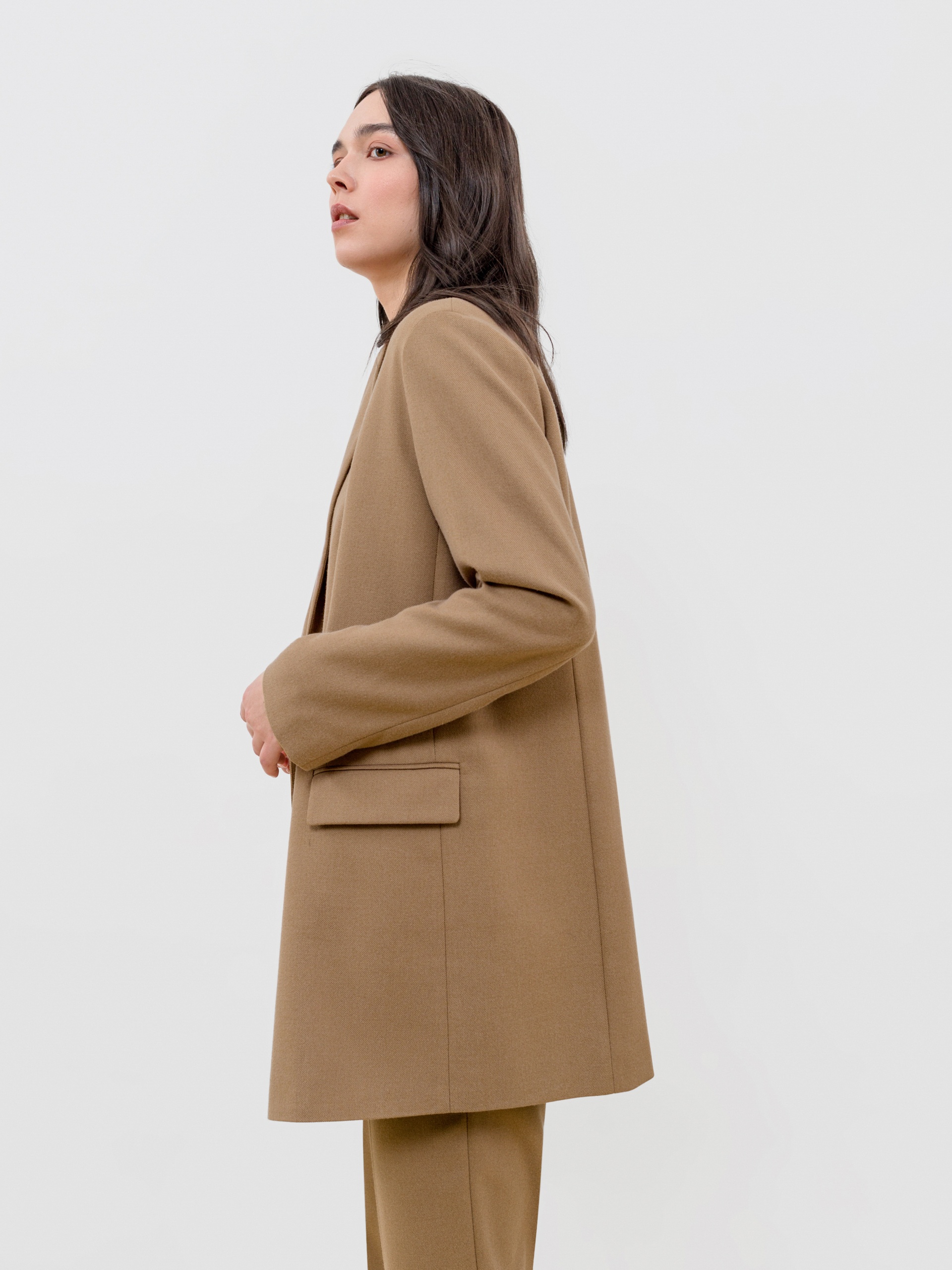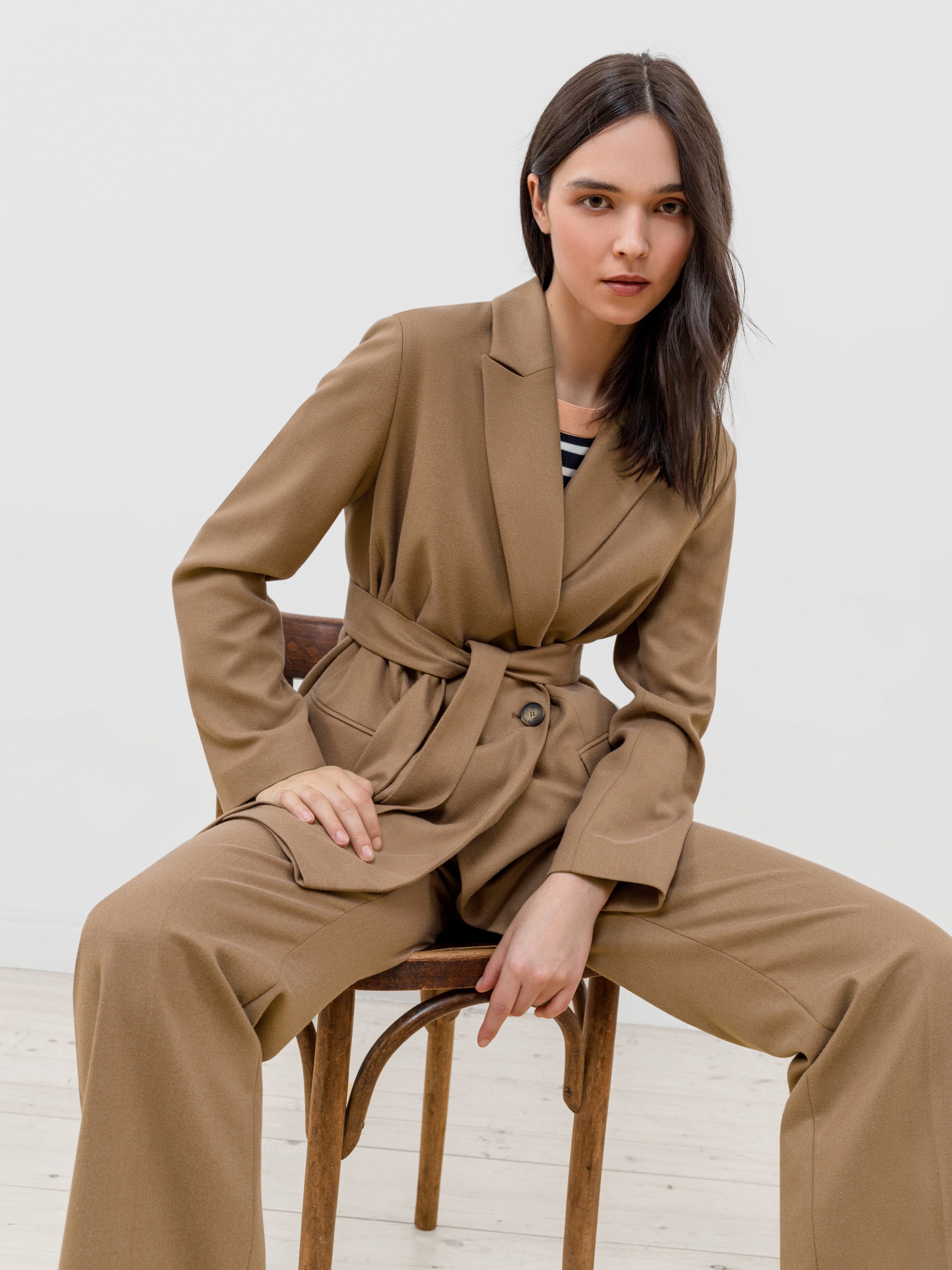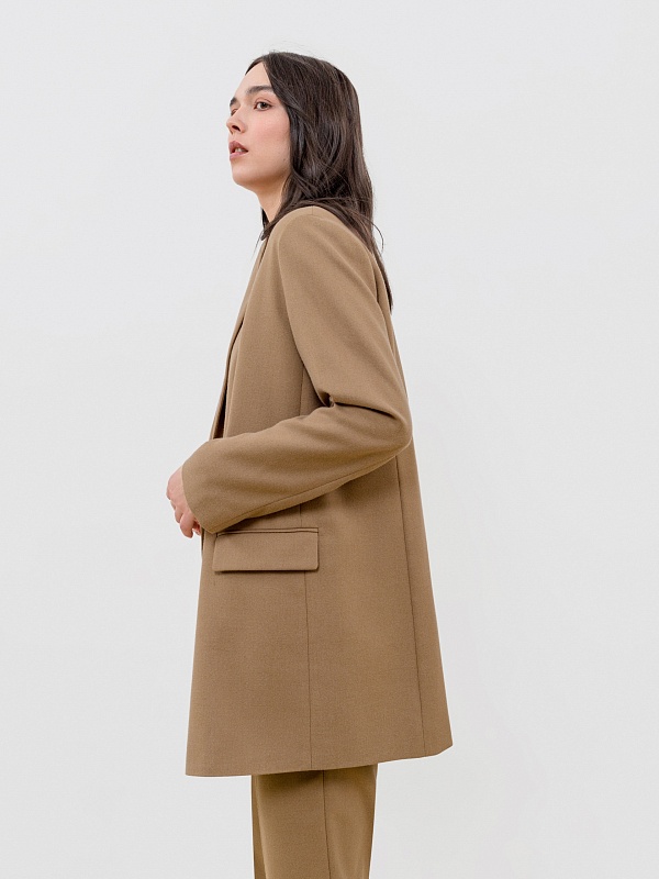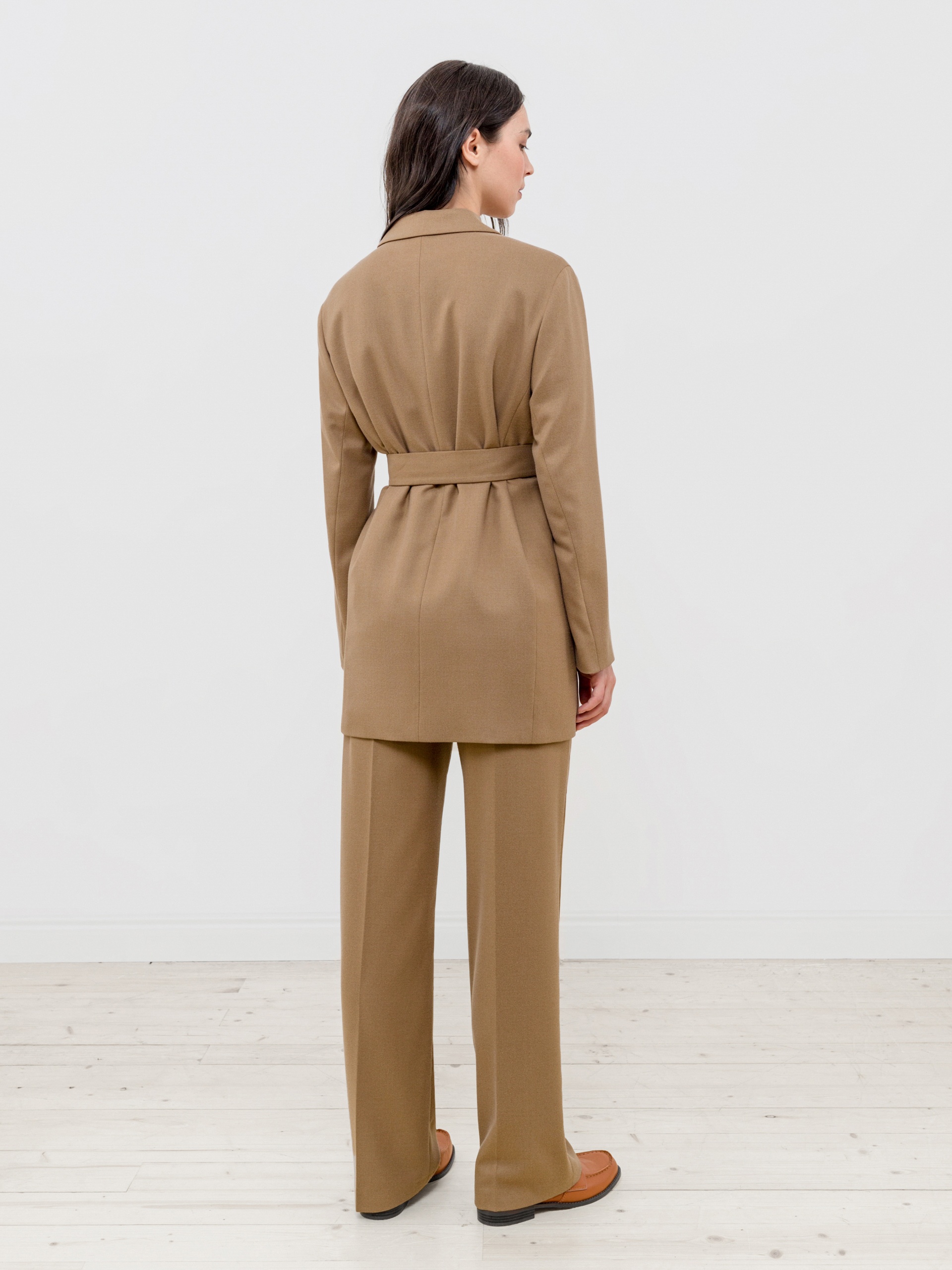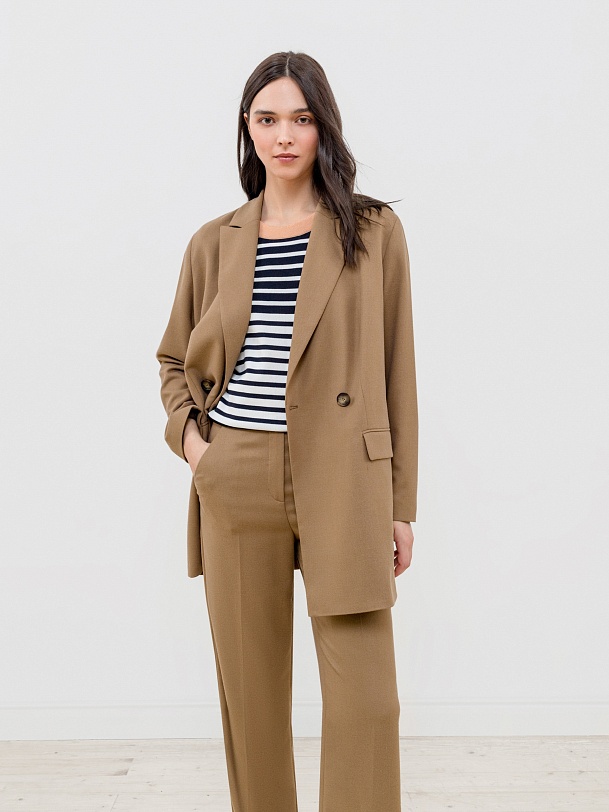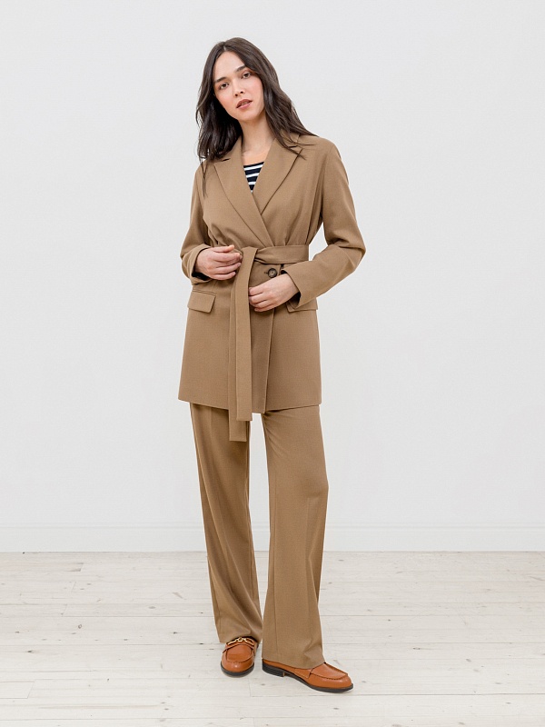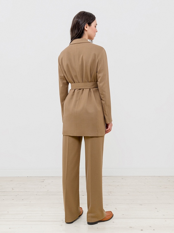 Двубортный жакет прямого силуэта из костюмной ткани орехового цвета. Воротник английский, рукав втачной полной длины. Застёжка спереди на две крупные пуговицы. В комплект входит пояс из основной ткани для создания более приталенного силуэта.