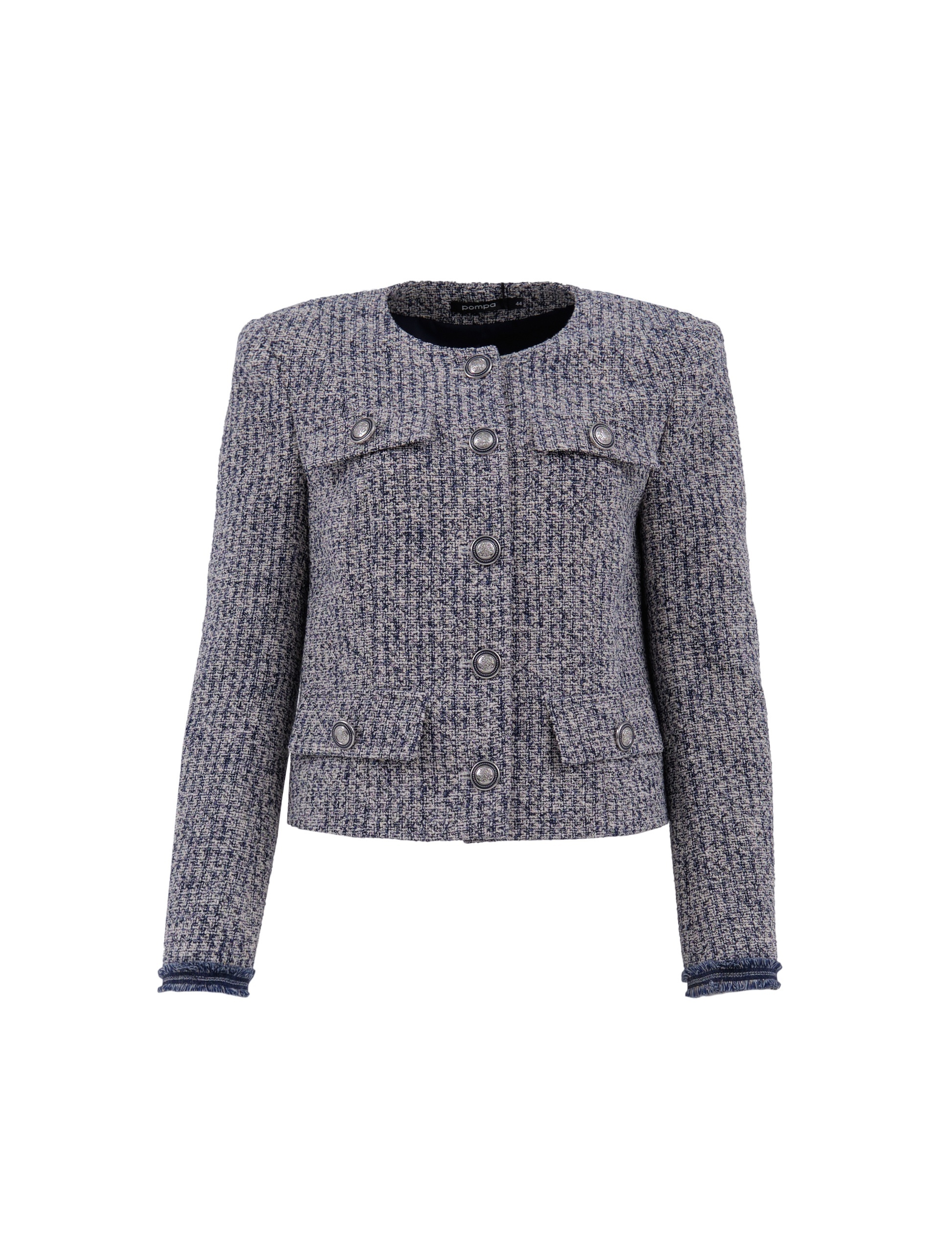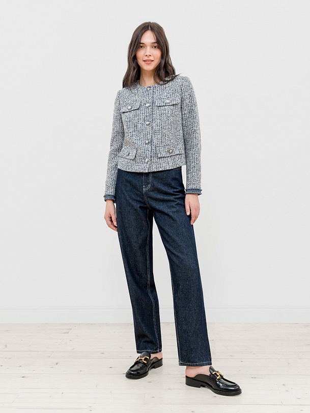 Укороченный жакет на подкладке прямого силуэта из твидовой ткани с круглым вырезом горловины и втачным рукавом полной длины. Застежка спереди на ряд крупных контрастных пуговиц. В качестве декоративных элементов четыре кармана с клапанами.