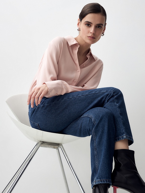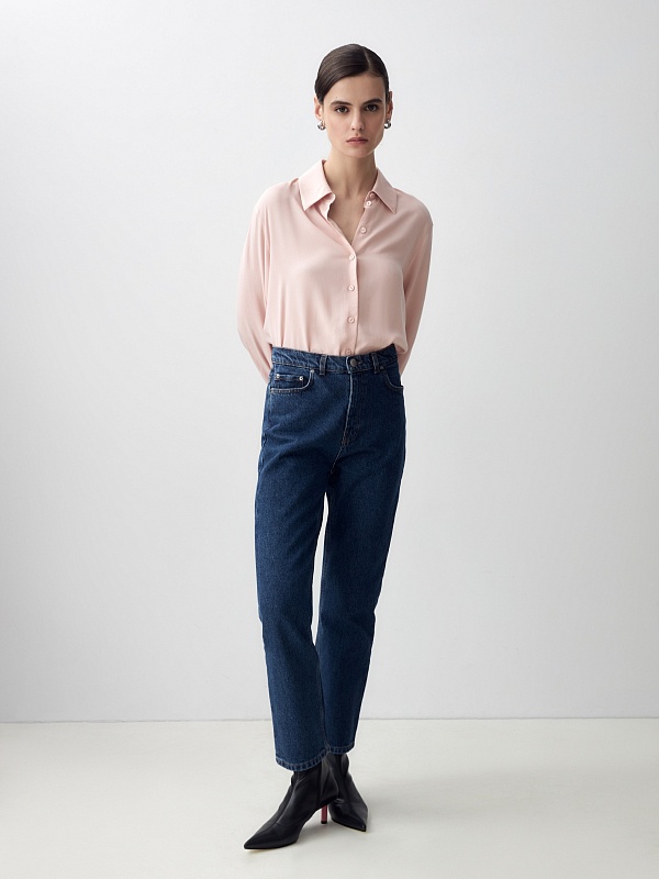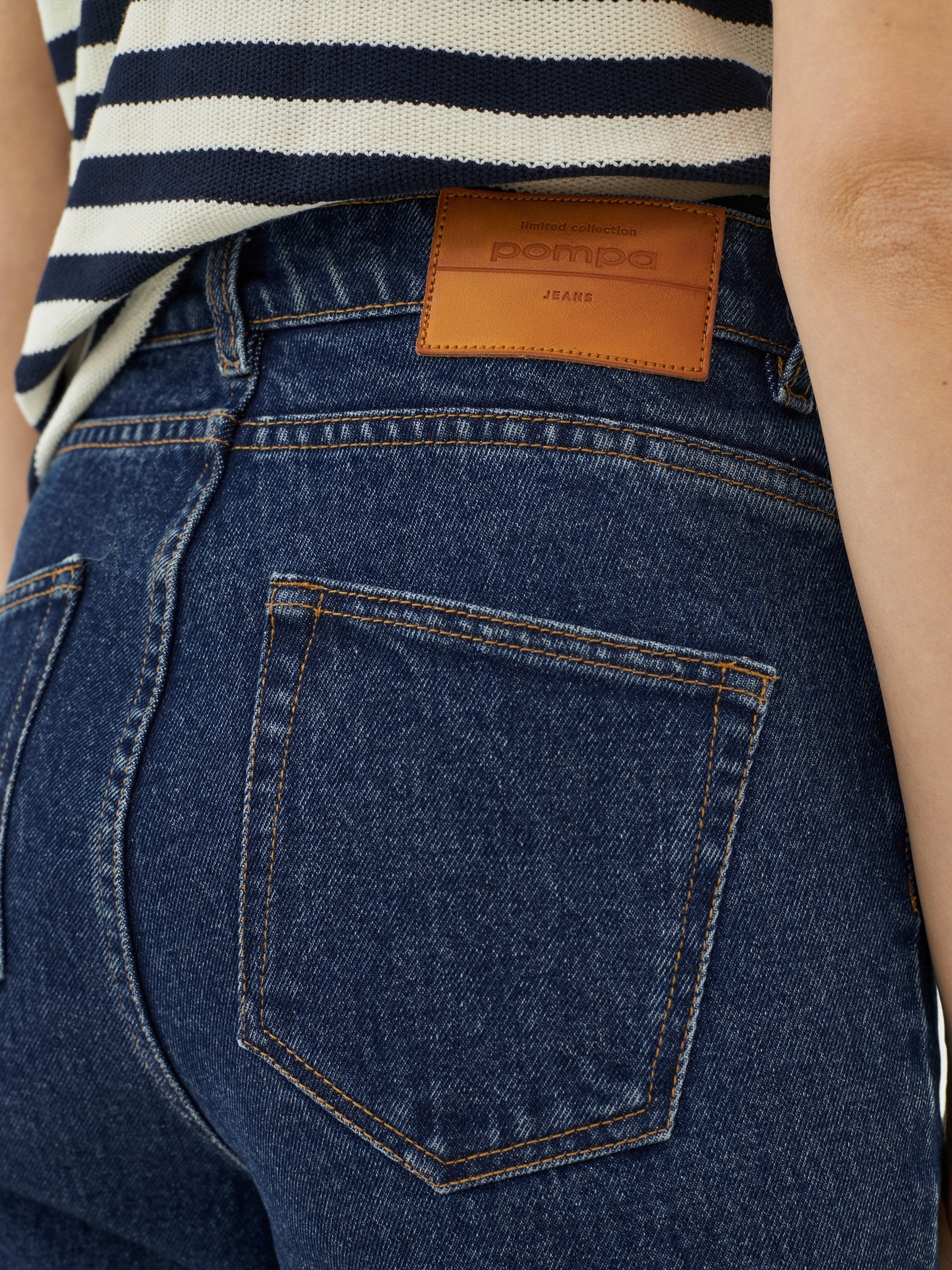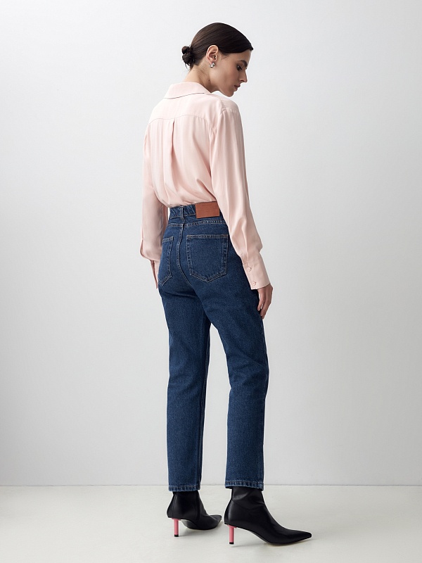 Джинсы полуприлегающего силуэта из джинсовой ткани цвета индиго с высокой посадкой. Укороченная длина брюк, застежка на молнию и пуговицу. Имеют два функциональных кармана спереди и два накладных кармана на задней части брюк.