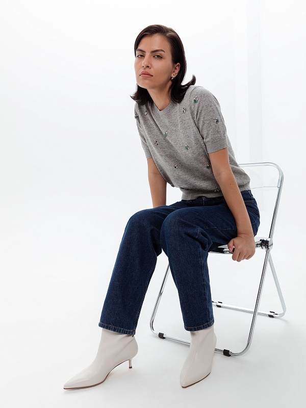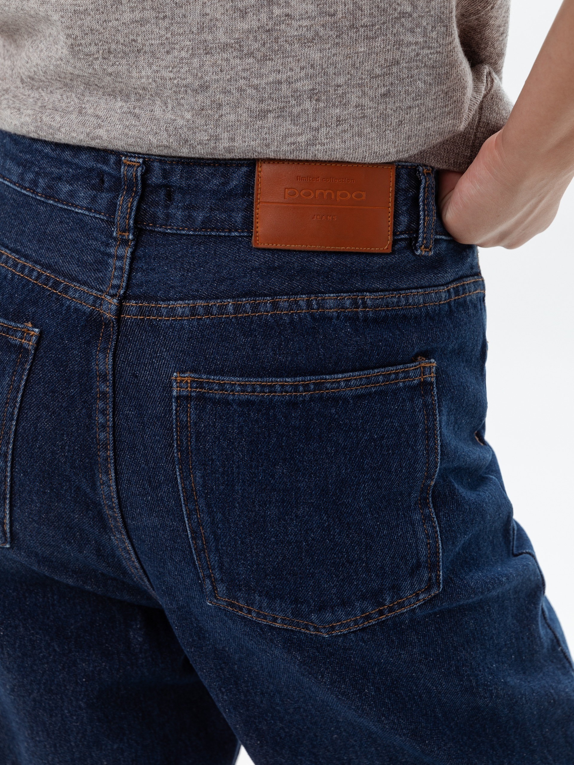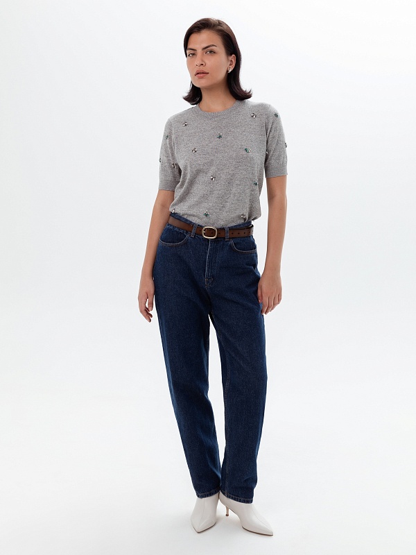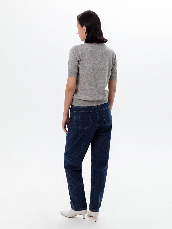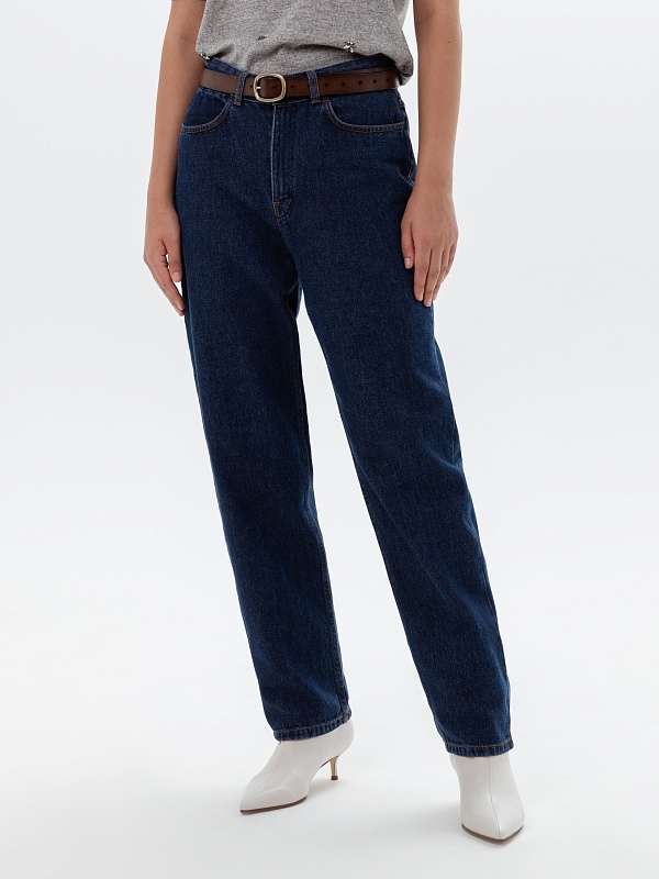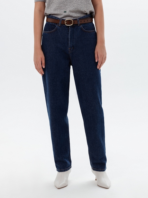 Джинсы конического силуэта из джинсовой ткани цвета индиго с высокой посадкой. Длина брюк полная, слегка заужены к низу, застежка на молнию и пуговицу. Имеют два функциональных кармана спереди и два накладных кармана на задней части брюк.