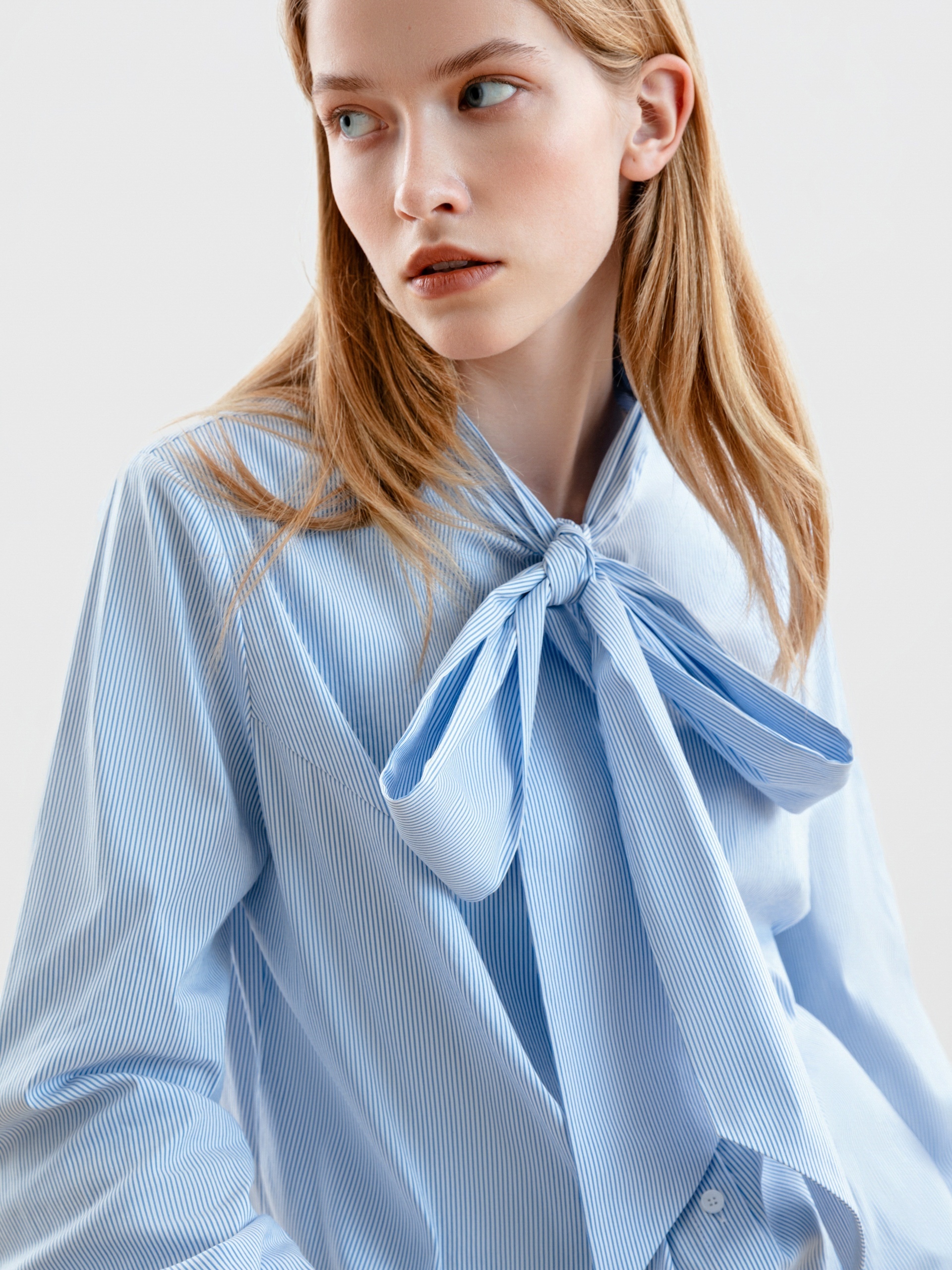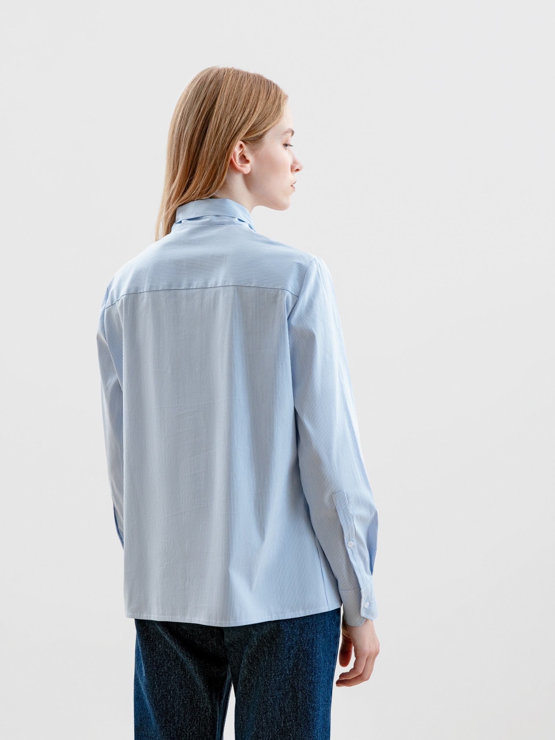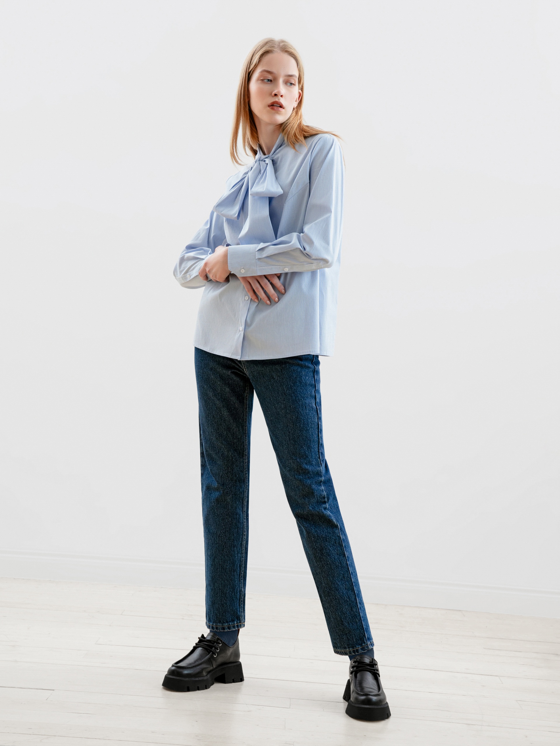Блуза прямого силуэта из хлопковой ткани в полоску с втачным рукавом полной длины на манжете. Воротник-стойка переходит в элегантный бант. Застежка спереди на пуговицы. Эта модель станет прекрасным дополнением к брючным комплектам.