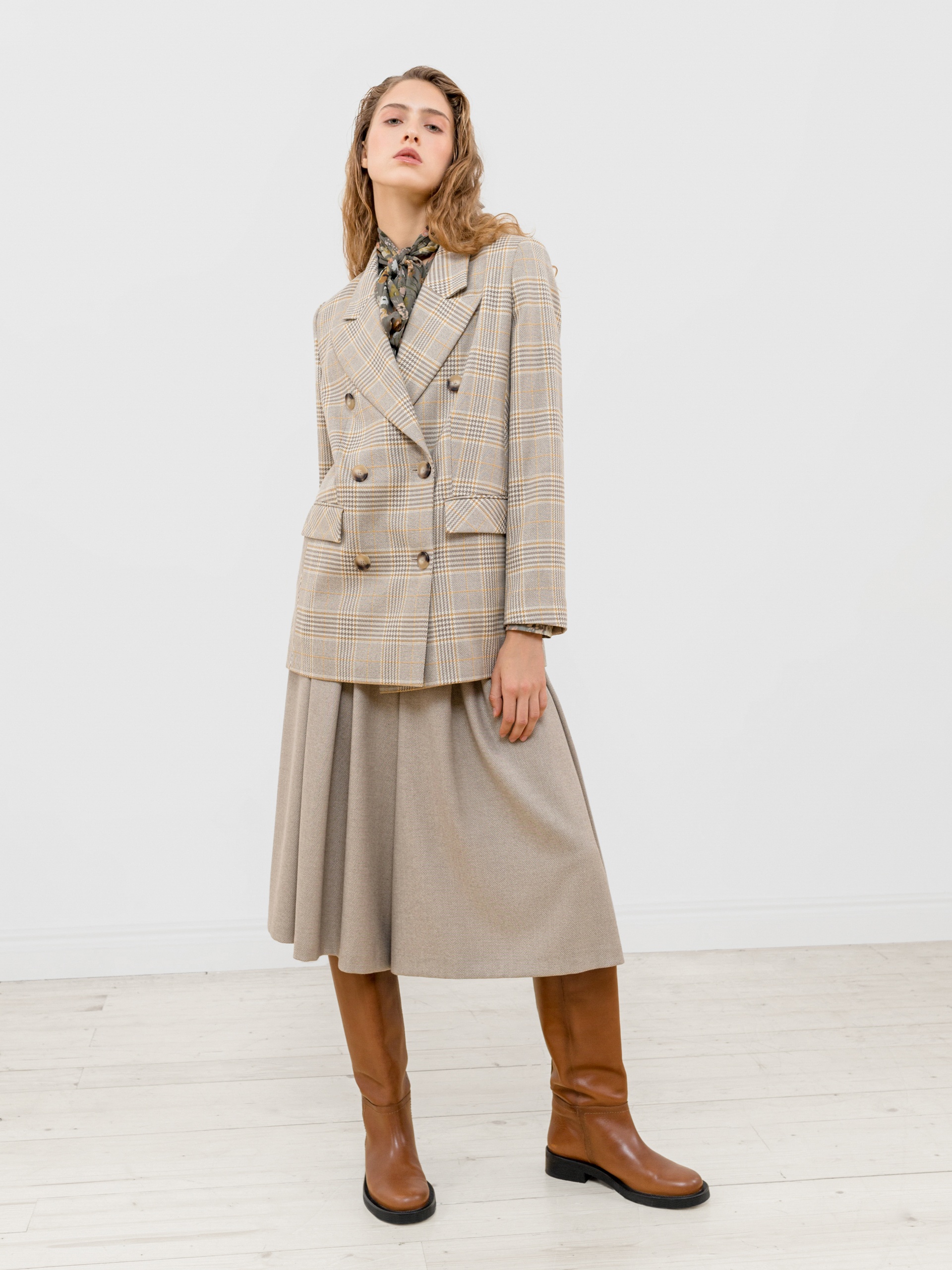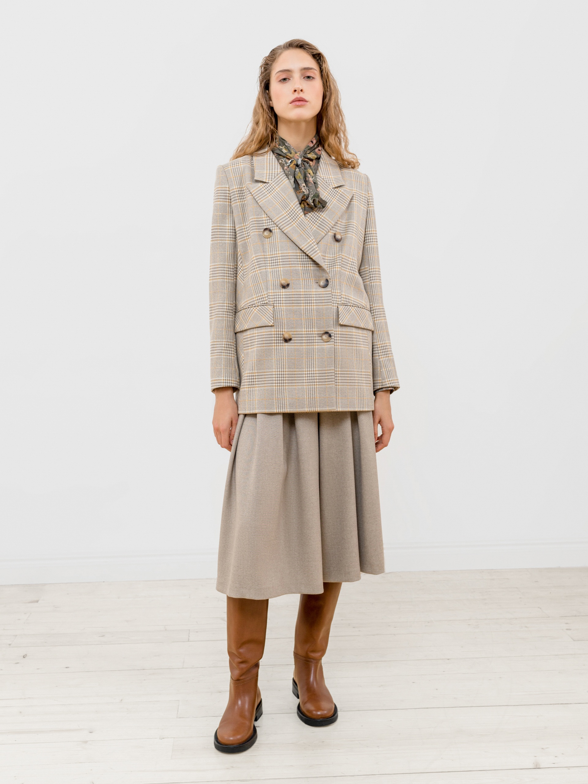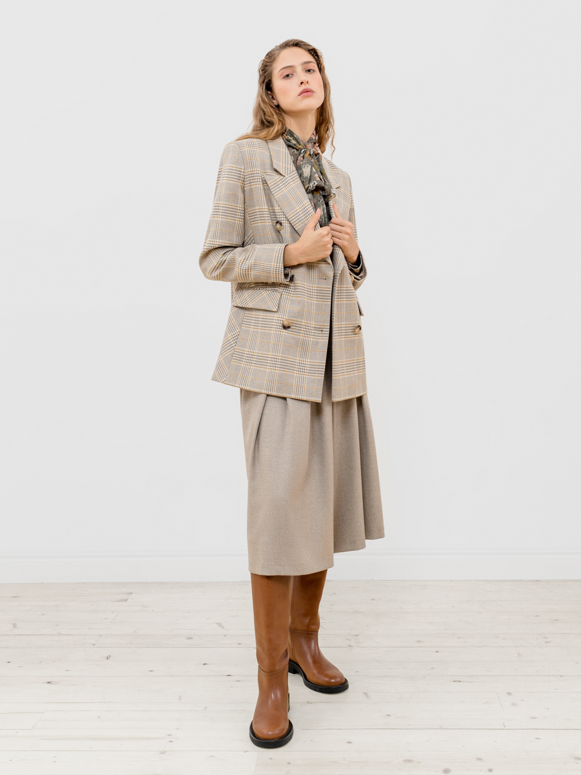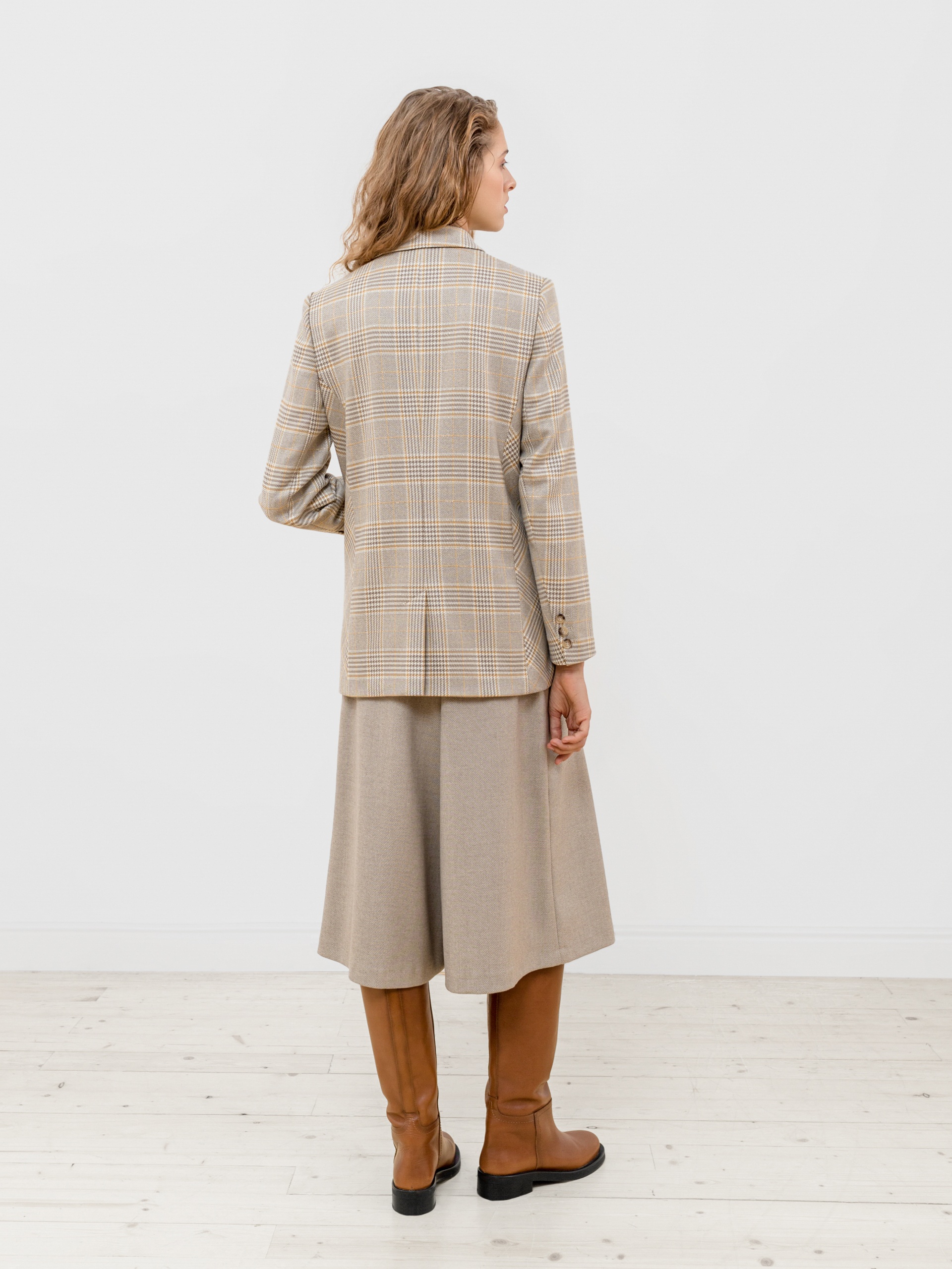 Стильный двубортный жакет прямого удлиненного силуэта из костюмной ткани в клетку бежевого цвета. Воротник английский, рукав втачной полной длины с пуговицами. Застежка спереди на две крупные пуговицы. Жакет идеально сочетается с брюками из этой же ткани.