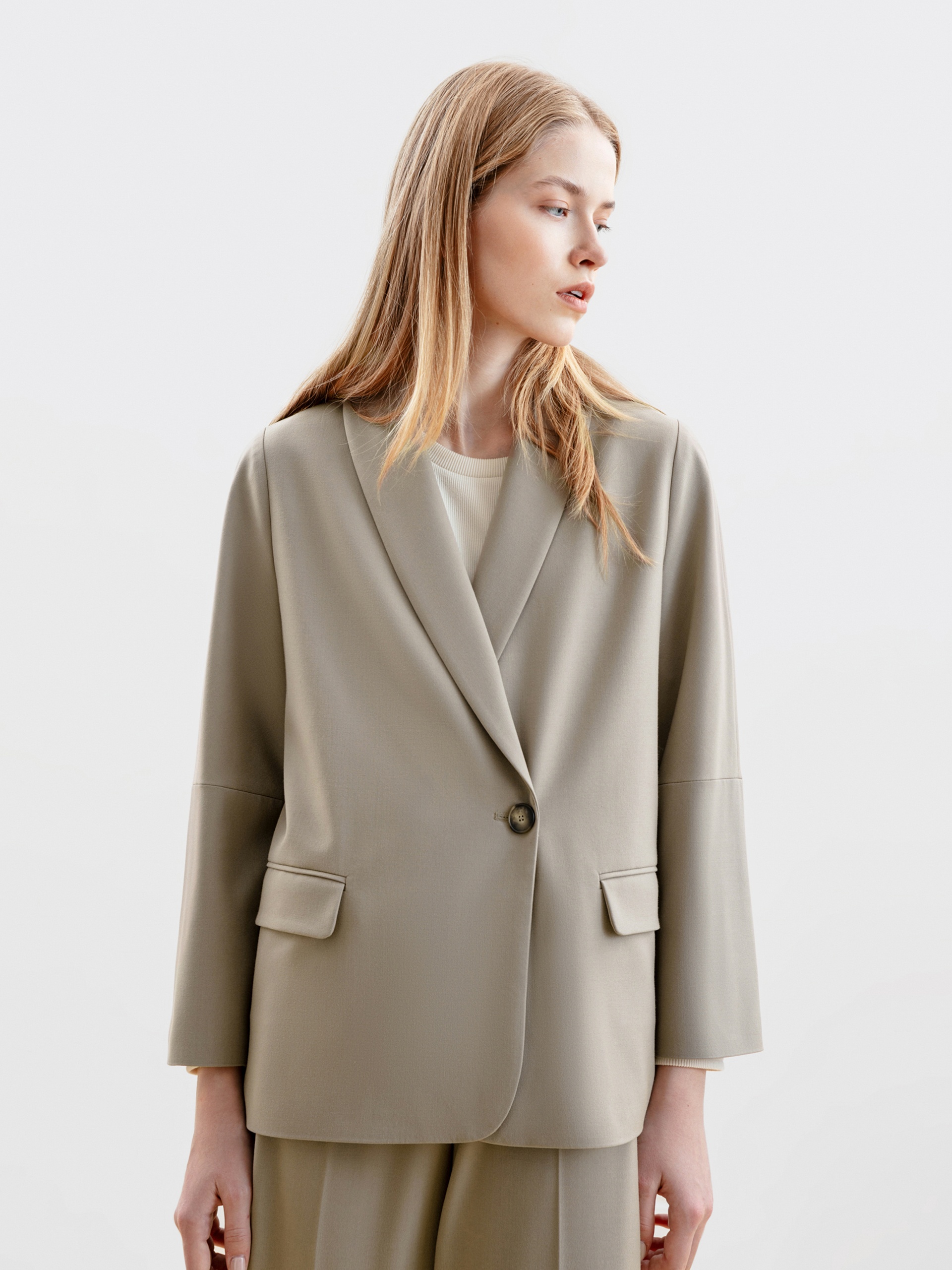 Свободный однобортный жакет прямого силуэта на подкладке из костюмной ткани с V-образным вырезом горловины, воротником -шалька, спущенным плечом и укороченным рукавом. Спереди застежка на одну пуговицу и прорезные карманы с клапанами.