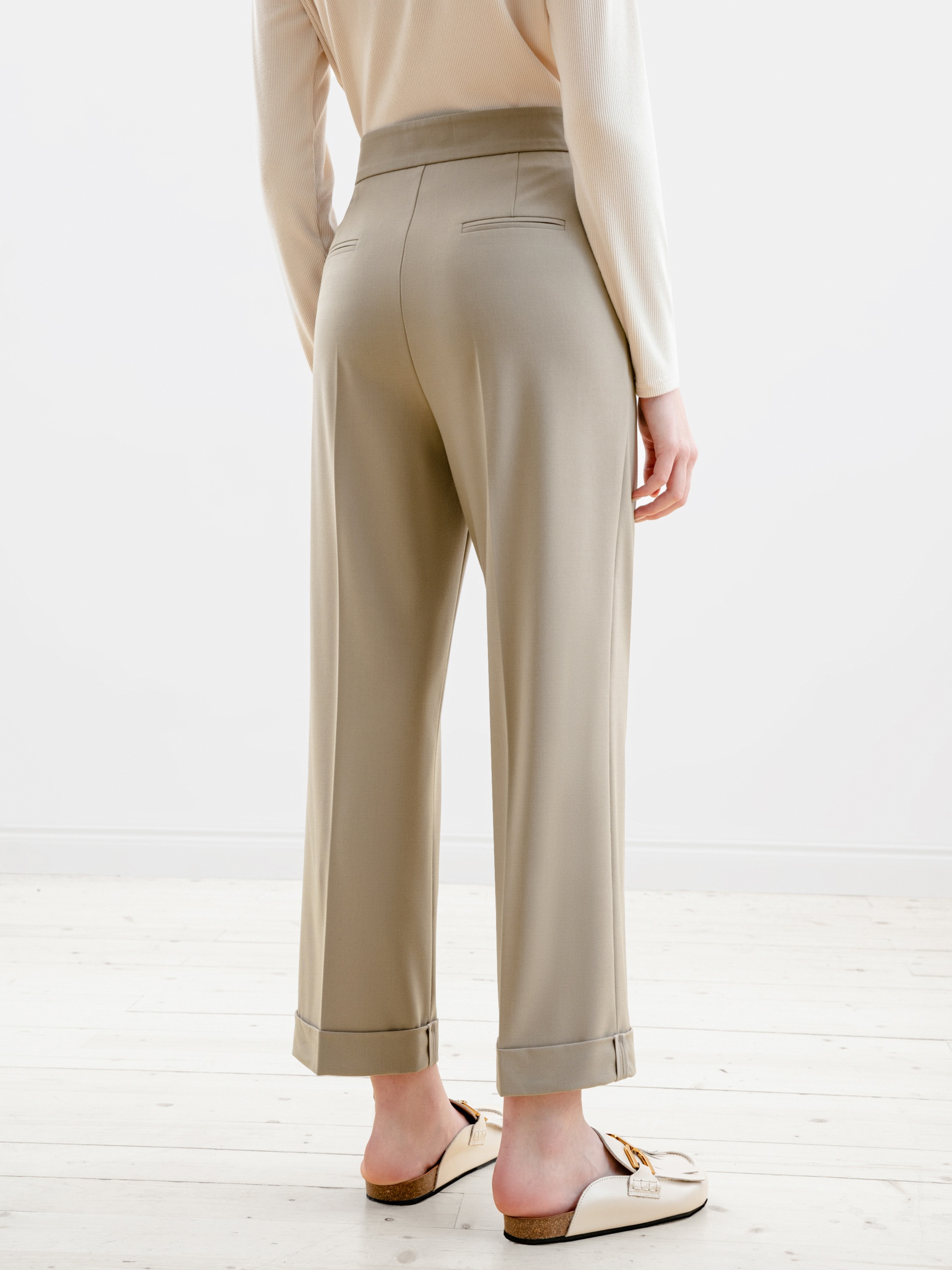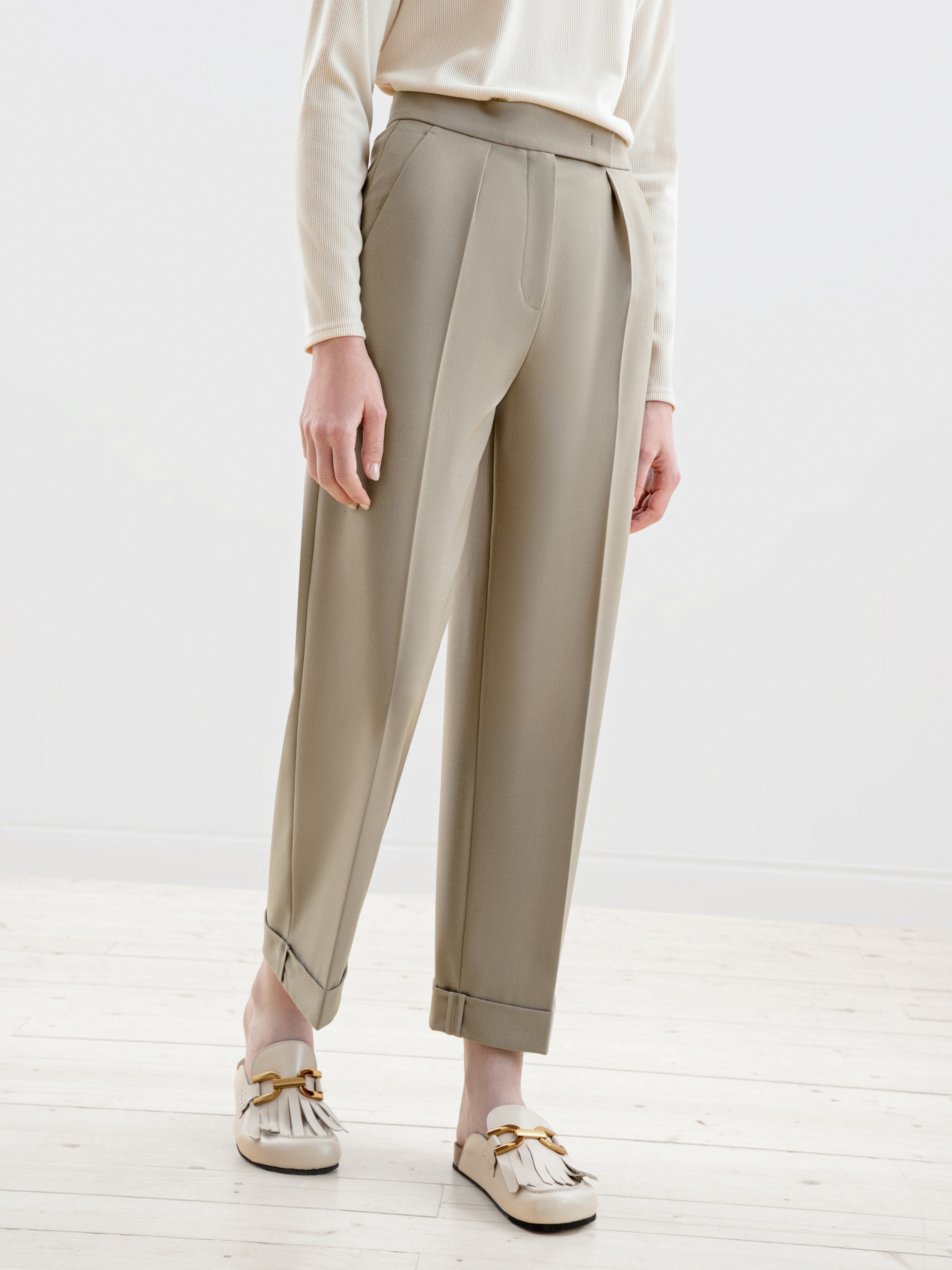 Классические брюки со стрелками из костюмной ткани прямого силуэта на притачном поясе с шлевками, рабочий карманами по бокам и отворотами по низу. Застежка спереди на молнию и крючок. Эта модель идеально сочетается с жакетом из этой же ткани.