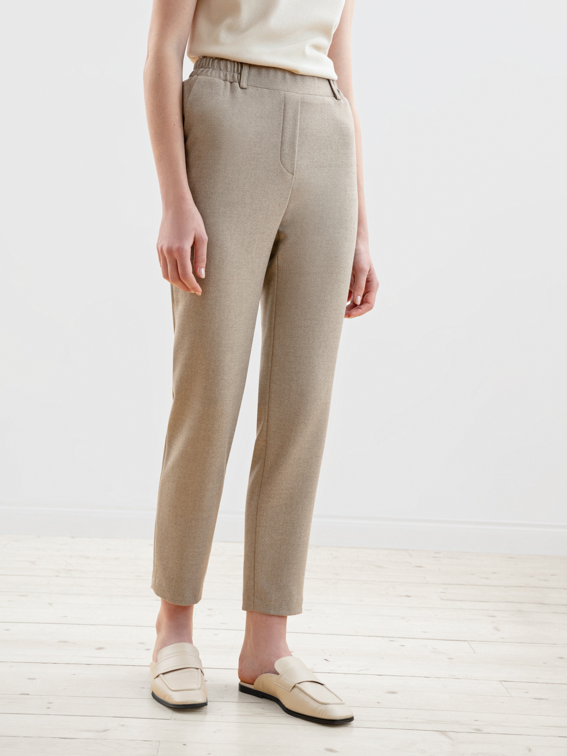 Брюки из костюмной ткани зауженного к низу силуэта на притачном поясе с шлевками и рабочими карманами по бокам. Застежка спереди на молнию и крючок. Модель идеально подойдёт для создания классических образов с мягкими трикотажными джемперами.
