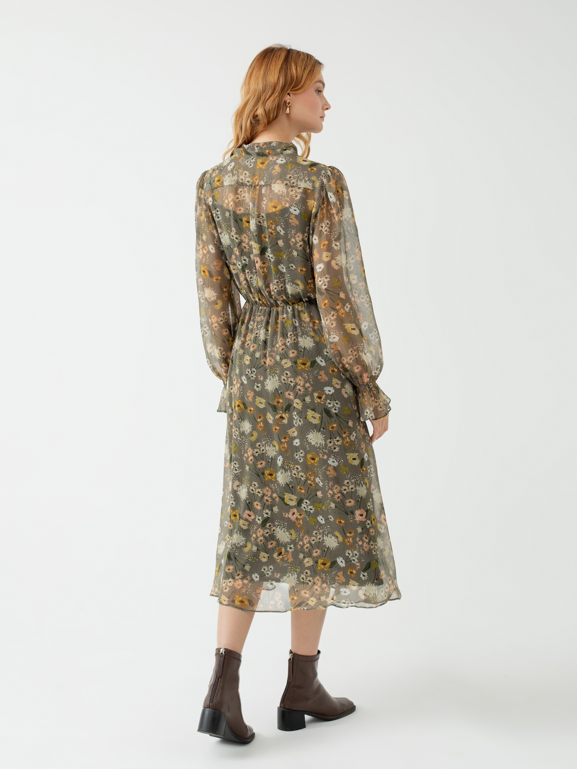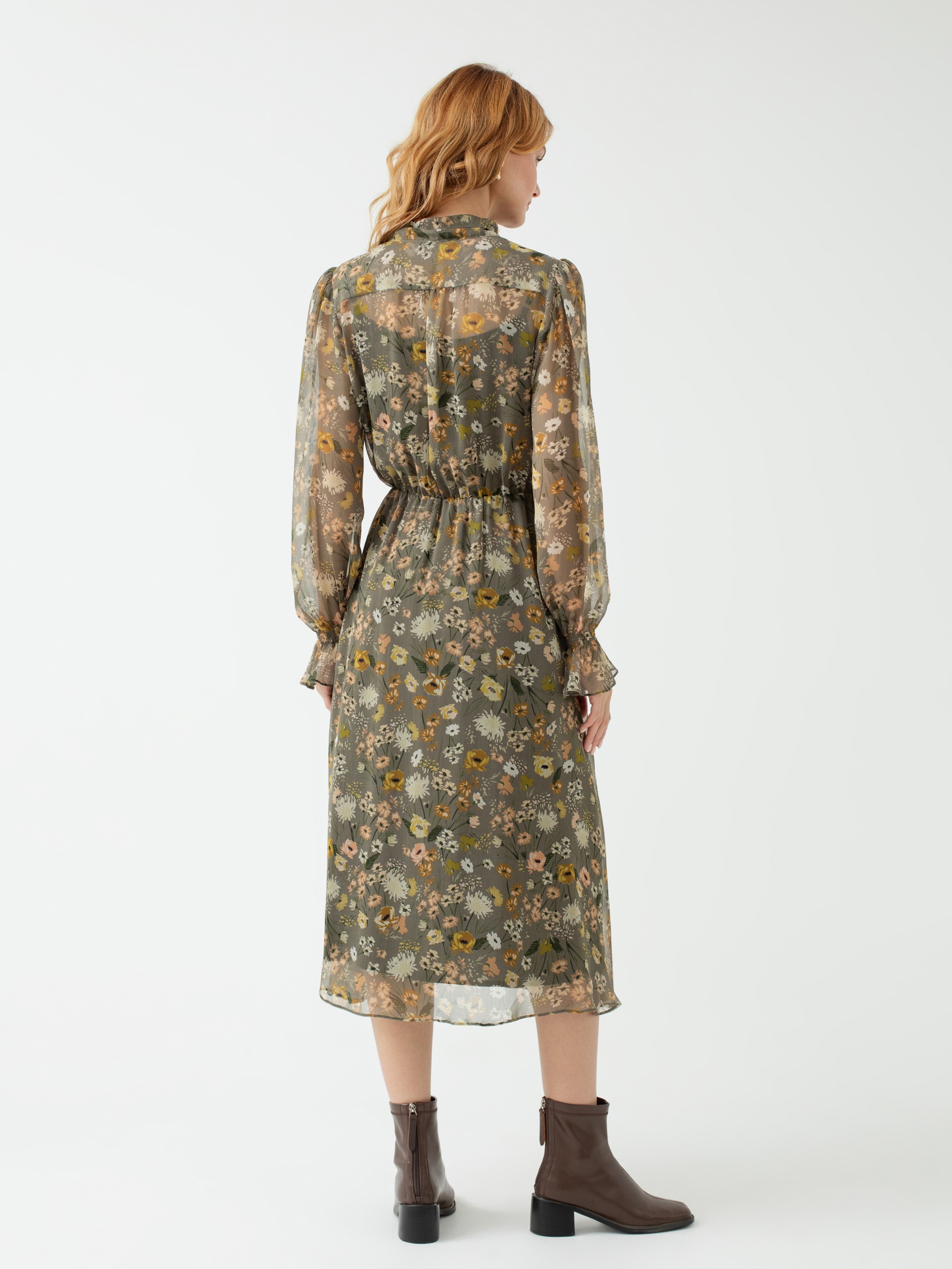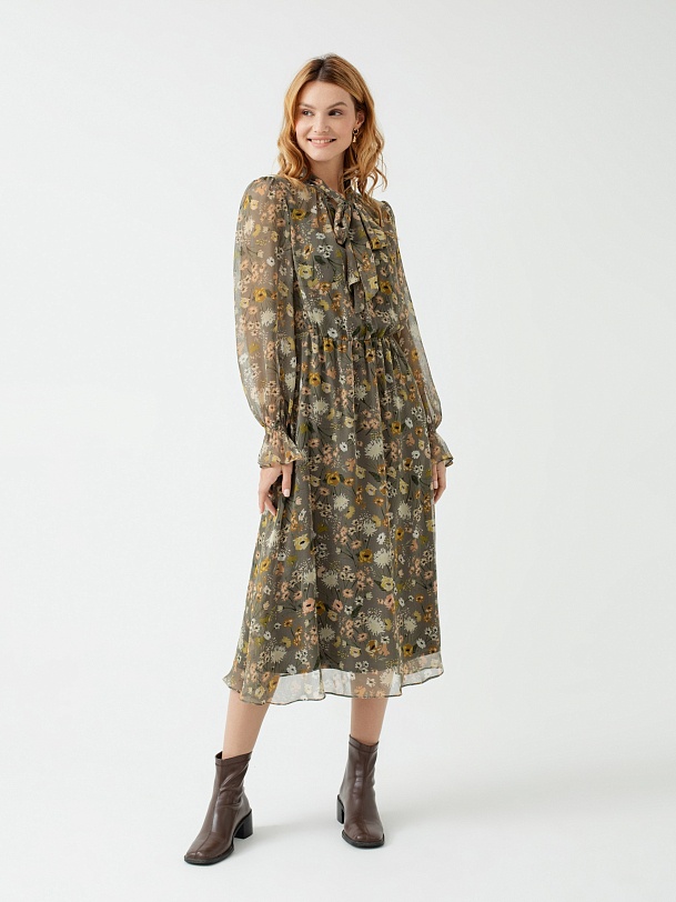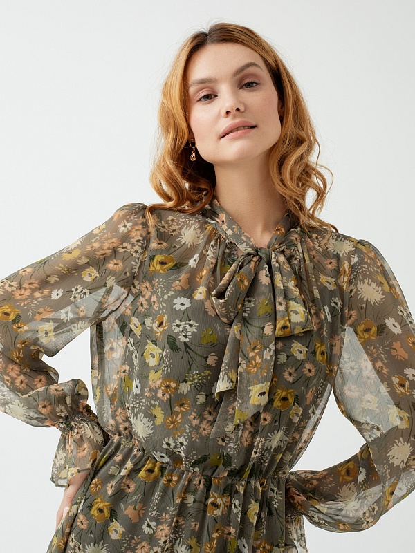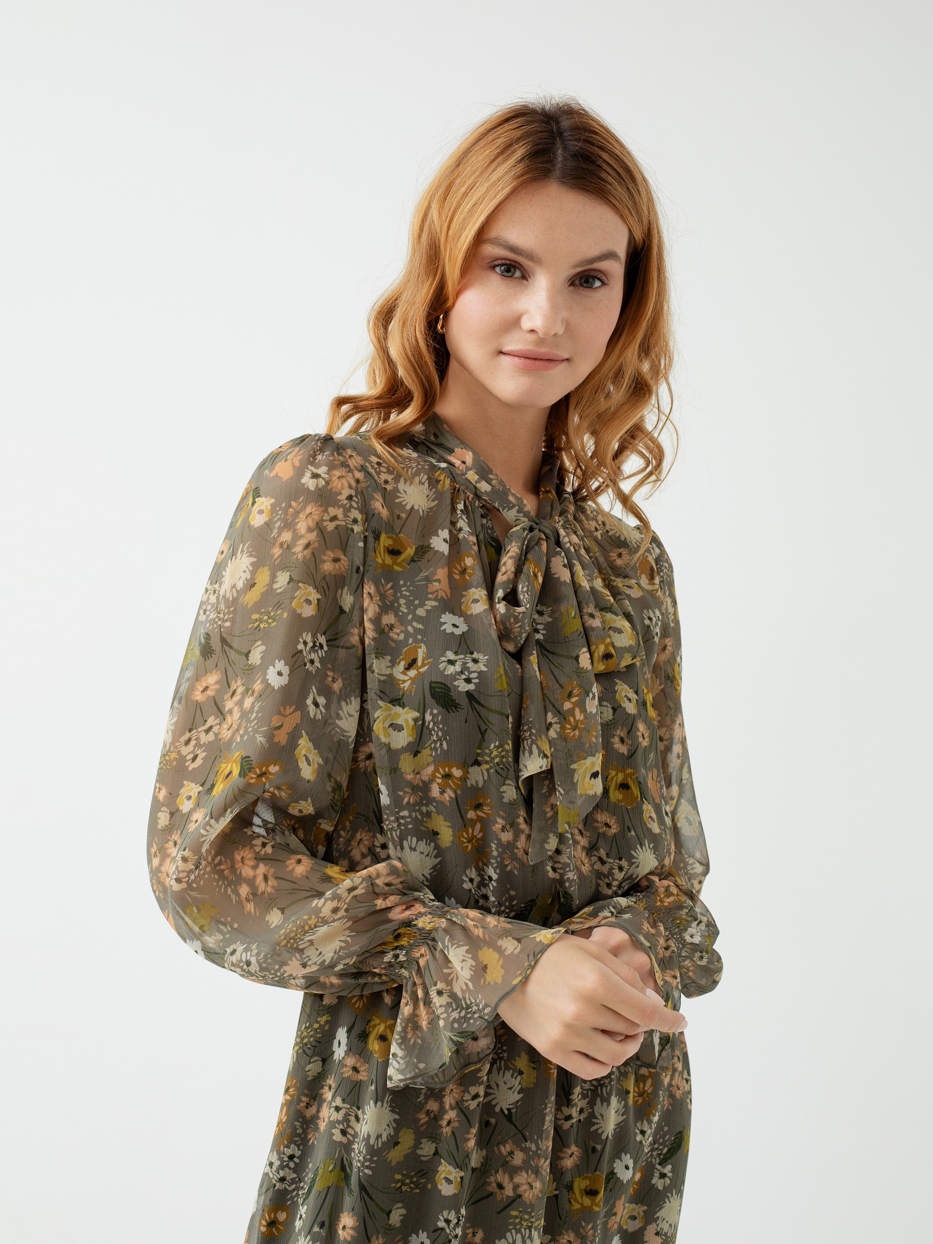 Женственное платье длины макси из плиссированного шифона в цветочном принте приталенного силуэта с воротником стойка, преходящим в бант и втачным рукавом полной длины. На талии резинка, юбка летящая, А-силуэта. По низу рукавов сборка на тонкую резинку и манжета - волан. К комплект входит нижнее платье на бретелях из непрозрачной подкладочной ткани.