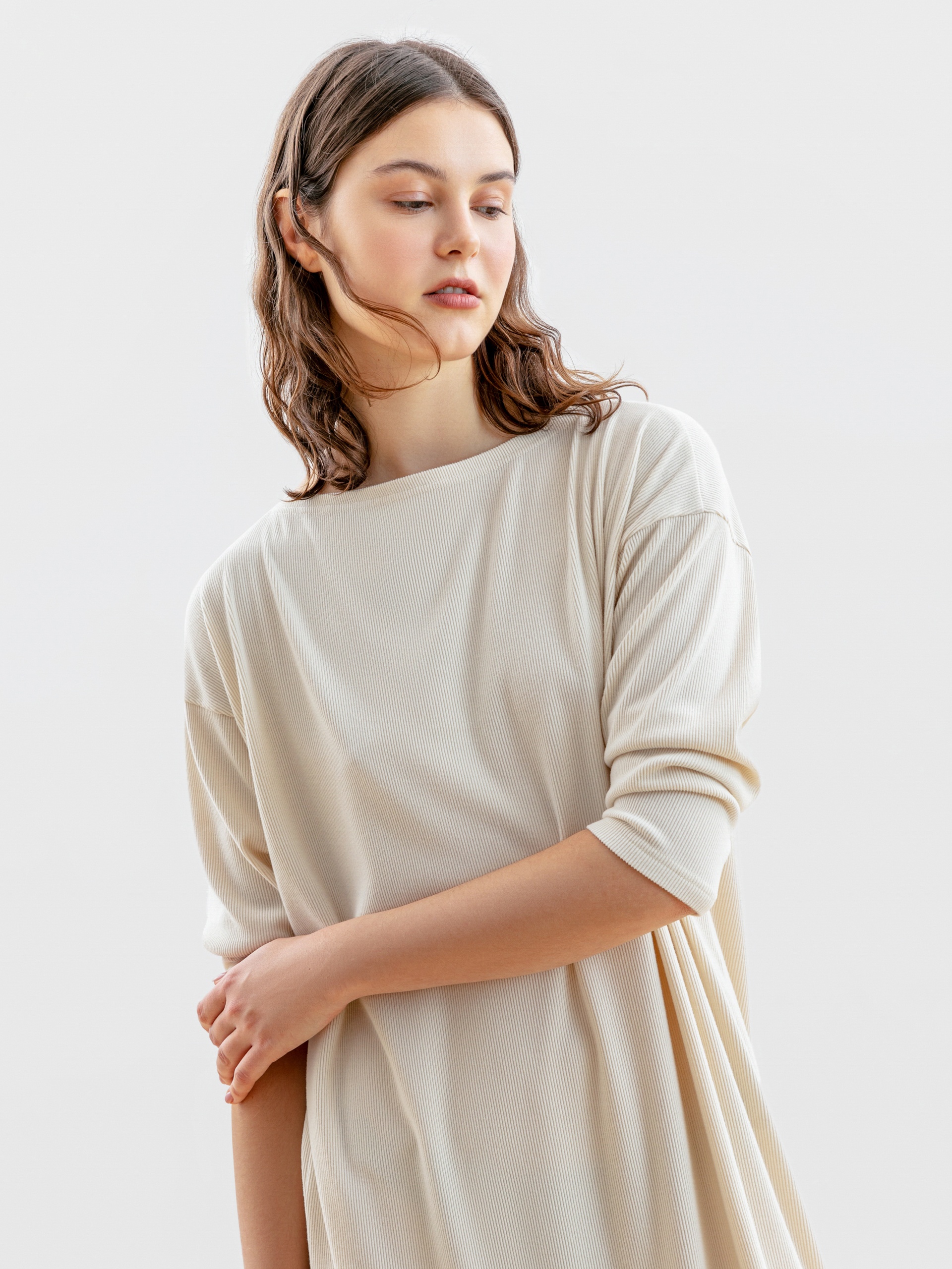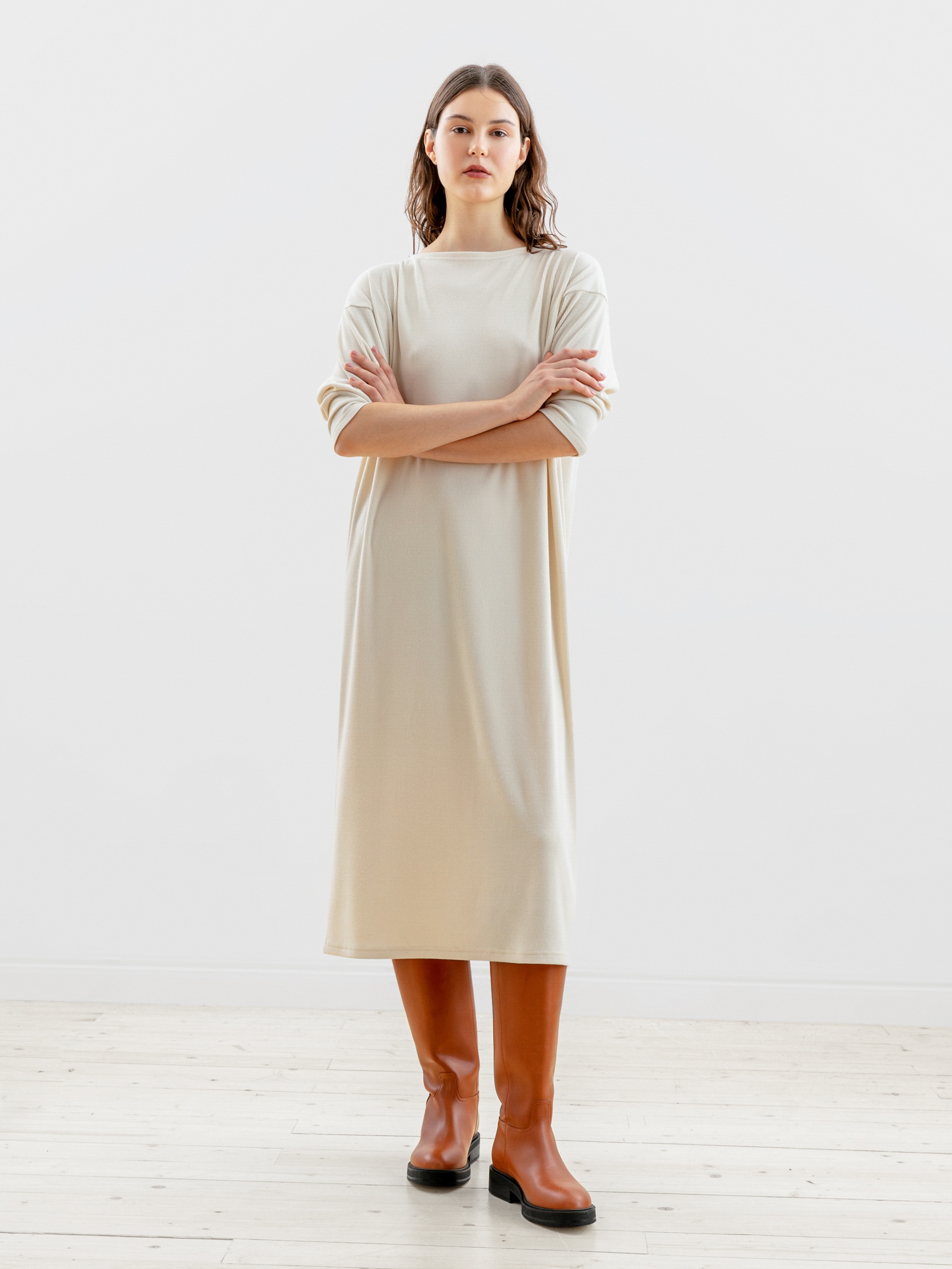 Платье длины макси из тонкого фактурного трикотажа свободного прямого силуэта с горловиной лодочка, спущенным плечом и рукавом полной длины.