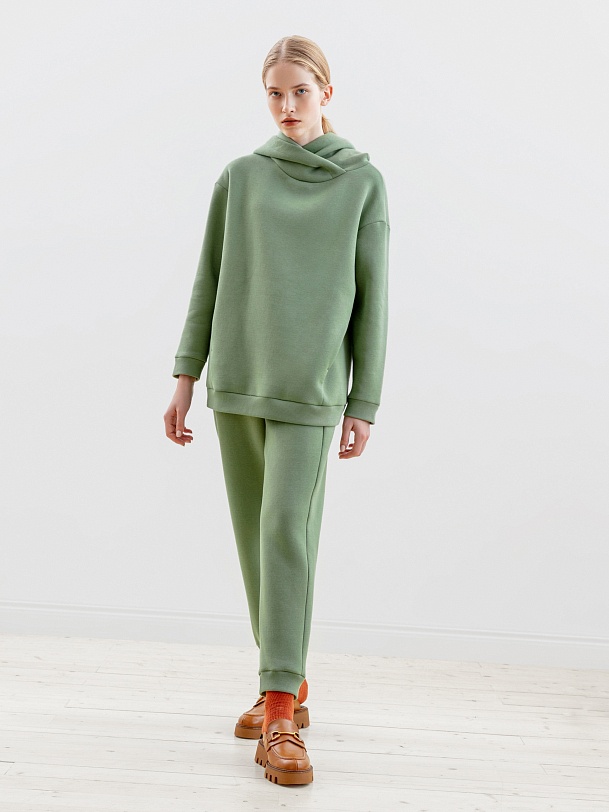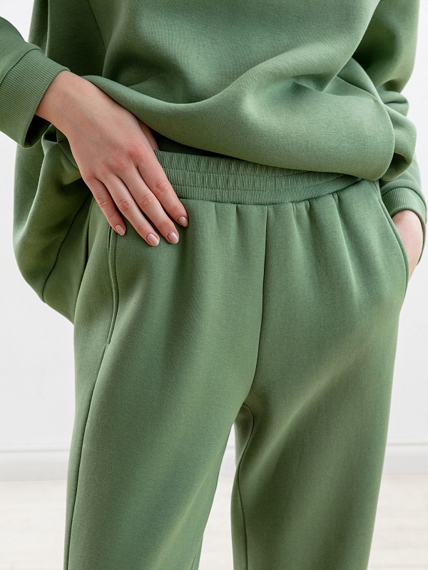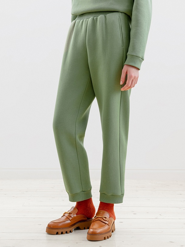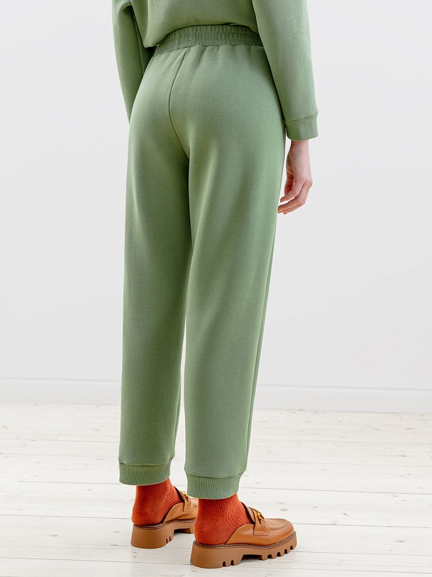 Спортивные брюки-джоггеры полуприлегающего силуэта из футера, на притачном поясе с резинками, потайными карманами и манжетами из резинки по низу изделия. Модель идеально сочетается с джемпером из этого же материала.