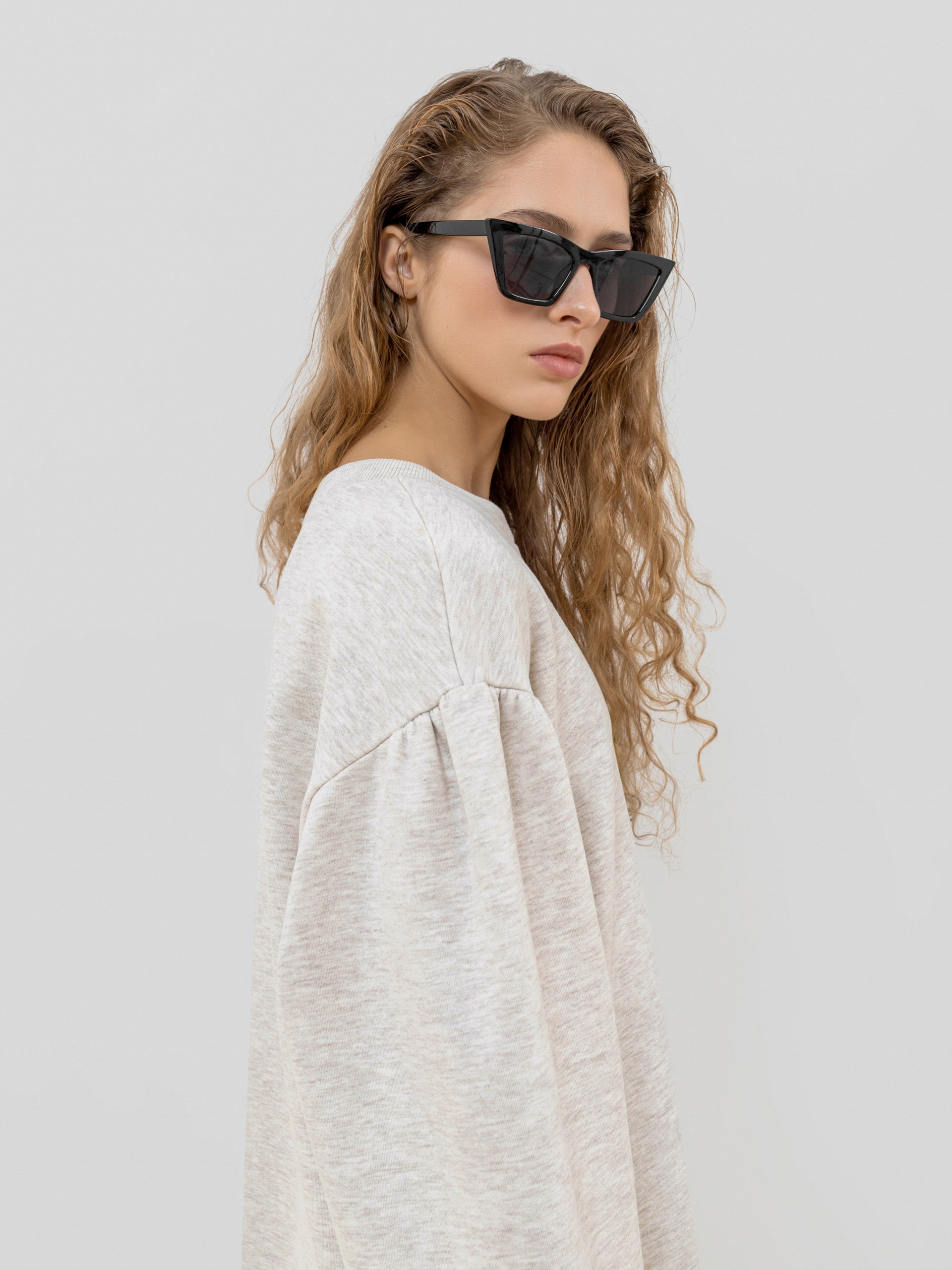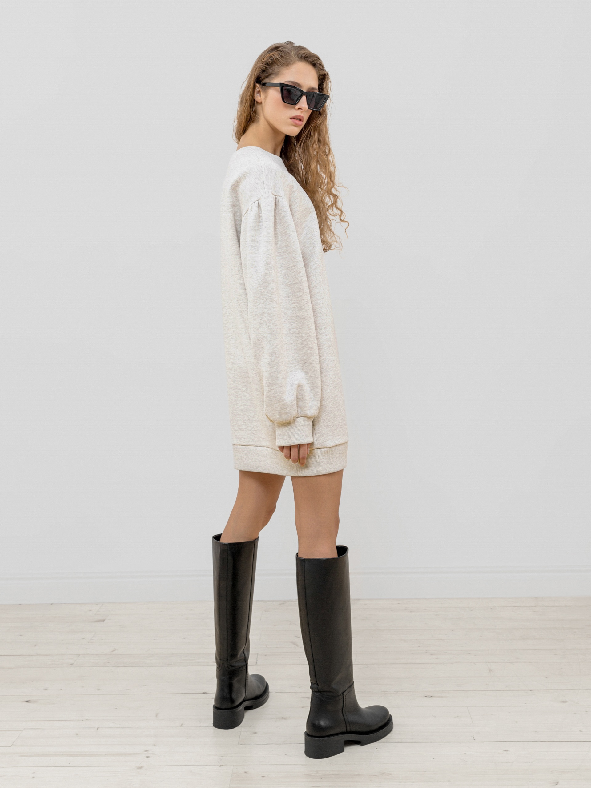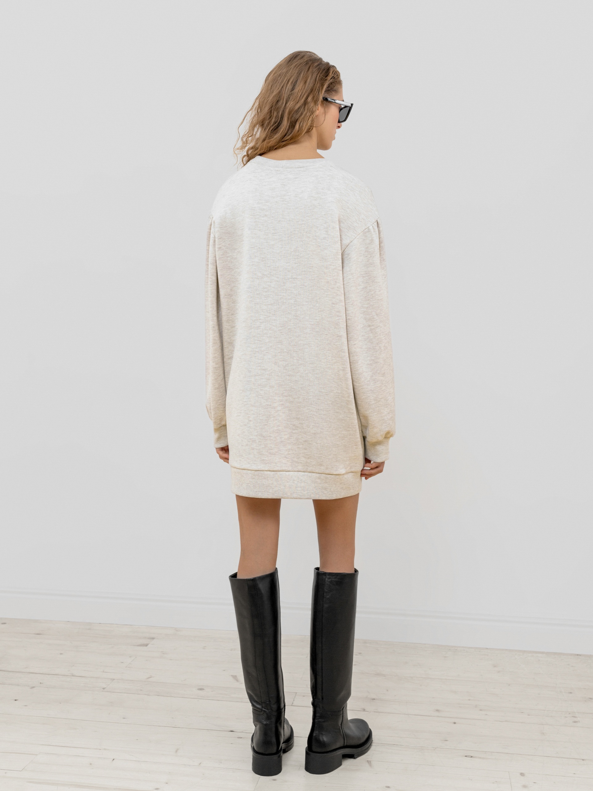 Платье в спортивном стиле прямого силуэта из меланжевого трикотажного полотна с круглой горловиной, спущенным плечом и втачным рукавом с небольшой сборкой по окату. Манжеты и низ изделия обработаны резинкой.
