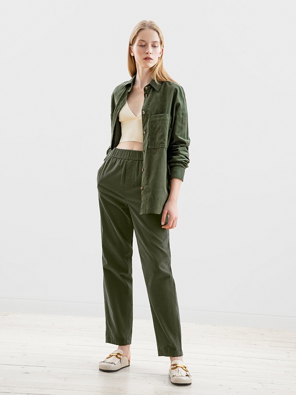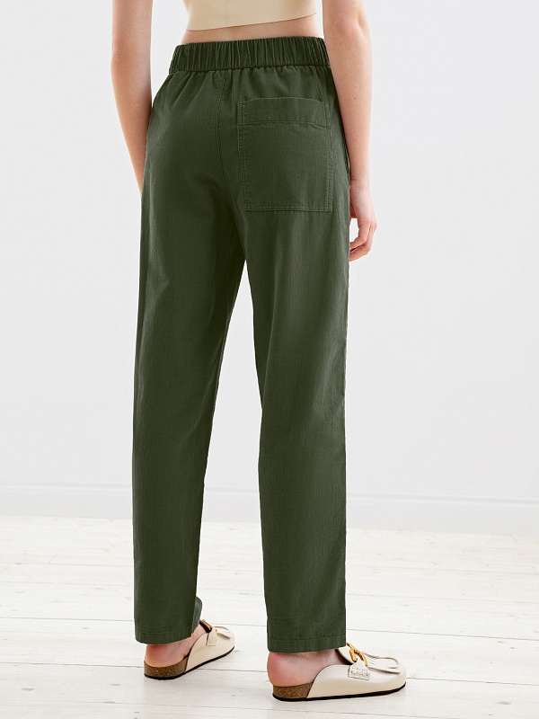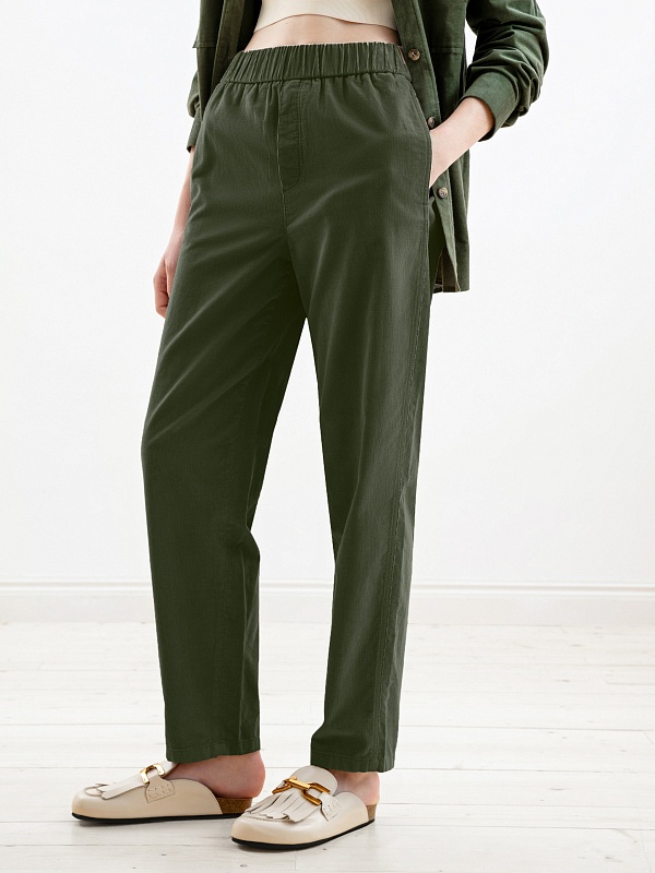 Прямые брюки из микровельвета цвета хаки на притачном поясе с резинкой и имитацией гульфика. Рабочие карманы в боковых швах и один накладной карман на спинке. Модель идеально подходит для создания стильных и комфортных осенних образов.