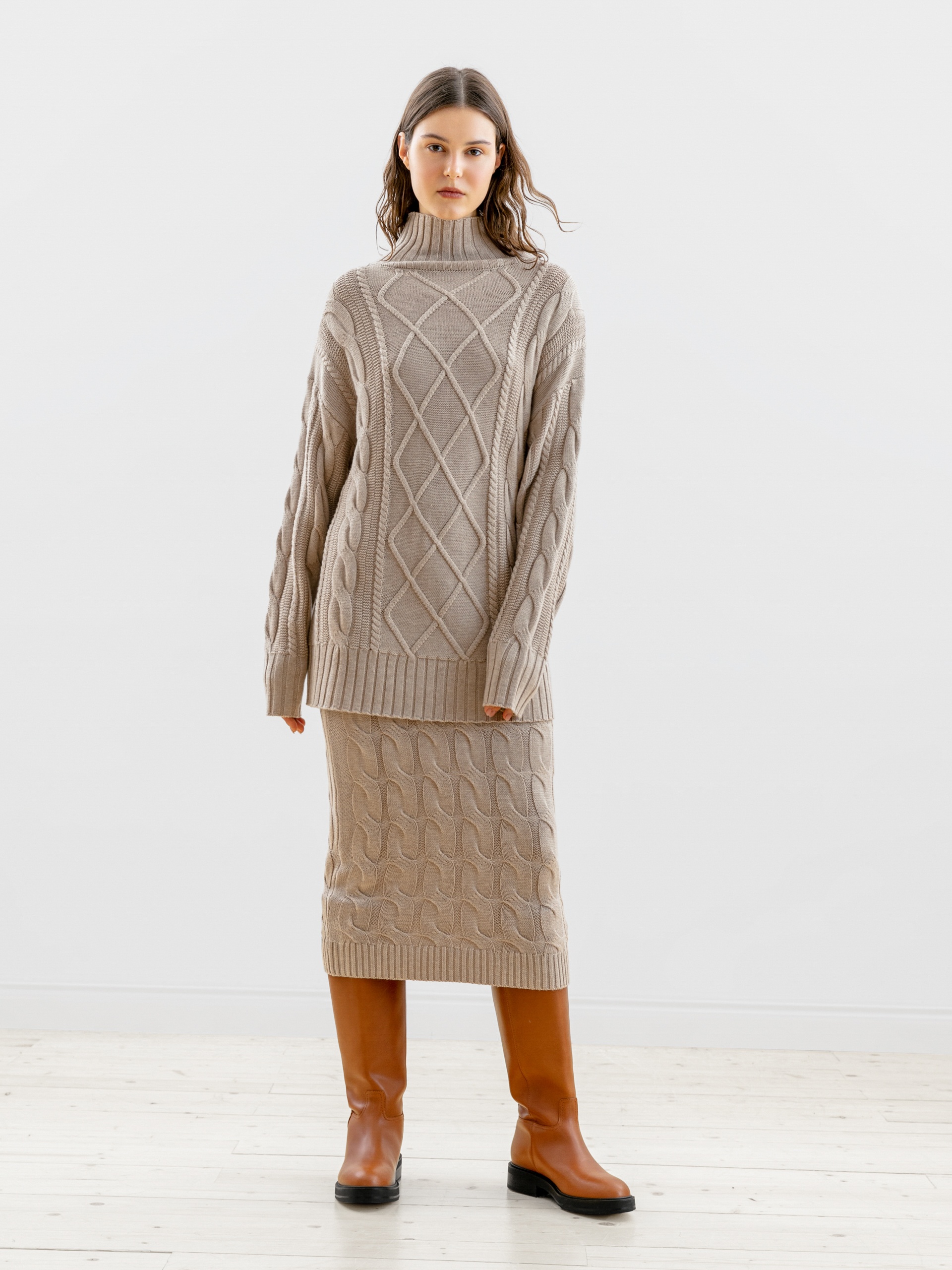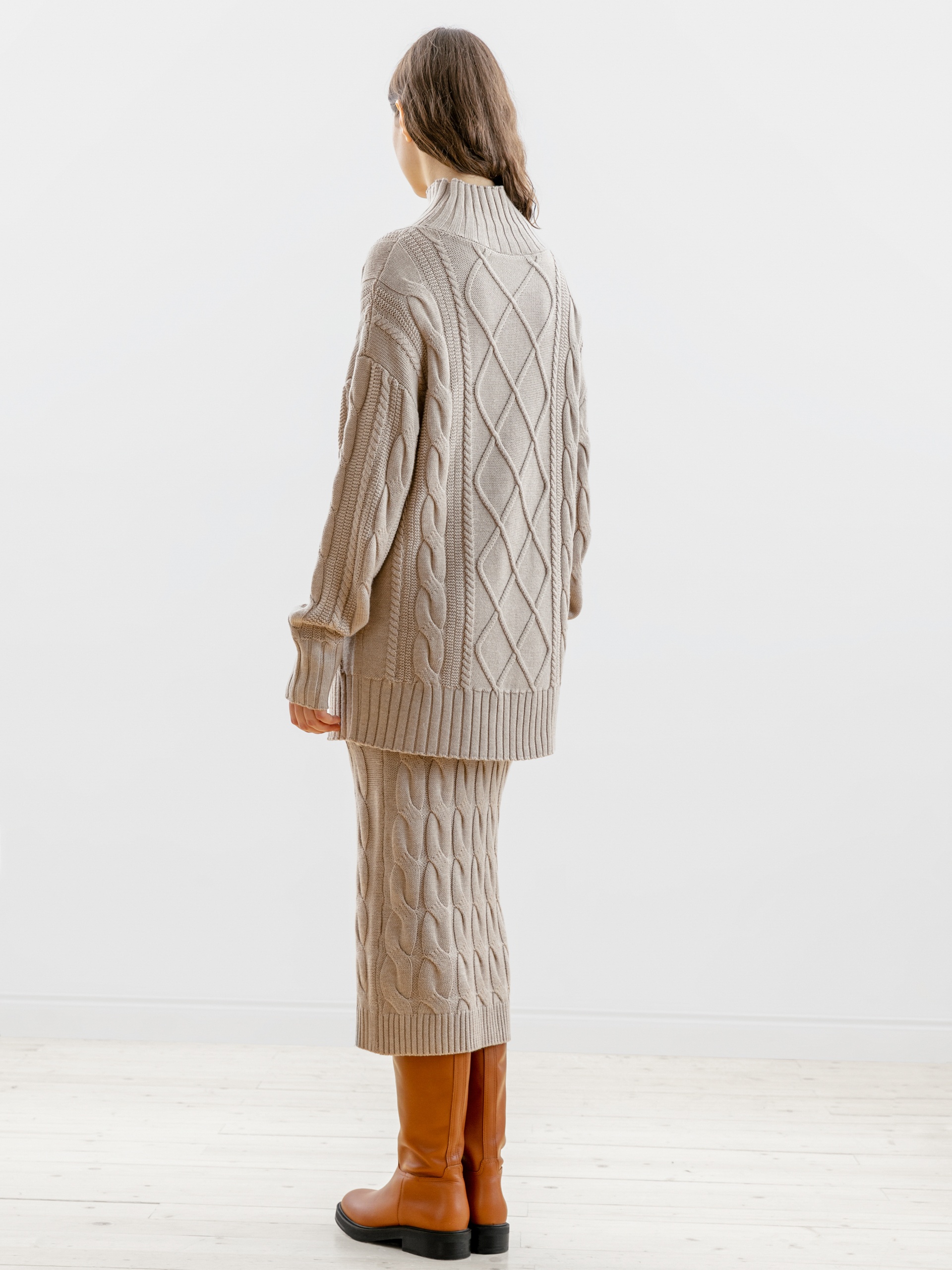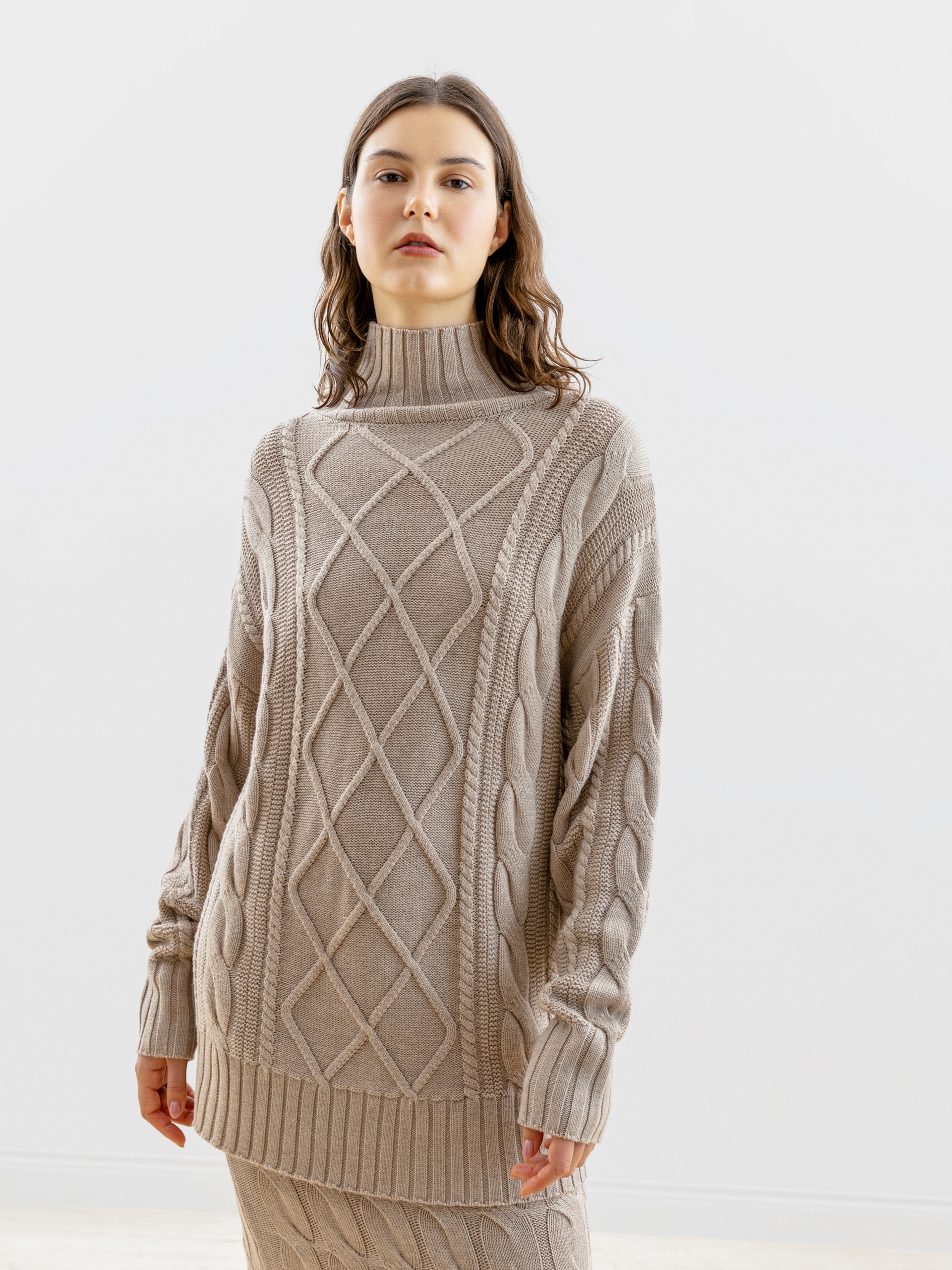 Уютный вязаный джемпер с косами в стиле оверсайз с мягким воротником-стойка, спущенным плечом и рукавом полной длины. По низу изделия и рукавов - мягкие резинки. Модель идеально сочетается с узкими и широкими брюками из костюмной ткани.