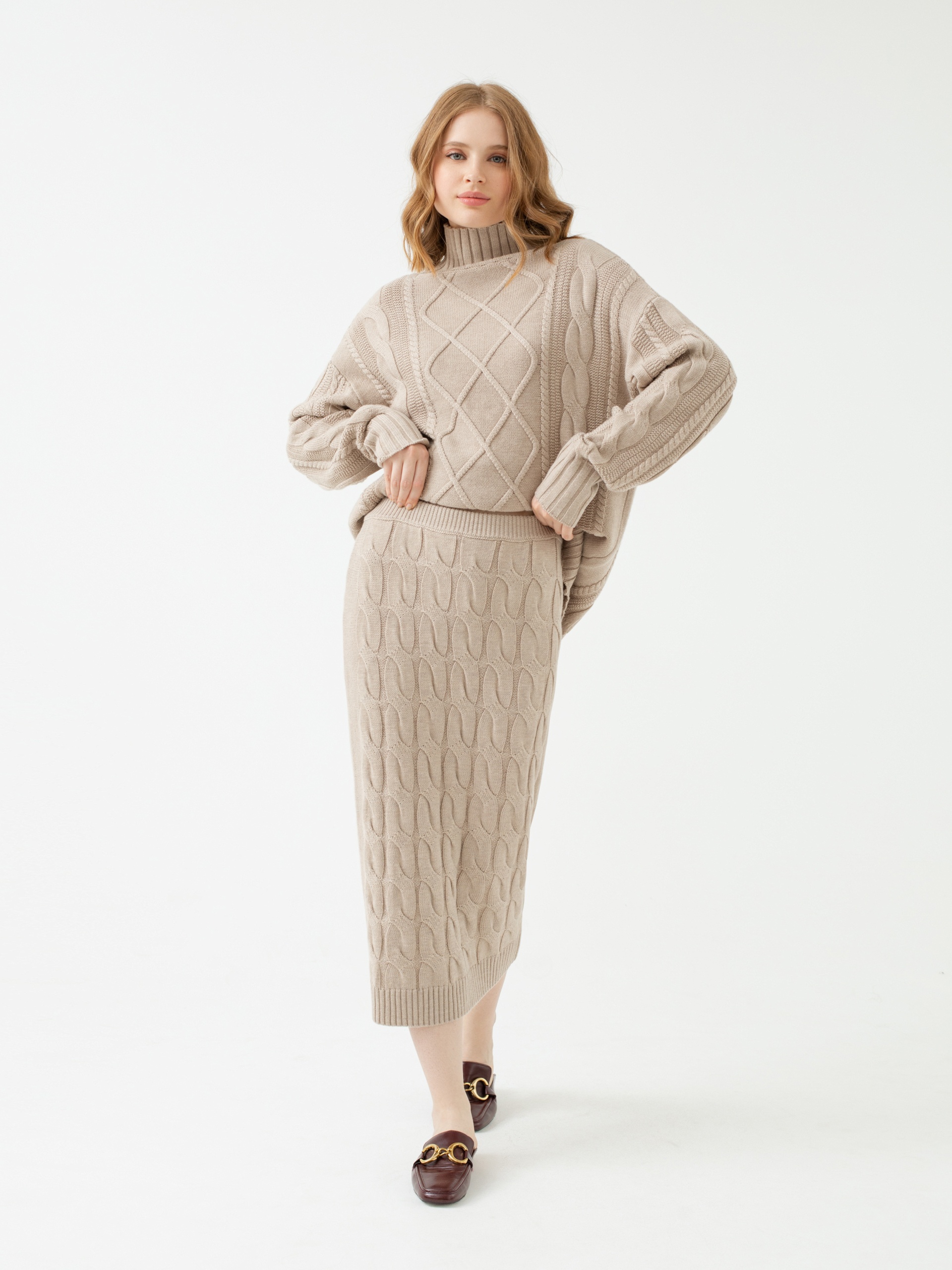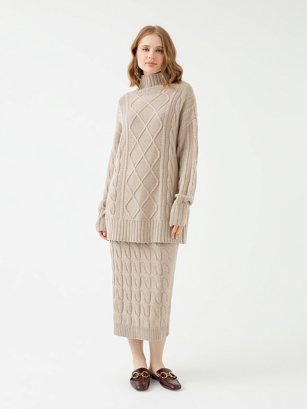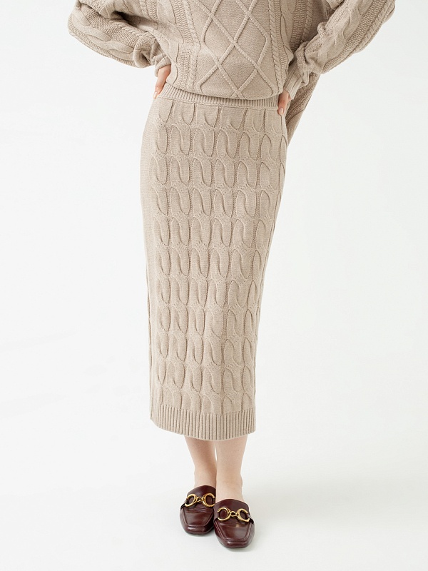 Трендовая юбка из вязаного фактурного трикотажа прямого силуэта на поясе с завязками. По низу изделия мягкая резинка. Незаменимая вещь для создания стильных и комфортных городских образов.
