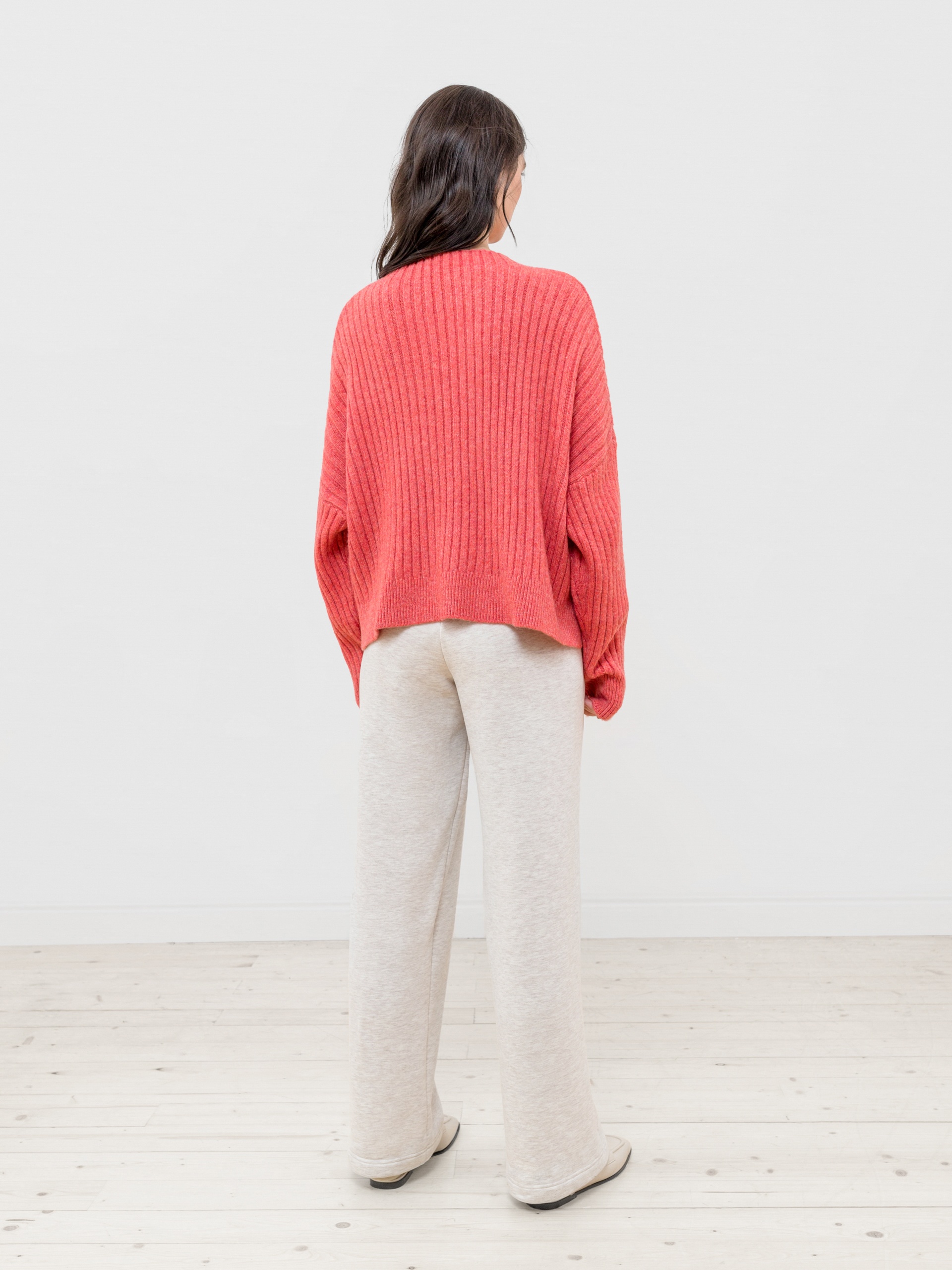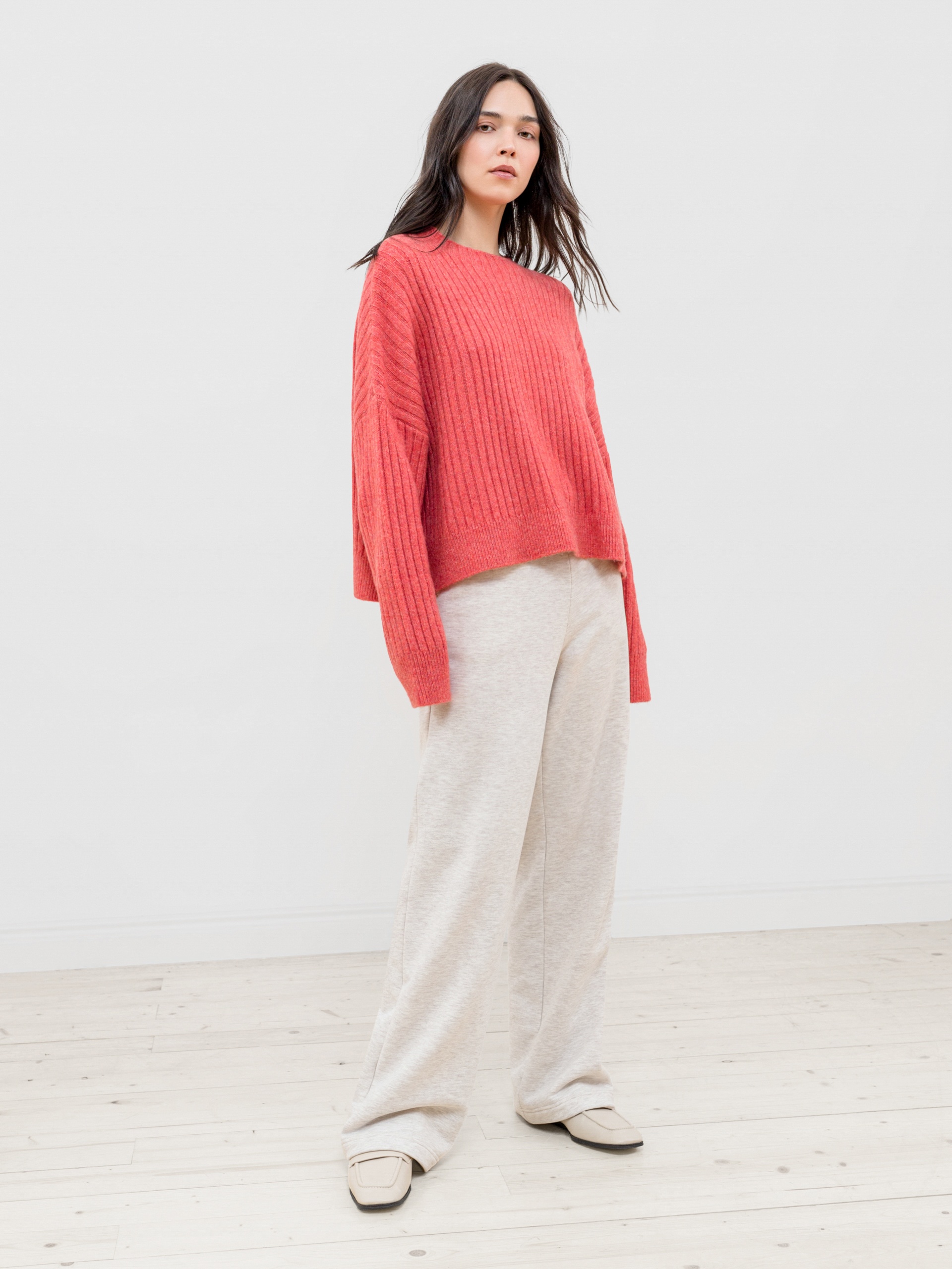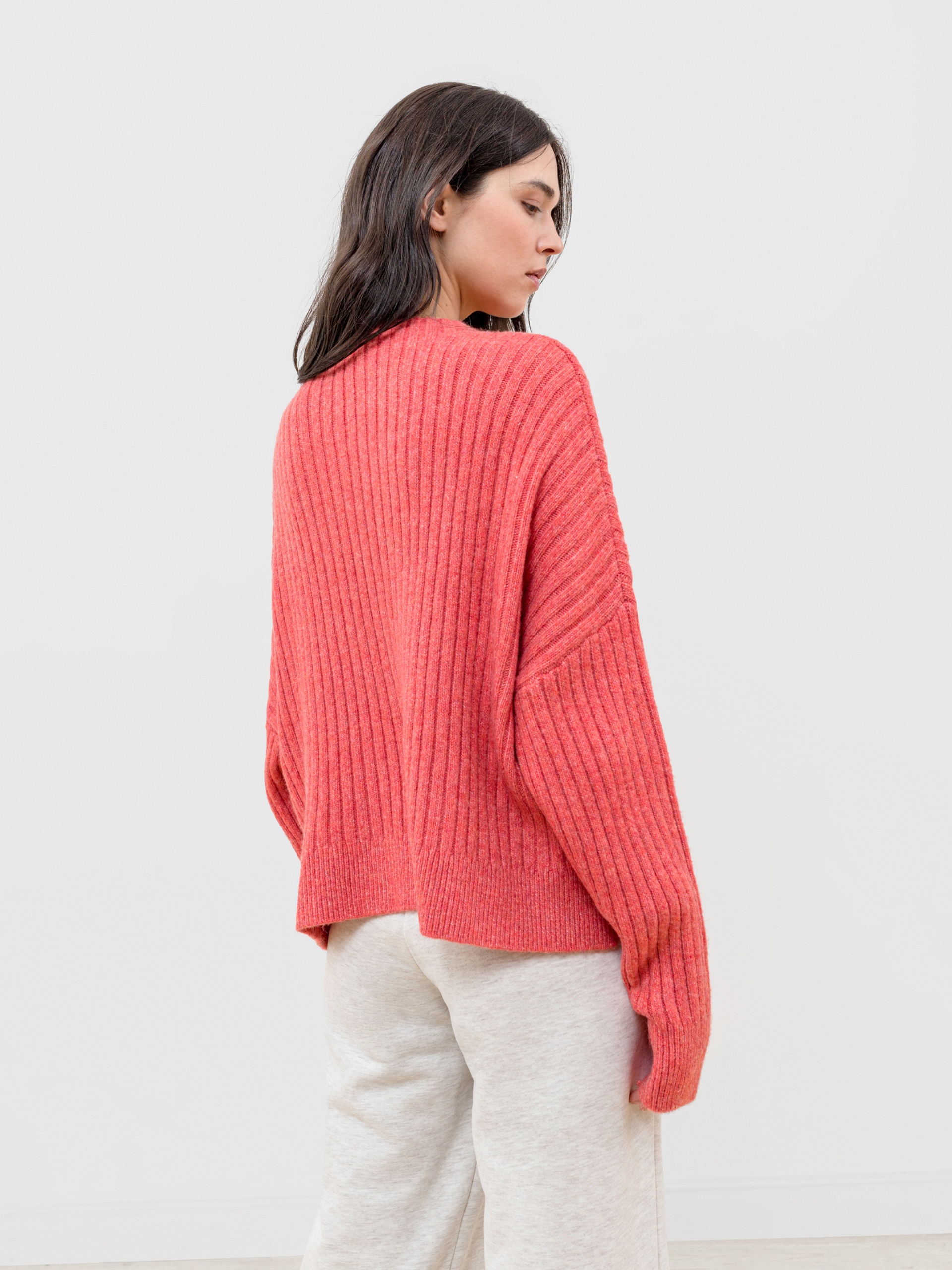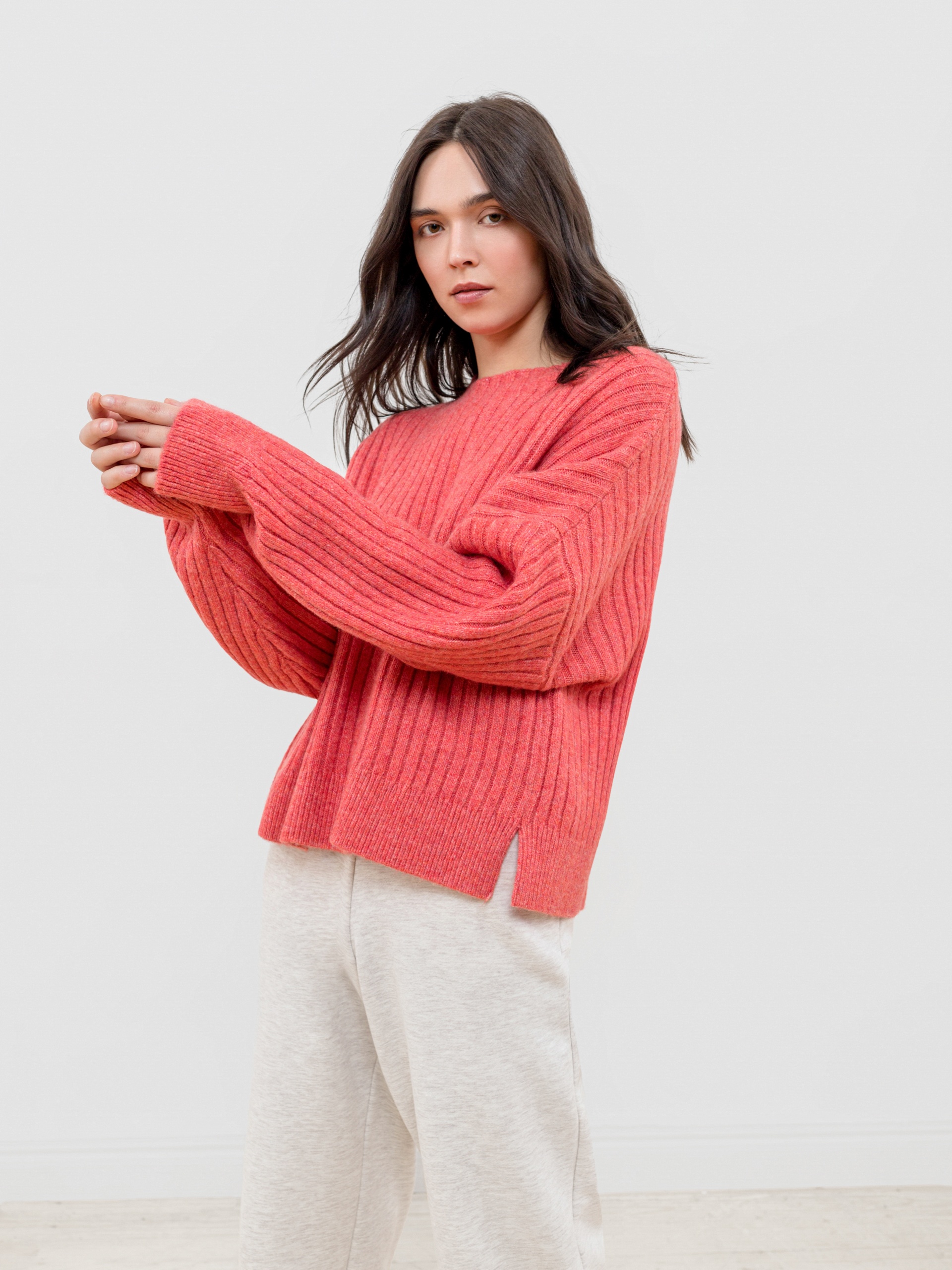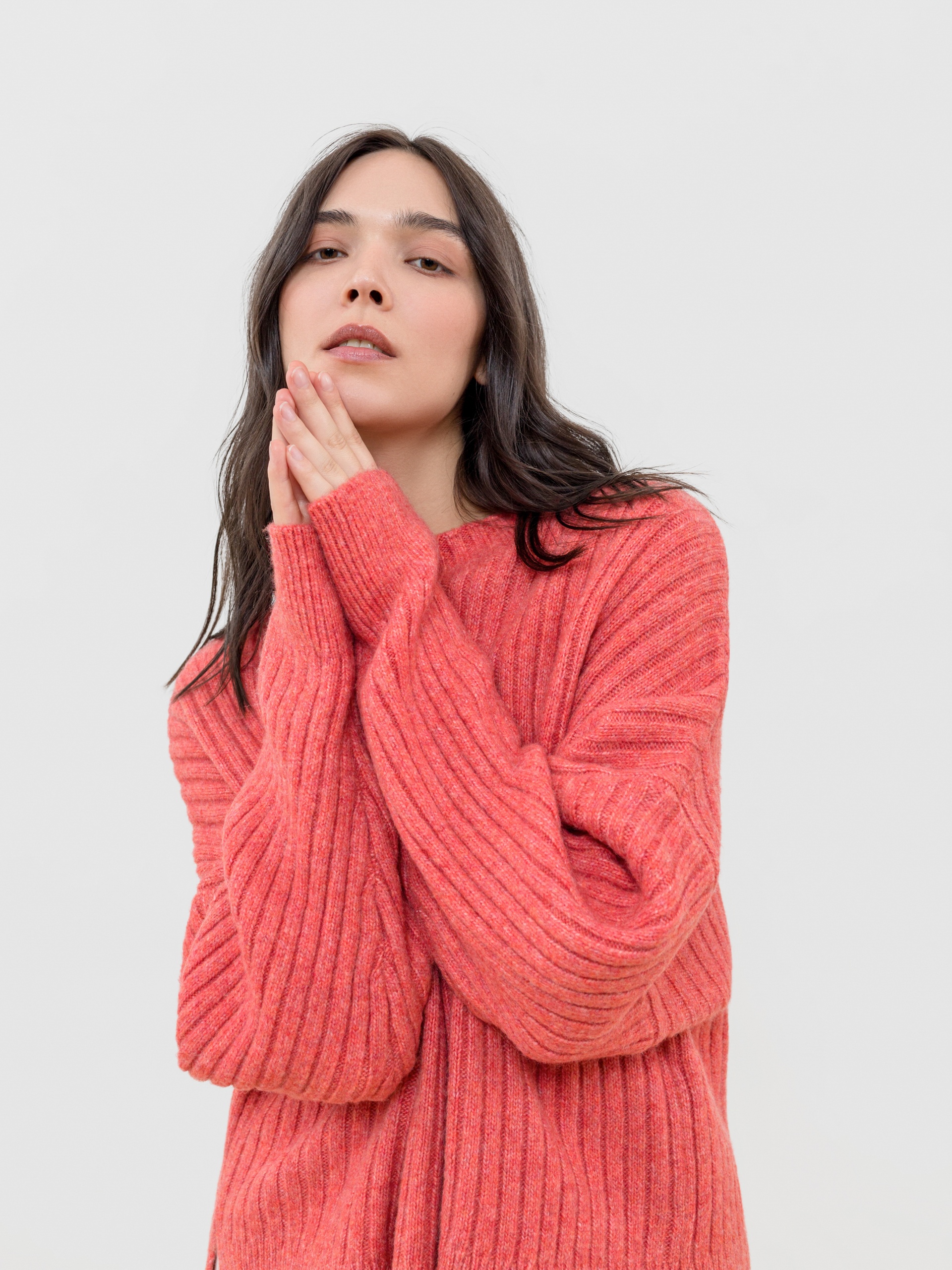 Мягкий джемпер из вязаного трикотажа свободного силуэта с воротником стойка, спущенным плечом и рукавом полной длины. Незаменимая вещь для расслабленных осенних образов.