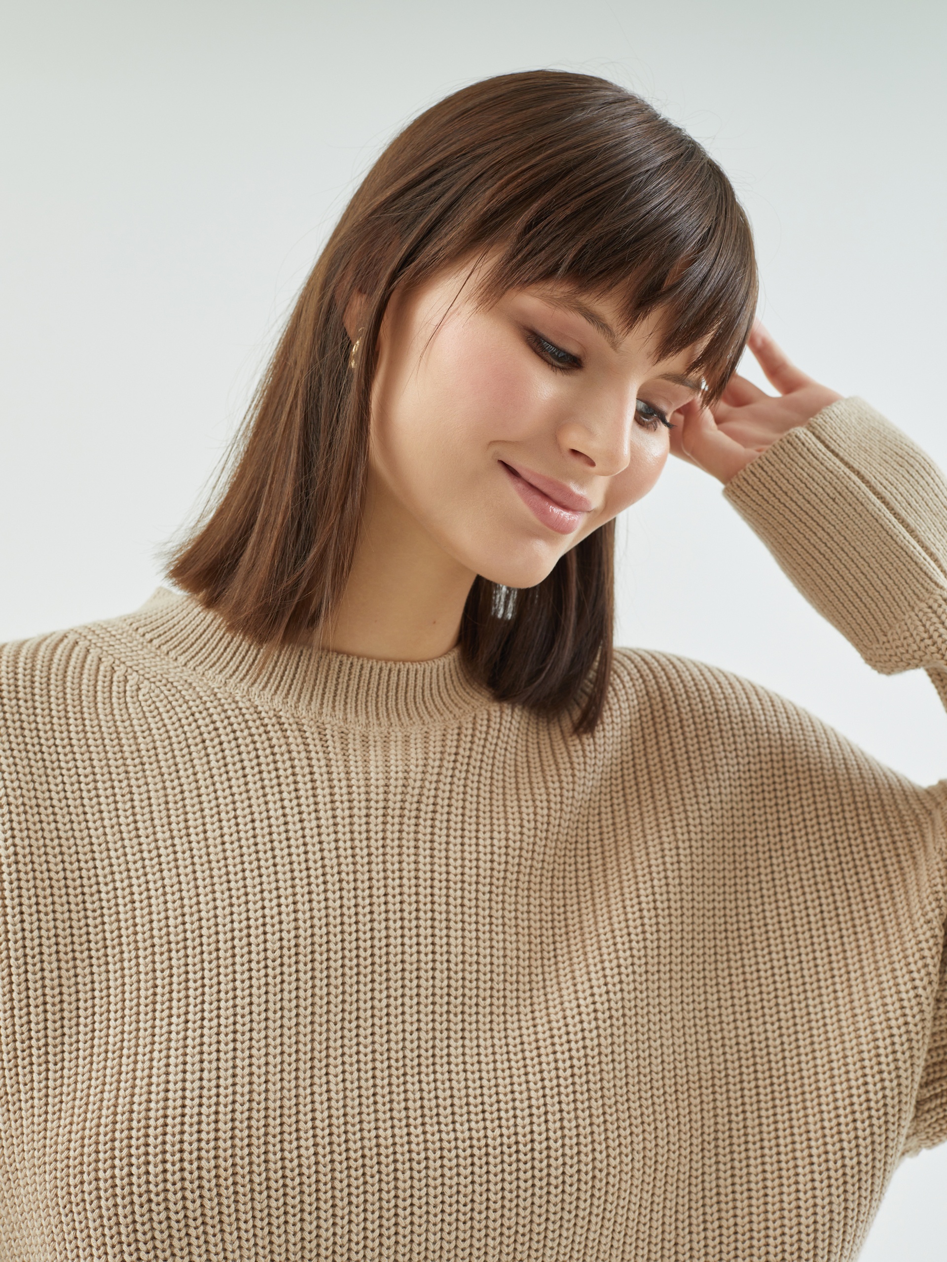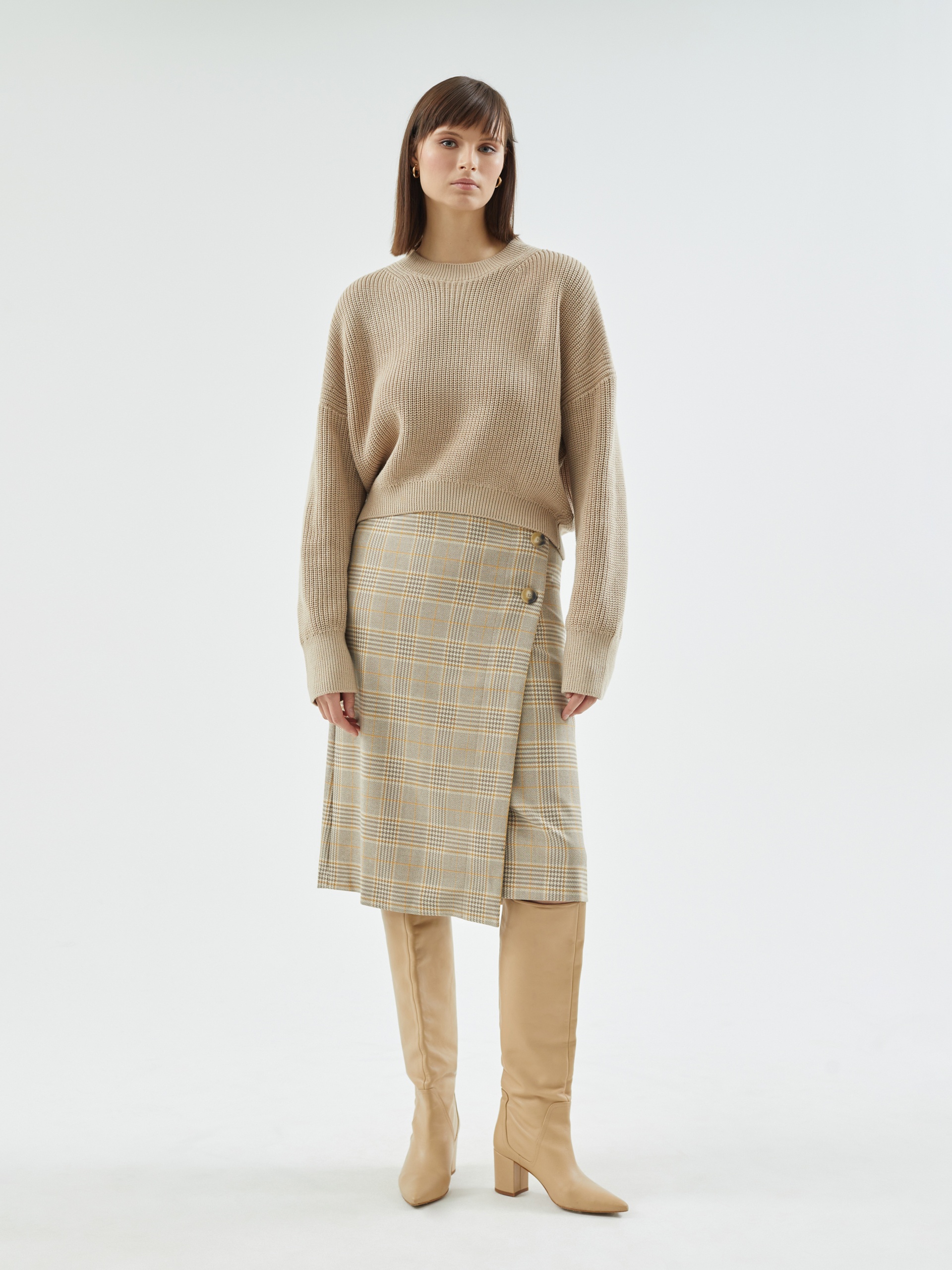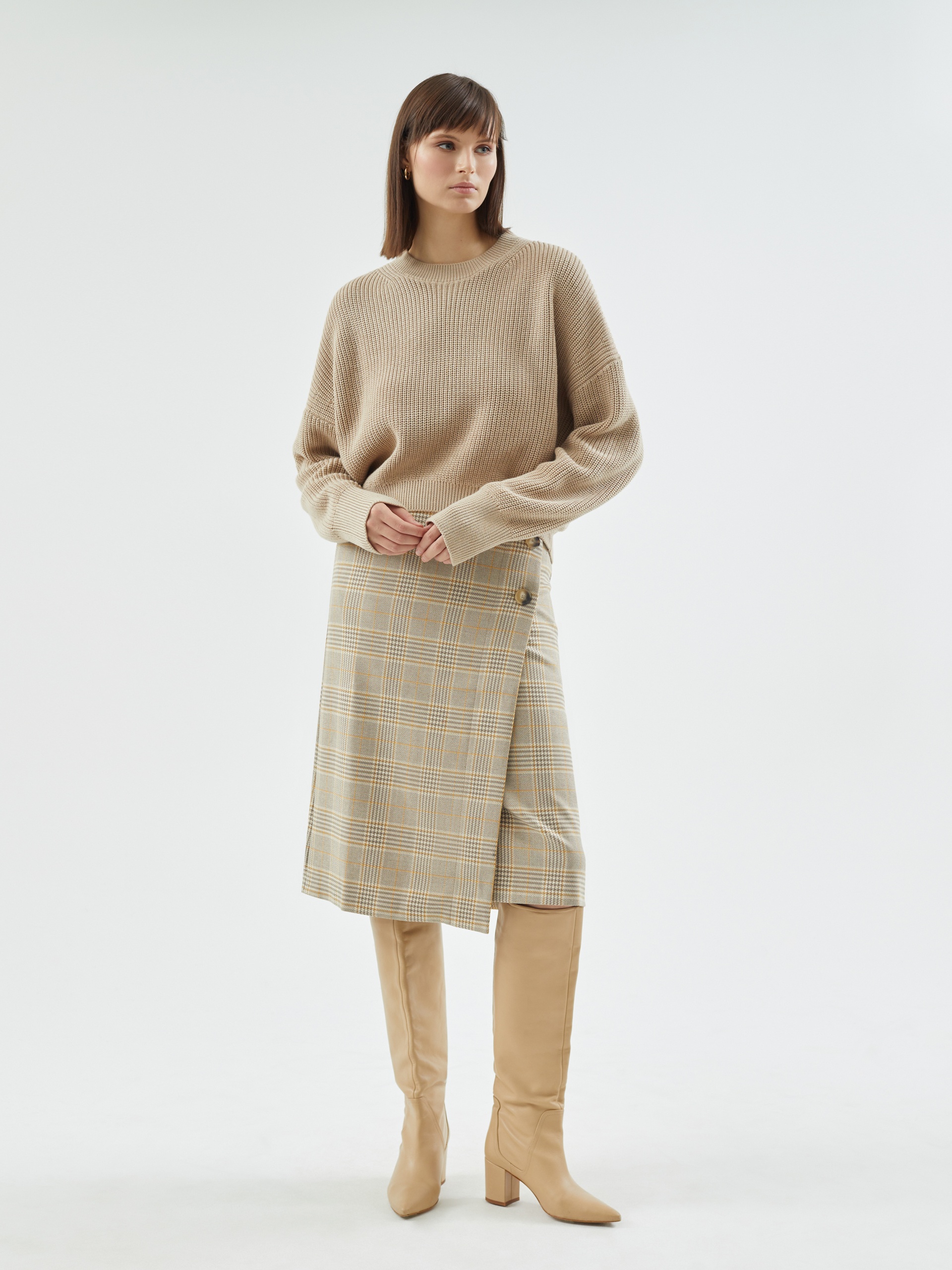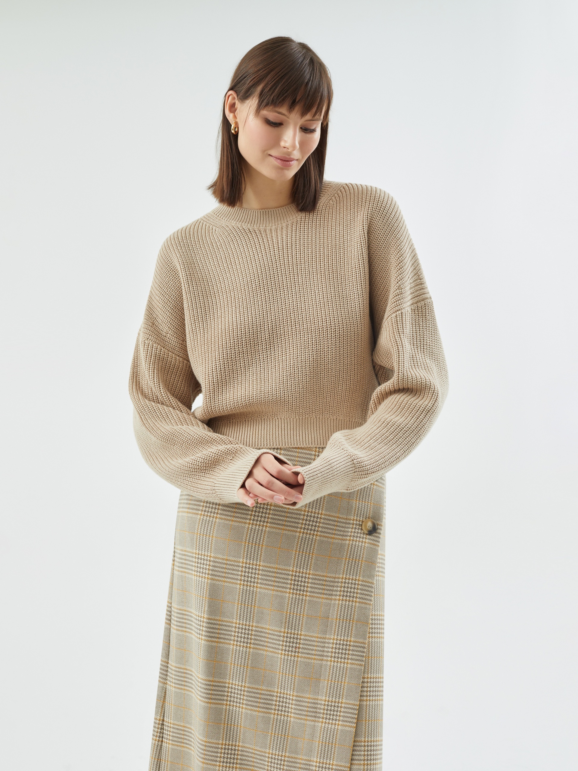 Уютный джемпер из вязаного трикотажа укороченного свободного силуэта с круглым вырезом горловины, спущенным плечом и рукавом полной длины. Спинка длиннее полочки. Стильная и комфортная вещь для теплых повседневных образов.