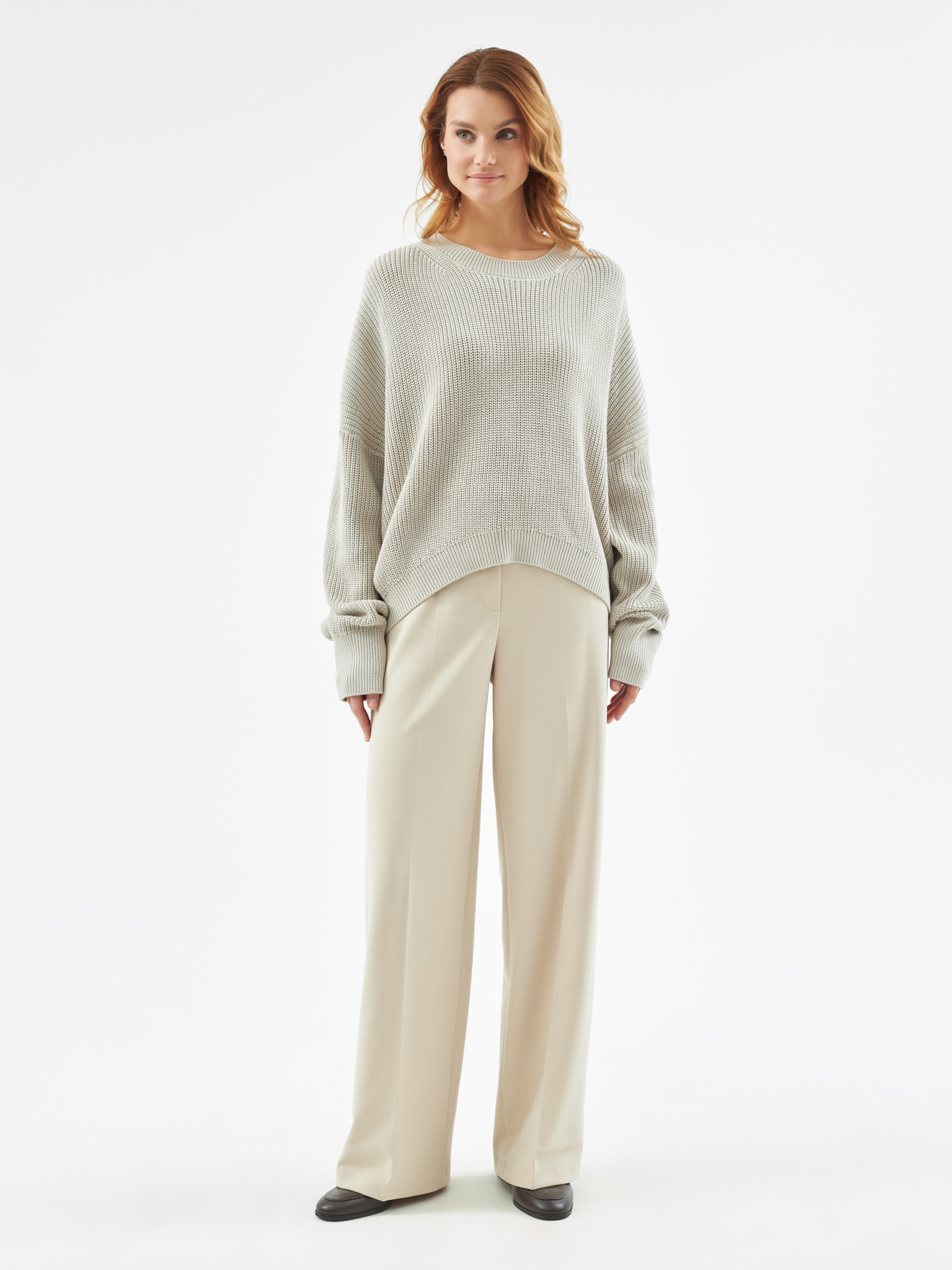 Уютный джемпер их вязаного трикотажа укороченного свободного силуэта с круглым вырезом горловины, спущенным плечом и рукавом полной длины. Спинка длиннее полочки. Стильная и комфортная вещь для тёплых повседневных образов.
