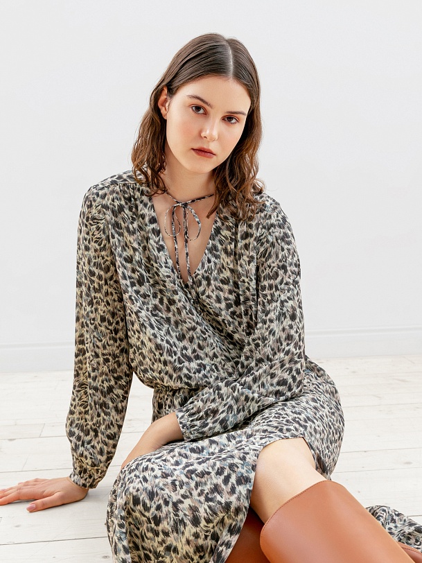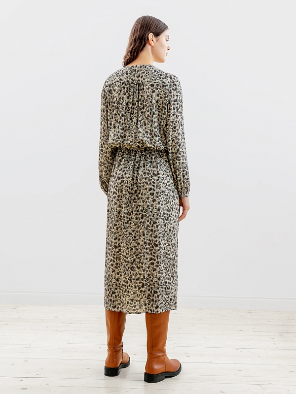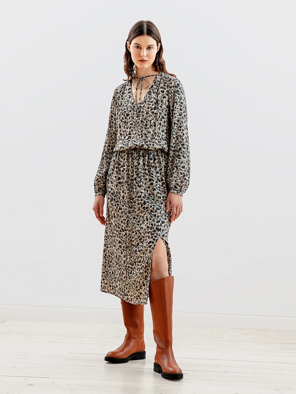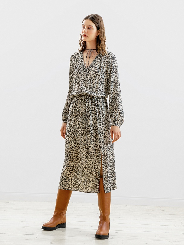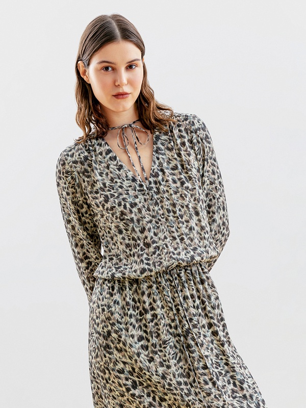 Женственное платье длины миди полуприлегающего силуэта из натуральной вискозы в анималистичном принте с V-образным вырезом горловины и втачным рукавом полной длины с объёмом по низу. На талии кулиска и шнур для создания более приталенного силуэта.