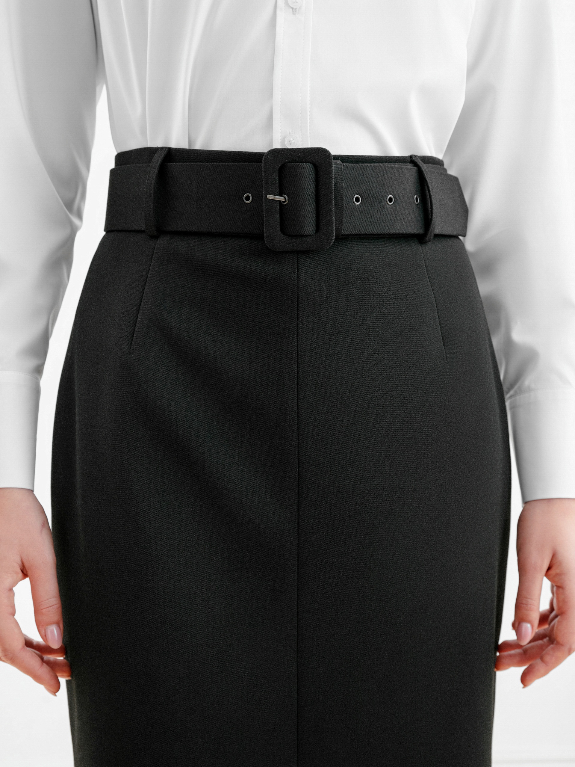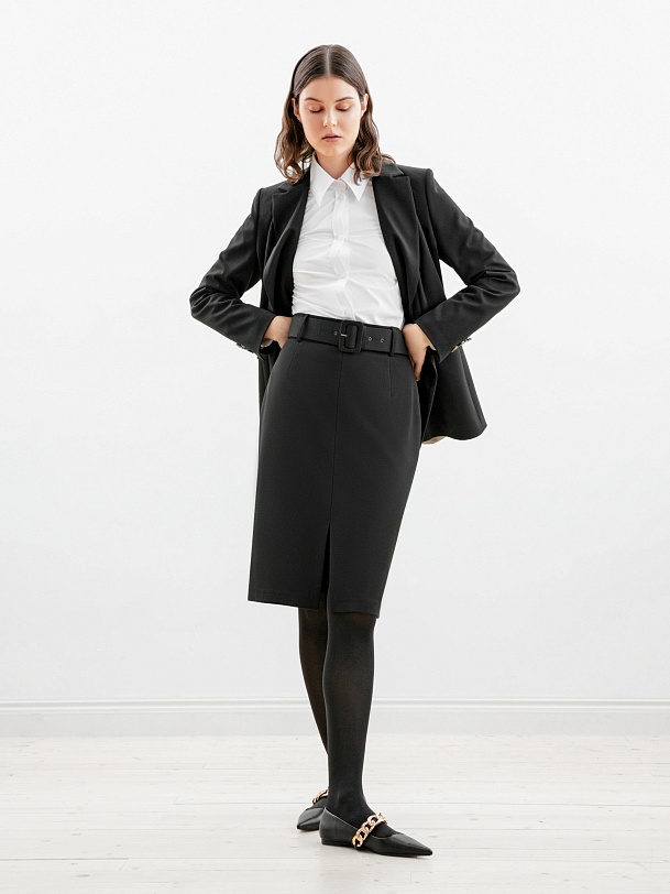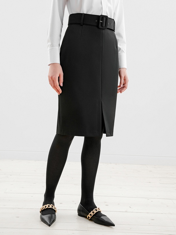Юбка полуприлегающего силуэта из костюмной ткани на притачном поясе. Застежка на потайную молнию. В комплект входит широкий обтяжной пояс из основной ткани с пряжкой.