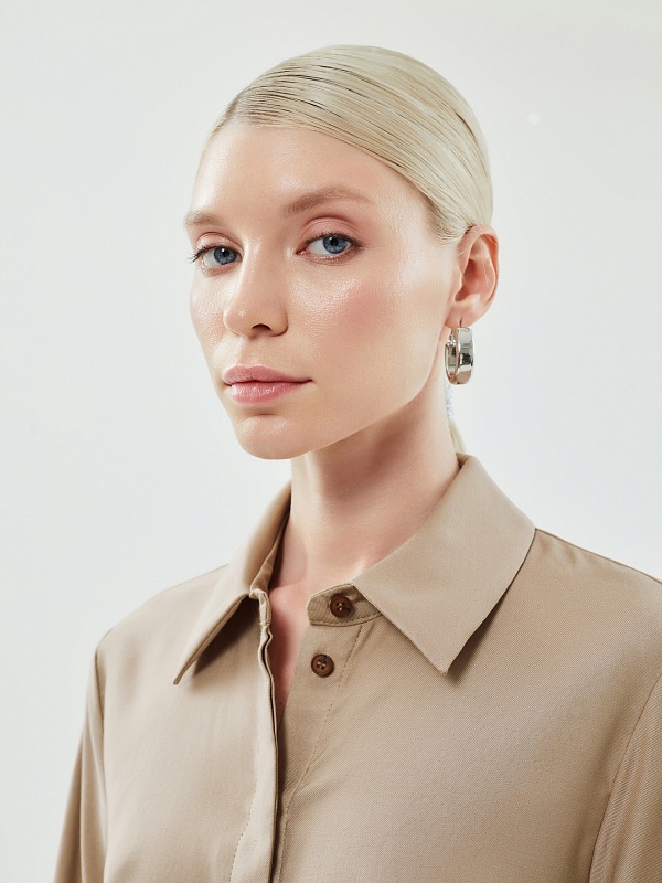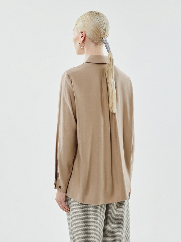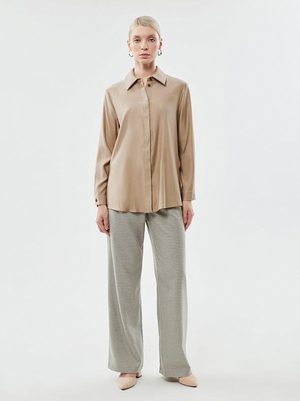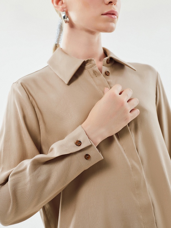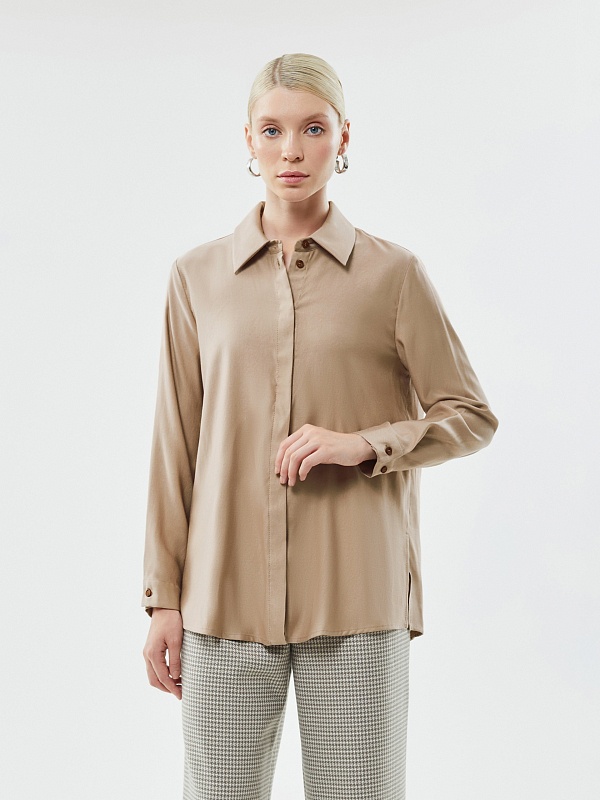Стильная повседневная рубашка из натуральной вискозы прямого свободного силуэта с разрезами по бокам, классическим отложным воротником и втачным рукавом полной длины с цельнокроеной манжетой. Застежка спереди потайная на пуговицы. Эта универсальная модель прекрасно дополнит ваши повседневные образы с юбками и брюками.