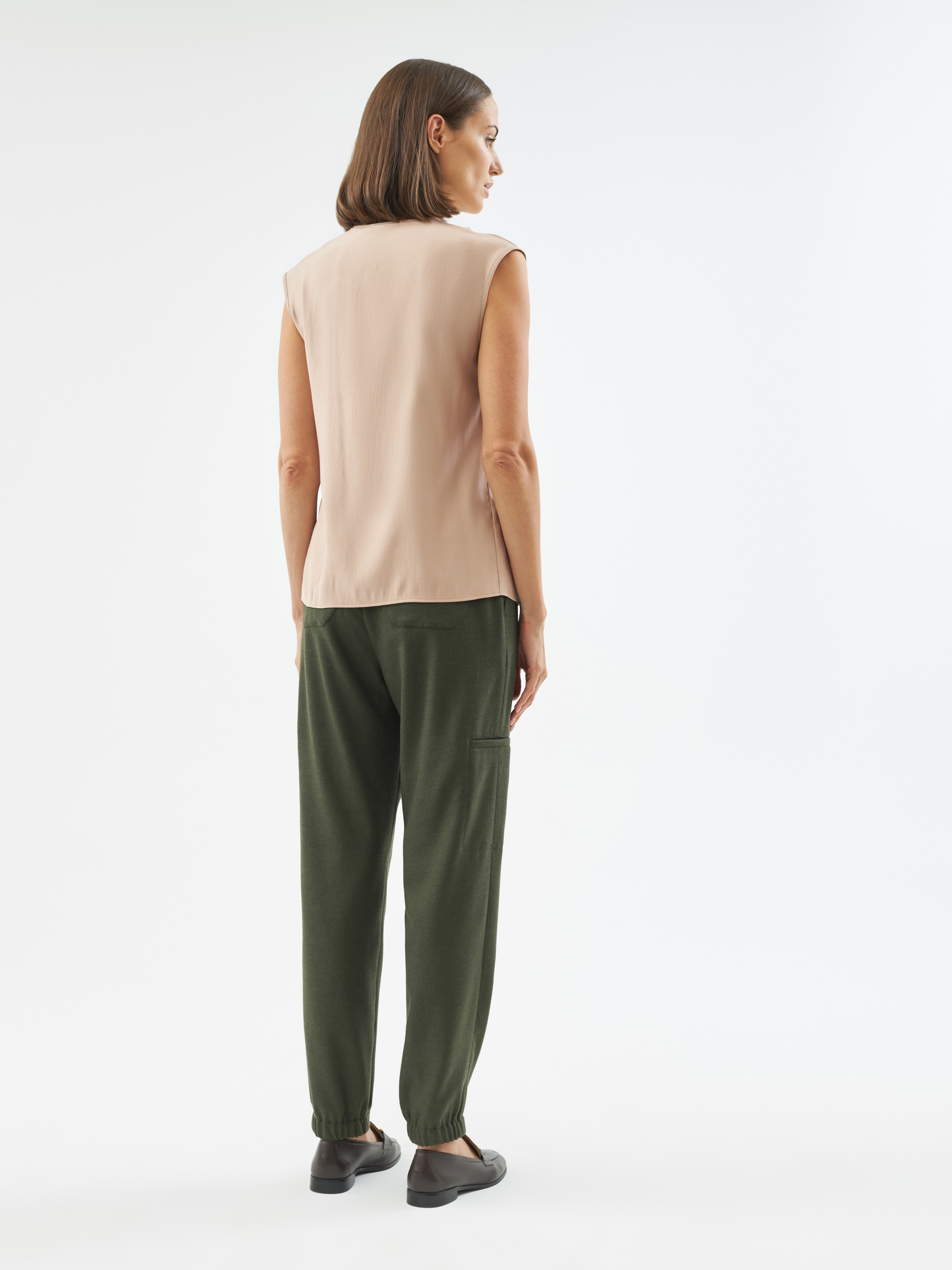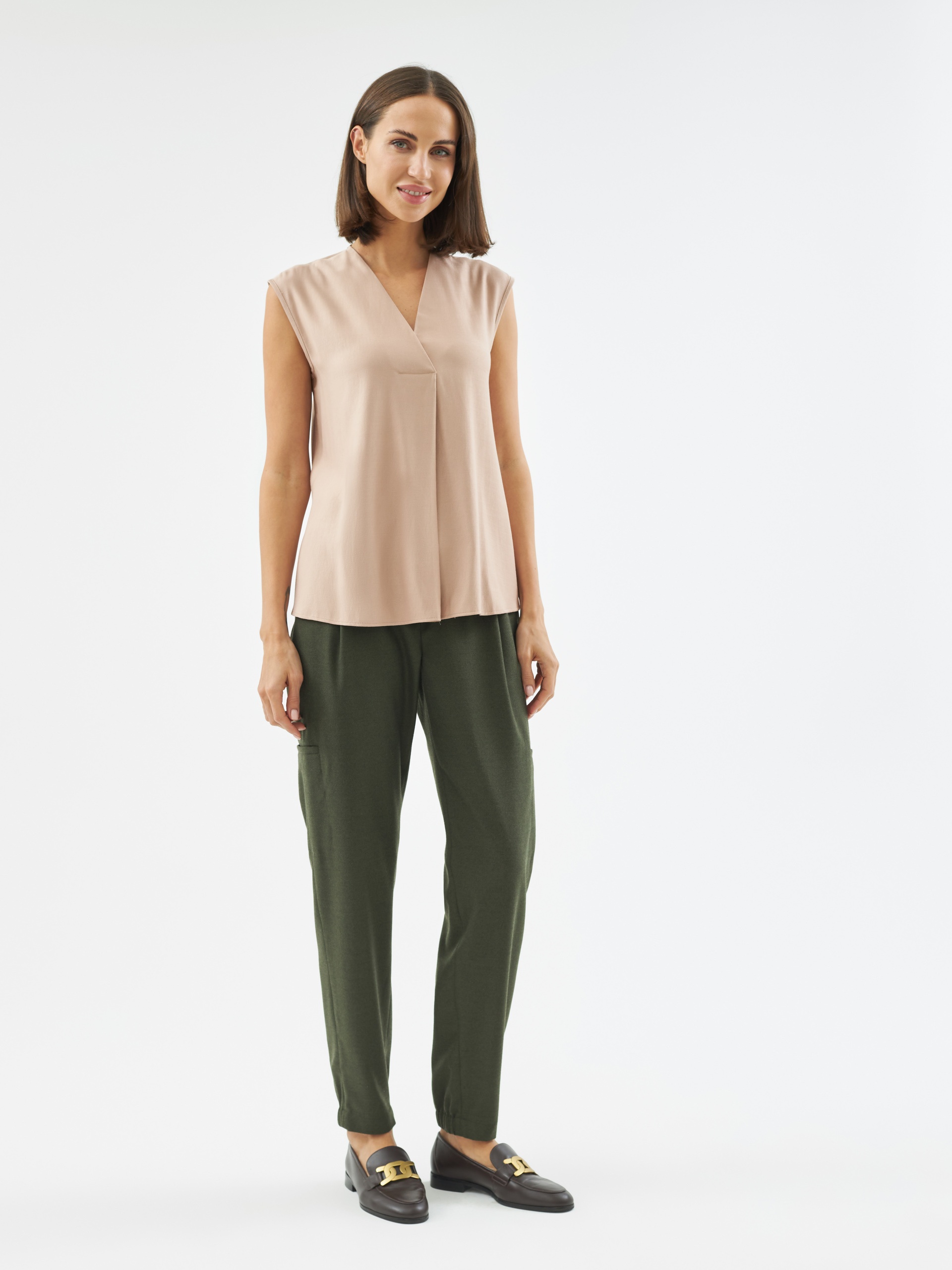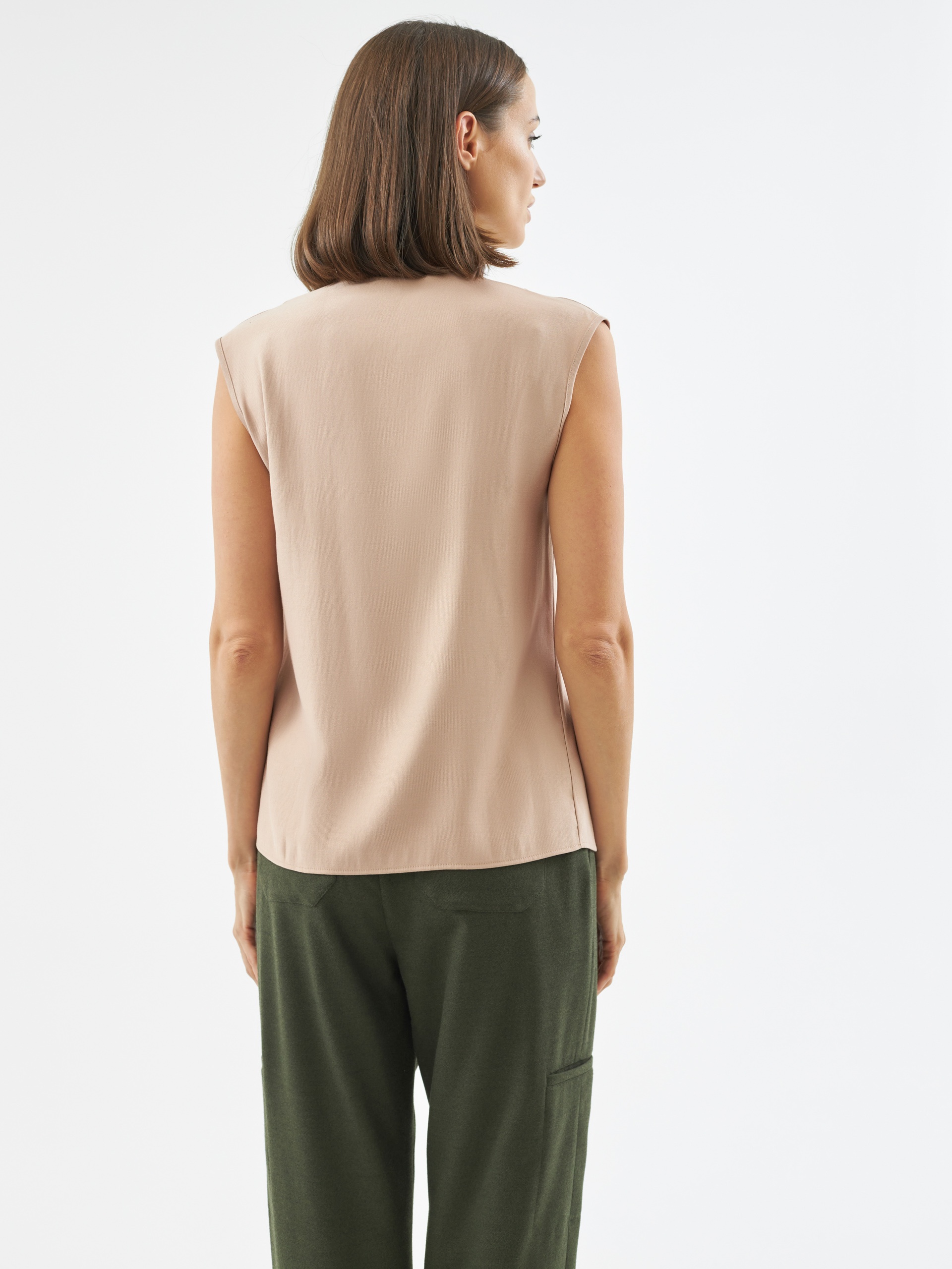 Базовая блуза без рукавов со спущенным плечом из натуральной вискозы прямого силуэта с V-образным вырезом горловины и декоративными складками спереди. Эта модель будет идеальным первым слоем под жакет.