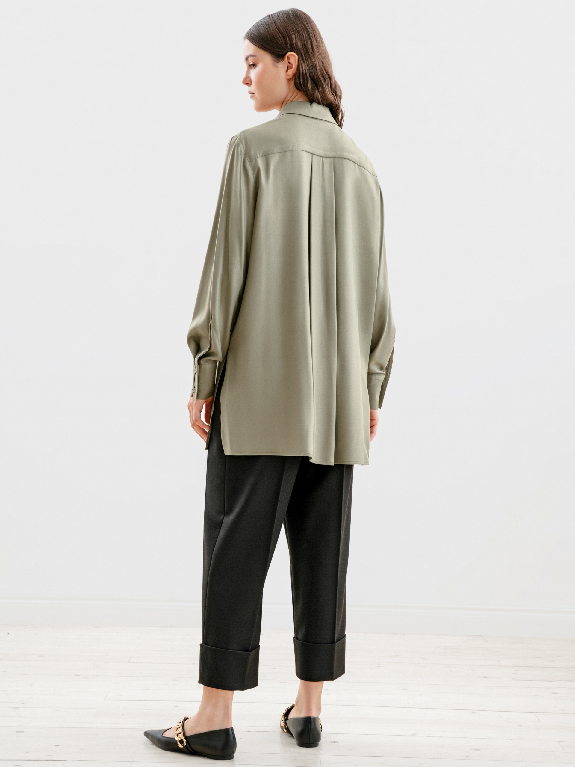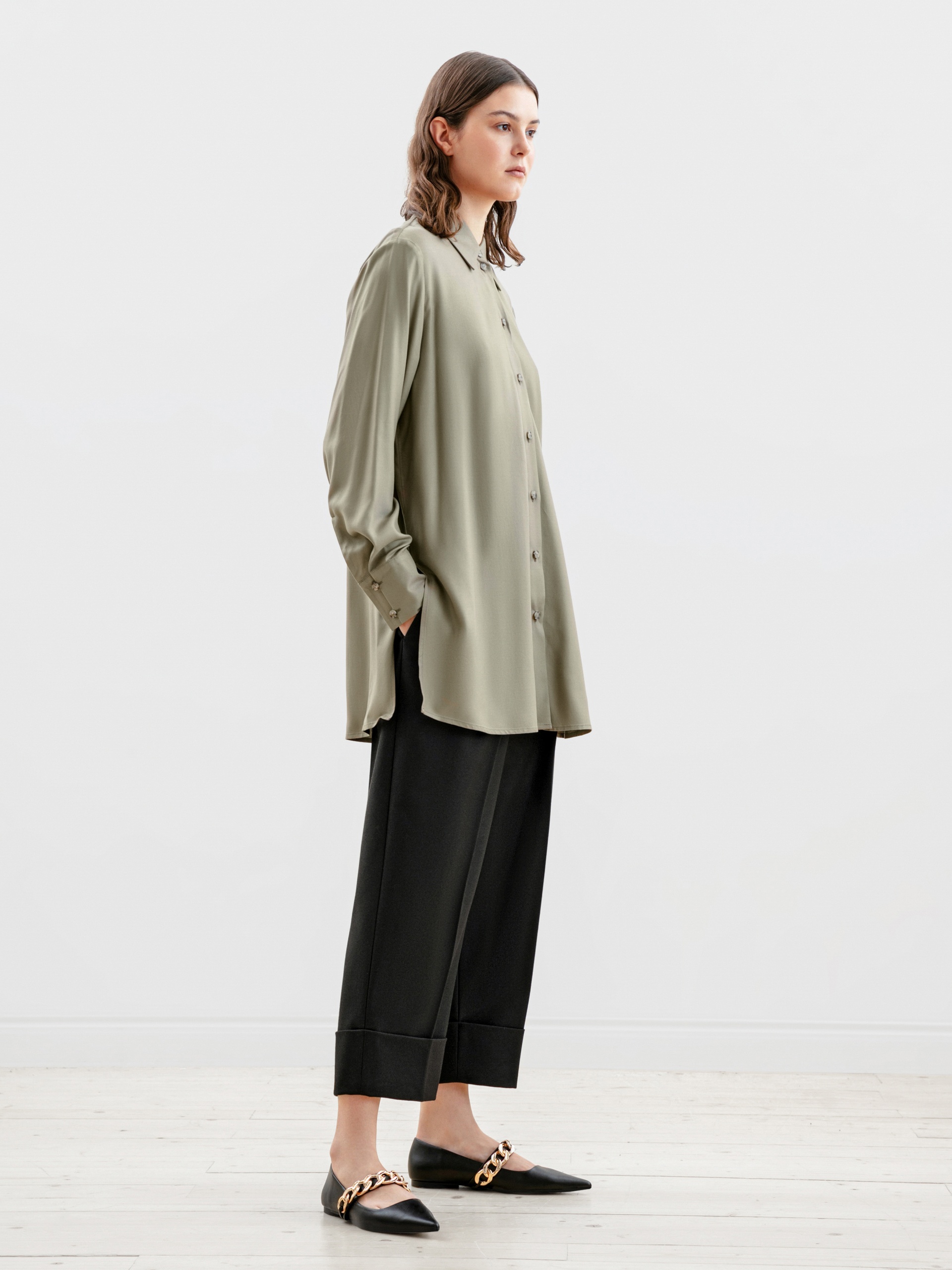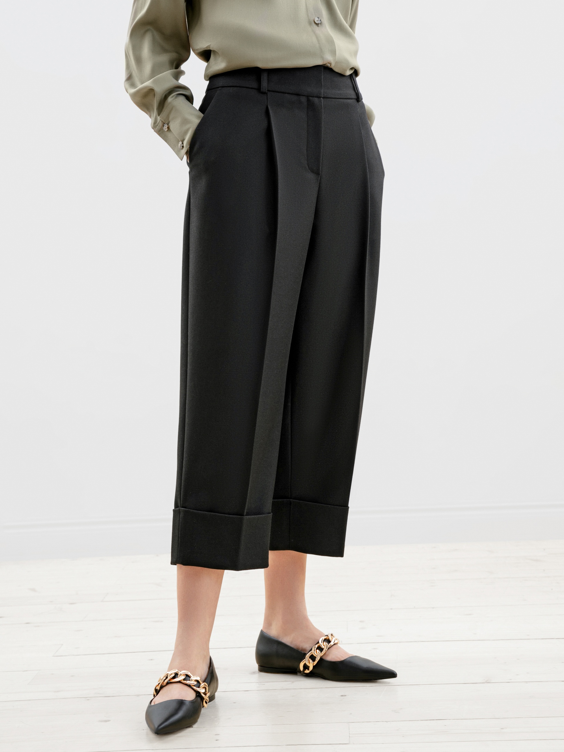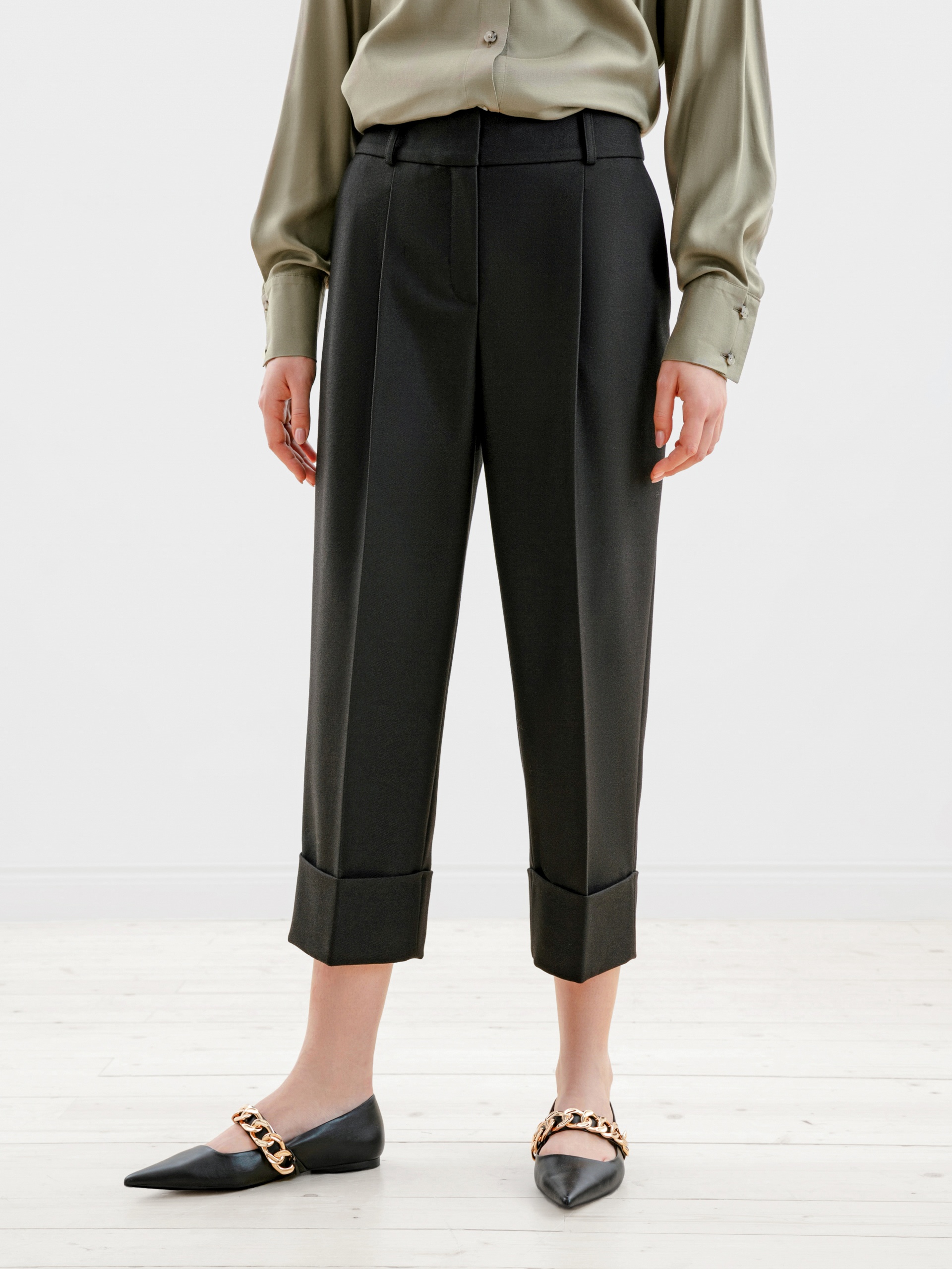Укороченные брюки из костюмной ткани со стрелками прямого силуэта на широком притачном поясе с шлевками и рабочими боковыми карманами. Спереди декоративные складки и застежка на молнию и крючок. По низу изделия широкие отвороты.