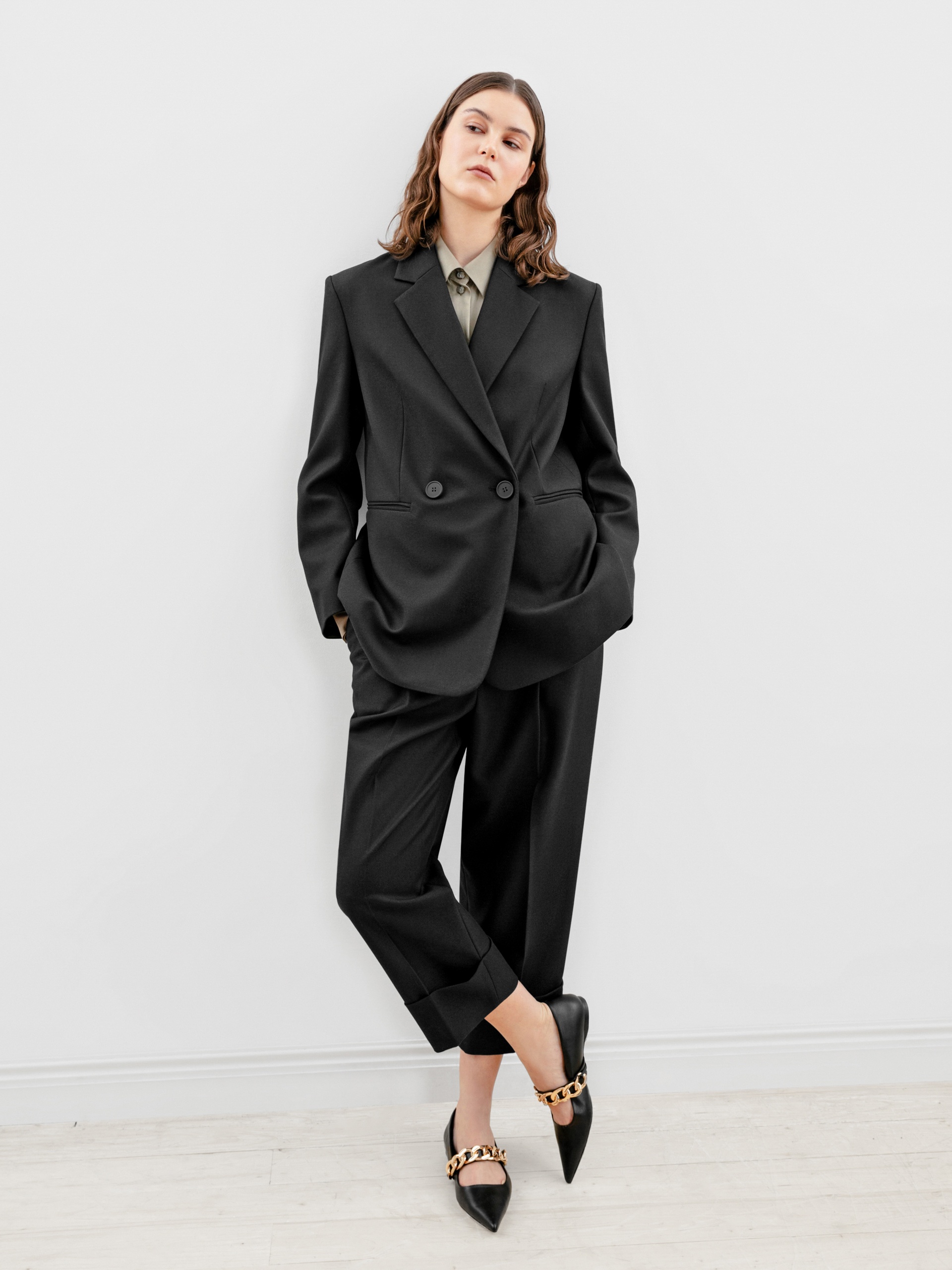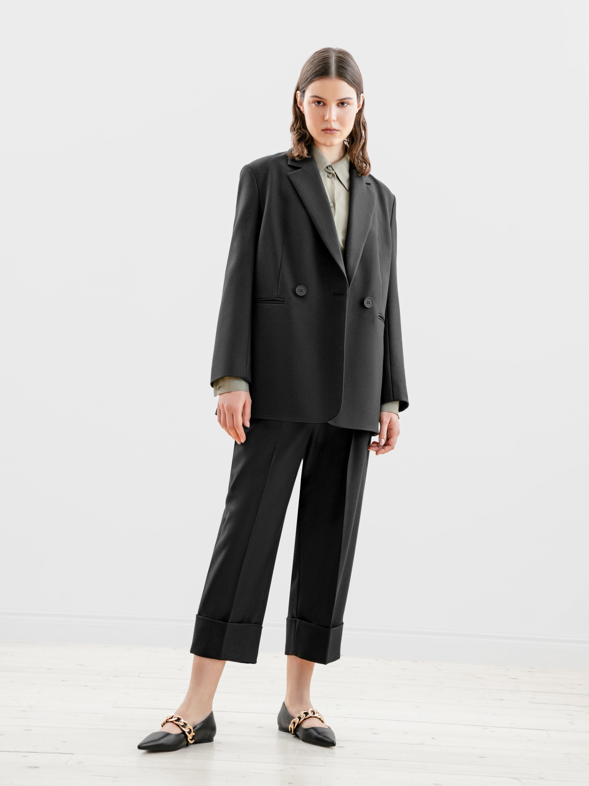 - современный объемный блейзер "с мужского плеча", который делает фигуру более женственной и хрупкой.
