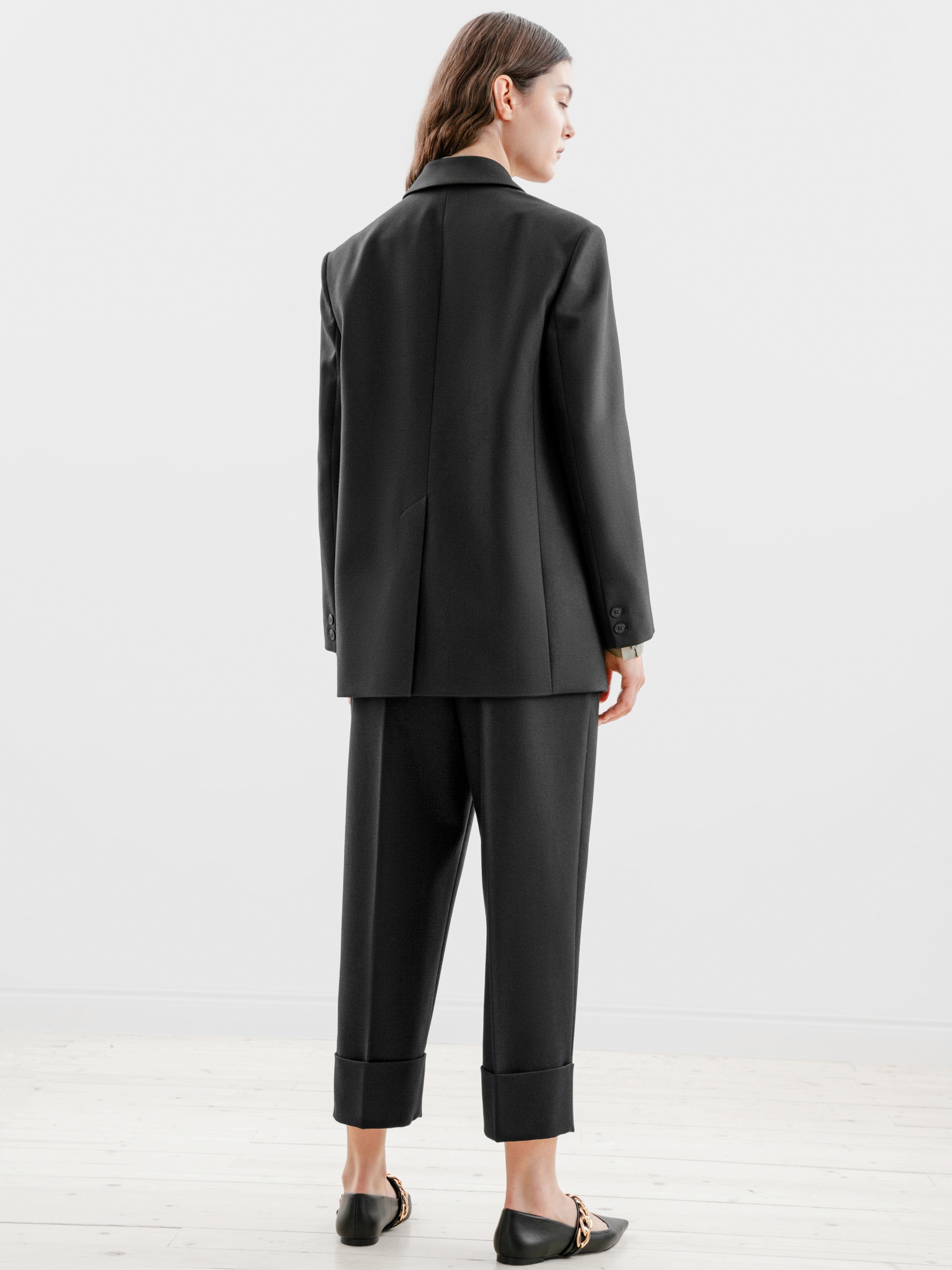 Двубортный жакет прямого силуэта в мужском стиле на подкладке из костюмной ткани с V-образным вырезом горловины, английским воротником и втачным рукавом. Застежка спереди на две пуговицы.