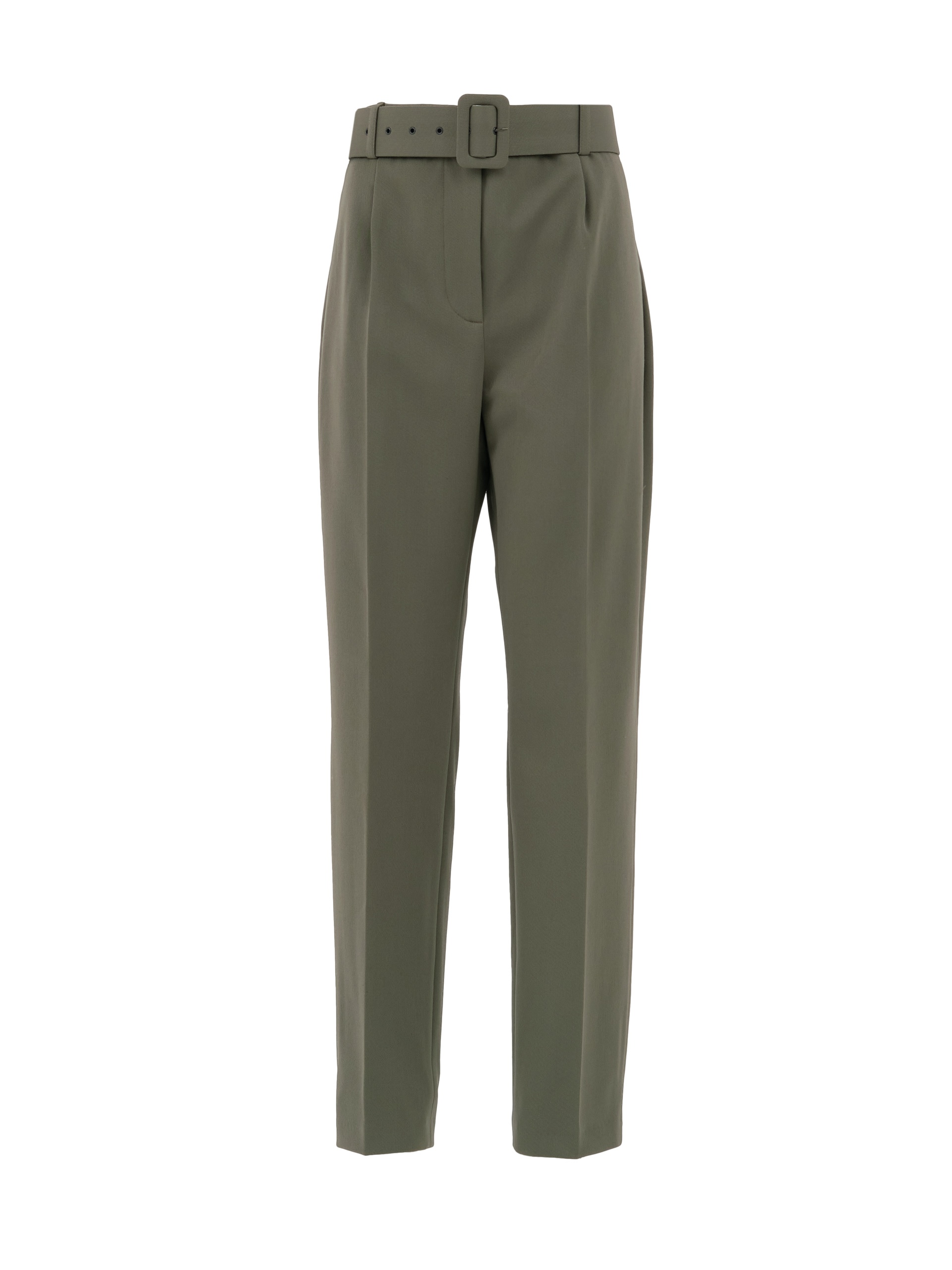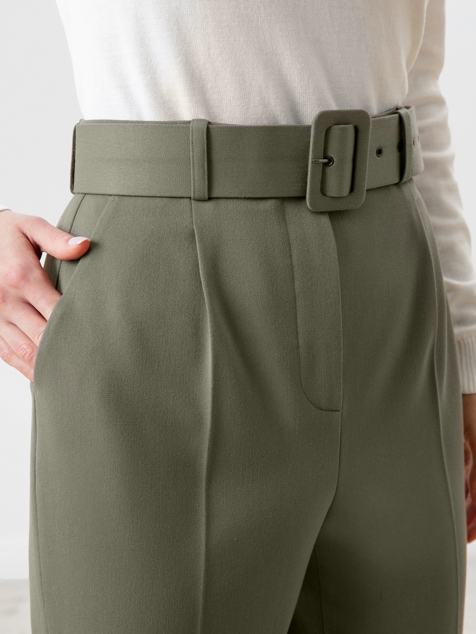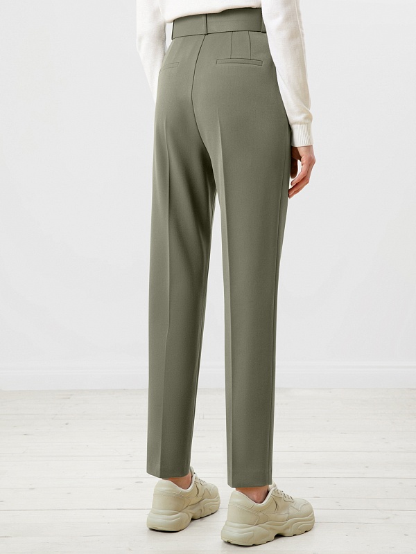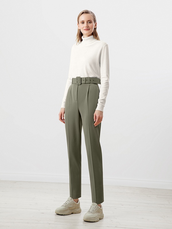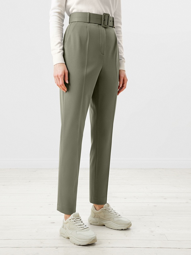 Базовые брюки со стрелками прямого силуэта на притачном поясе с шлевками, со складками и боковыми рабочими карманами. Застежка спереди на молнию и крючок. В комплект входит съёмный пояс обтяжной основной тканью с крупной пряжкой.