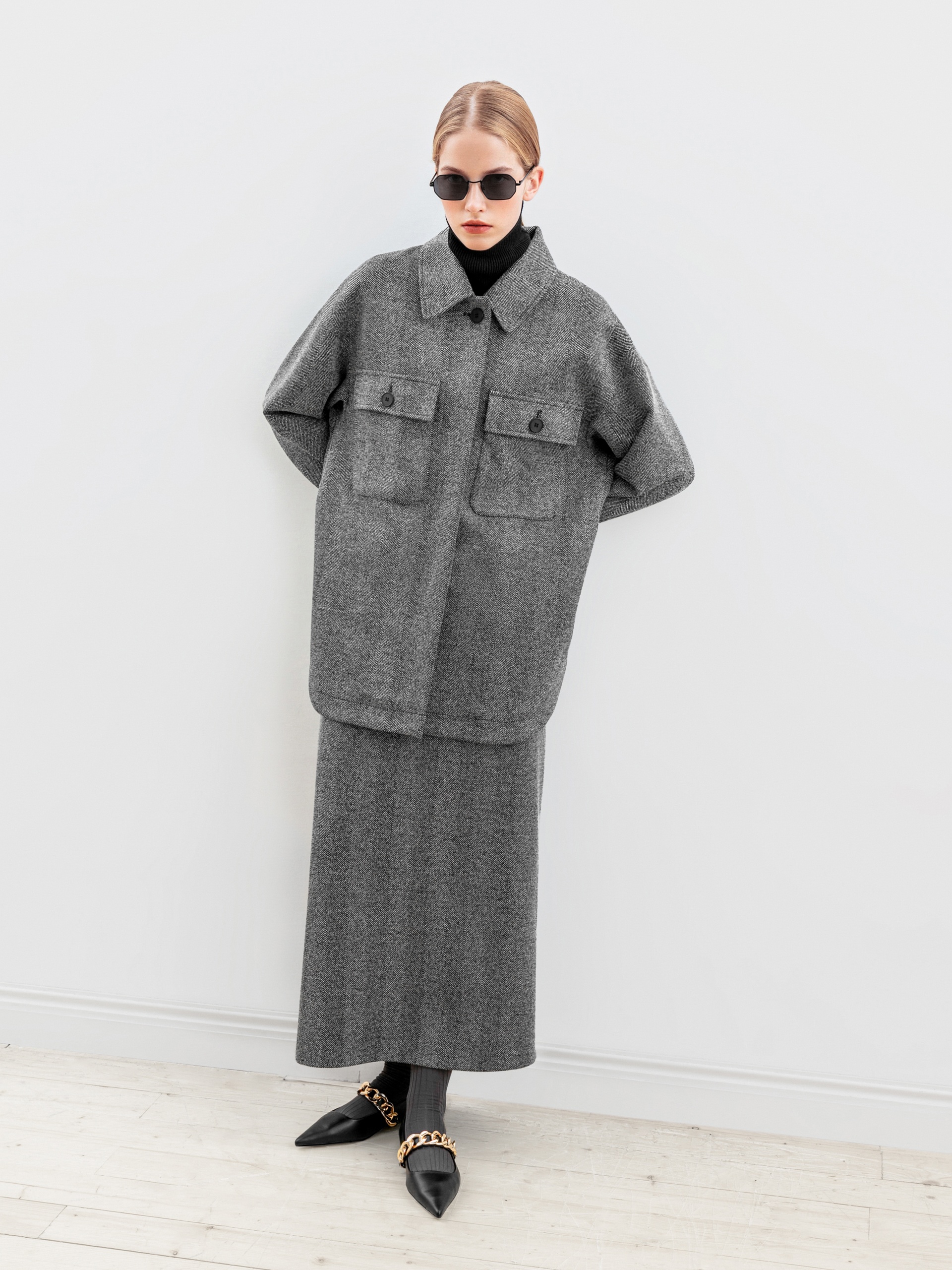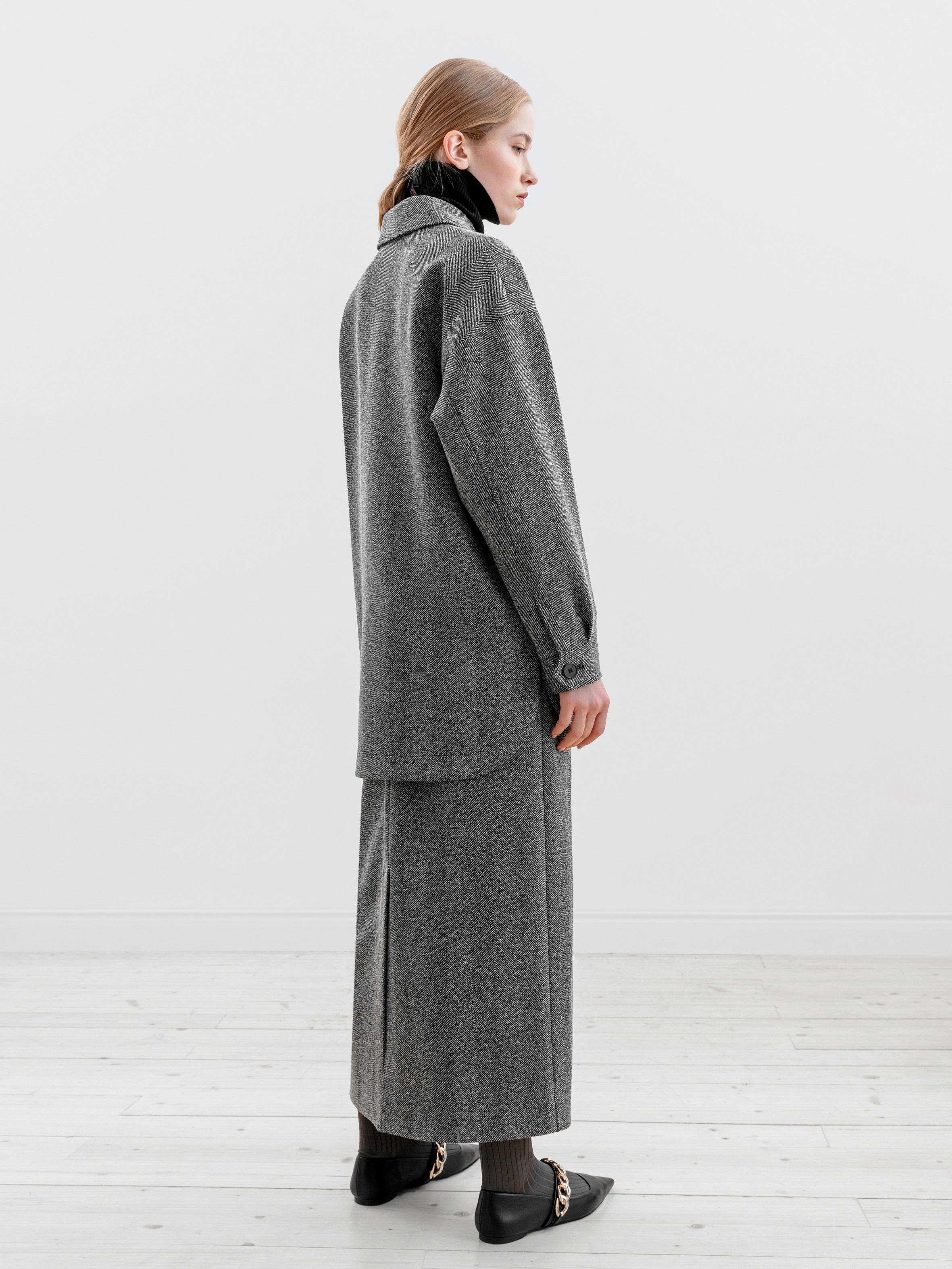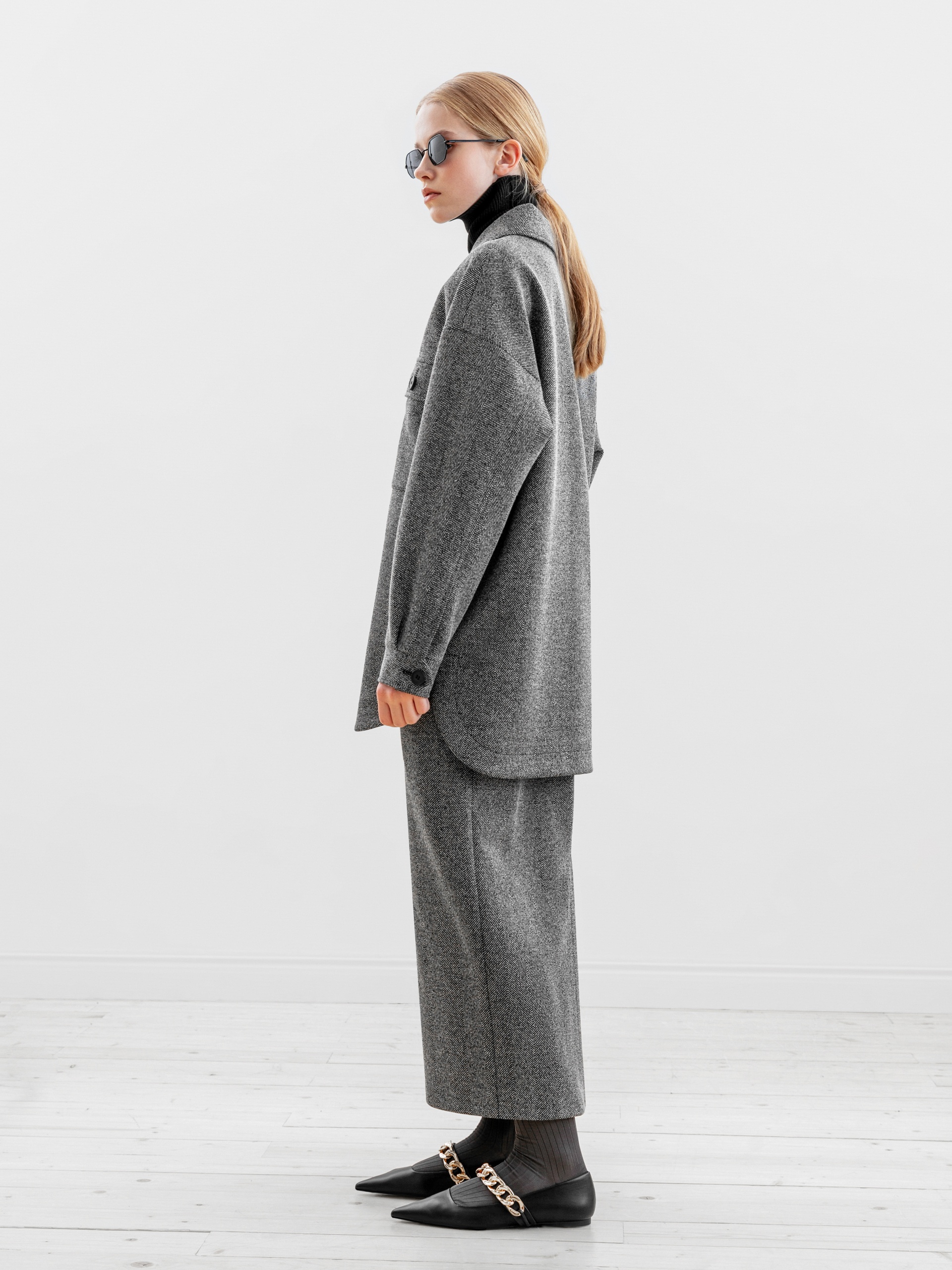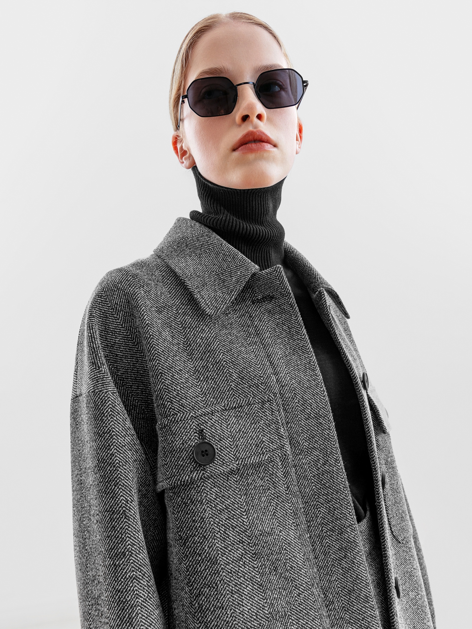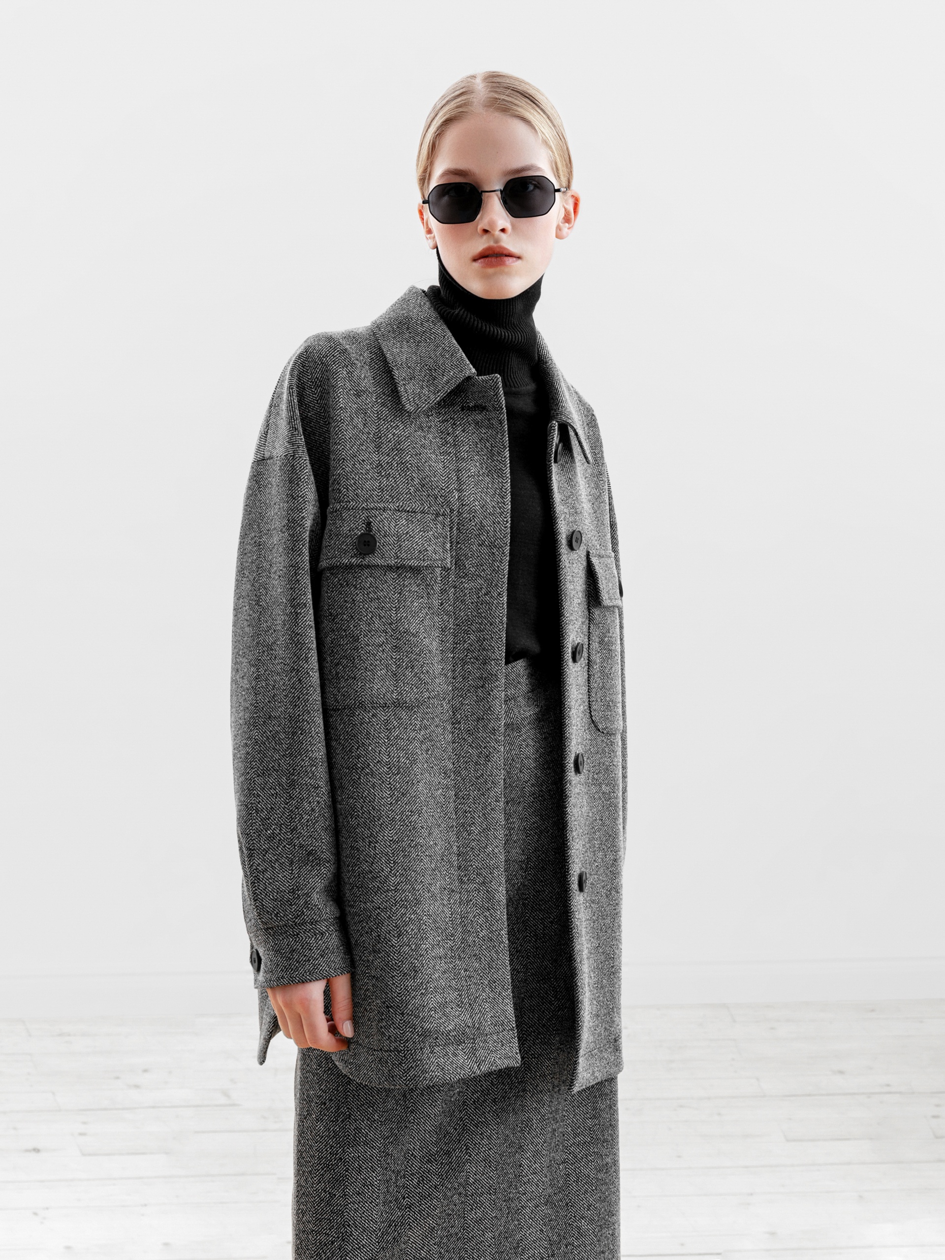 Трендовый жакет-рубашка прямого силуэта со спущенным плечом, втачным рукавом полной длины на манжете, отложным воротником и накладными карманами. Застежка спереди потайная на пуговицы. Низ изделия закругленный. Эта модель станет свежей альтернативой верхней одежды в тёплое межсезонье.