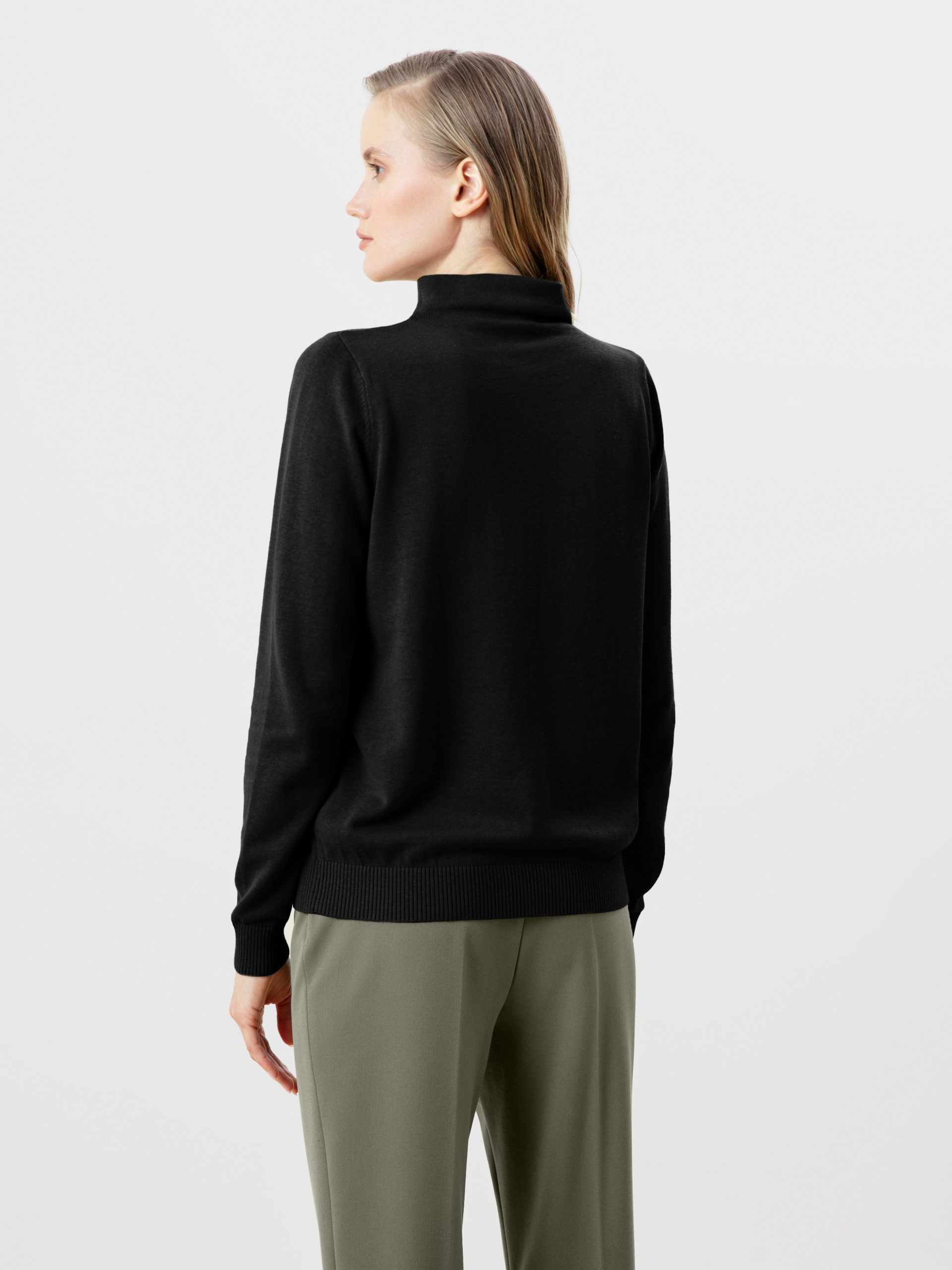 Базовый свитер из вязаного трикотажа полуприлегающего силуэта с воротником-стойка и втачным рукавом полной длины. Эта модель - идеальный нижний слой под жакеты для создания стильных и комфортных осенних образов.