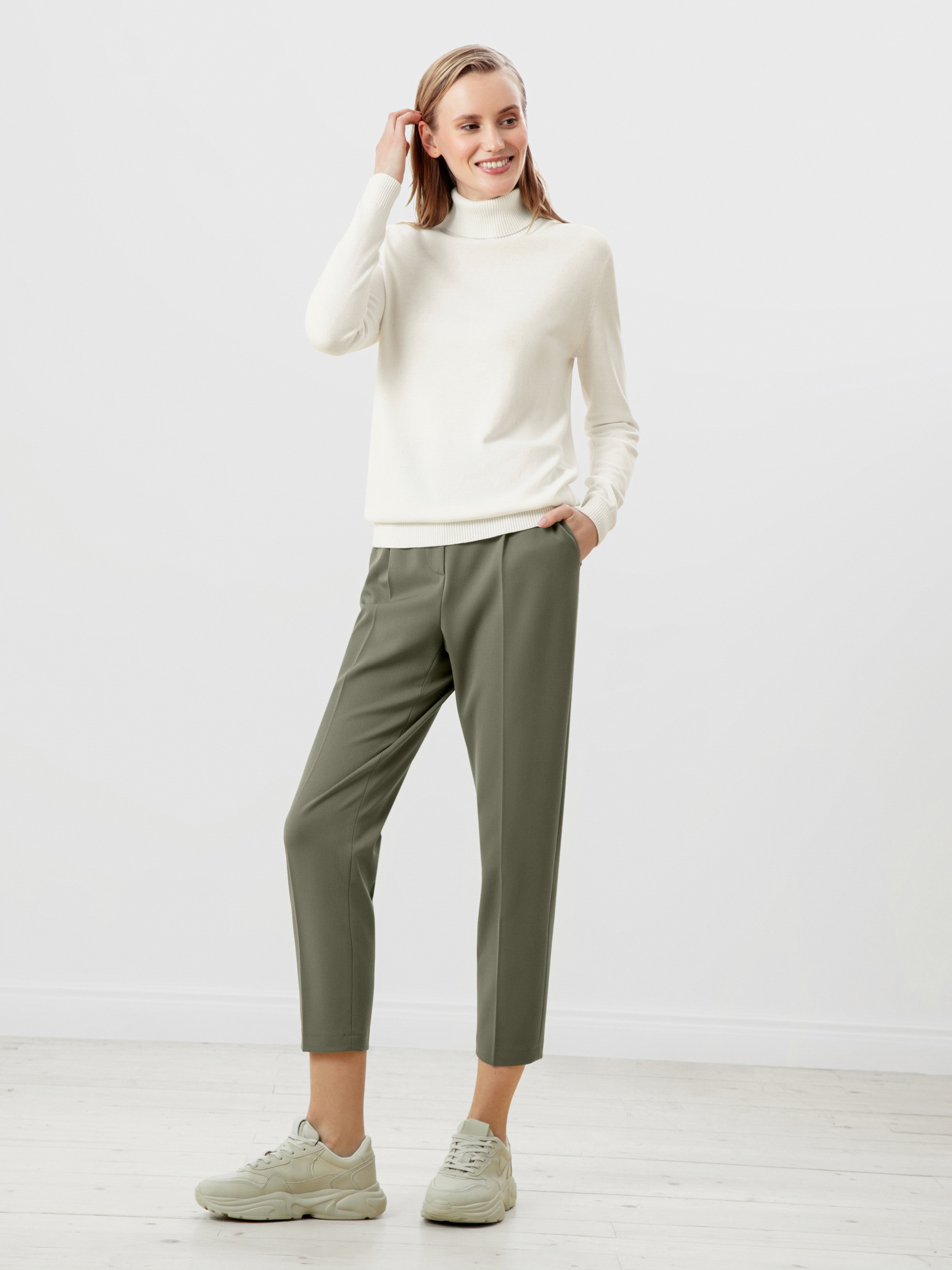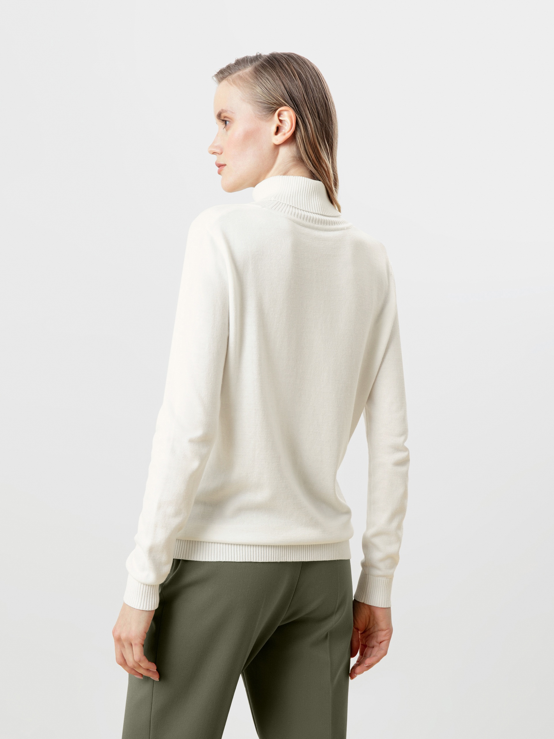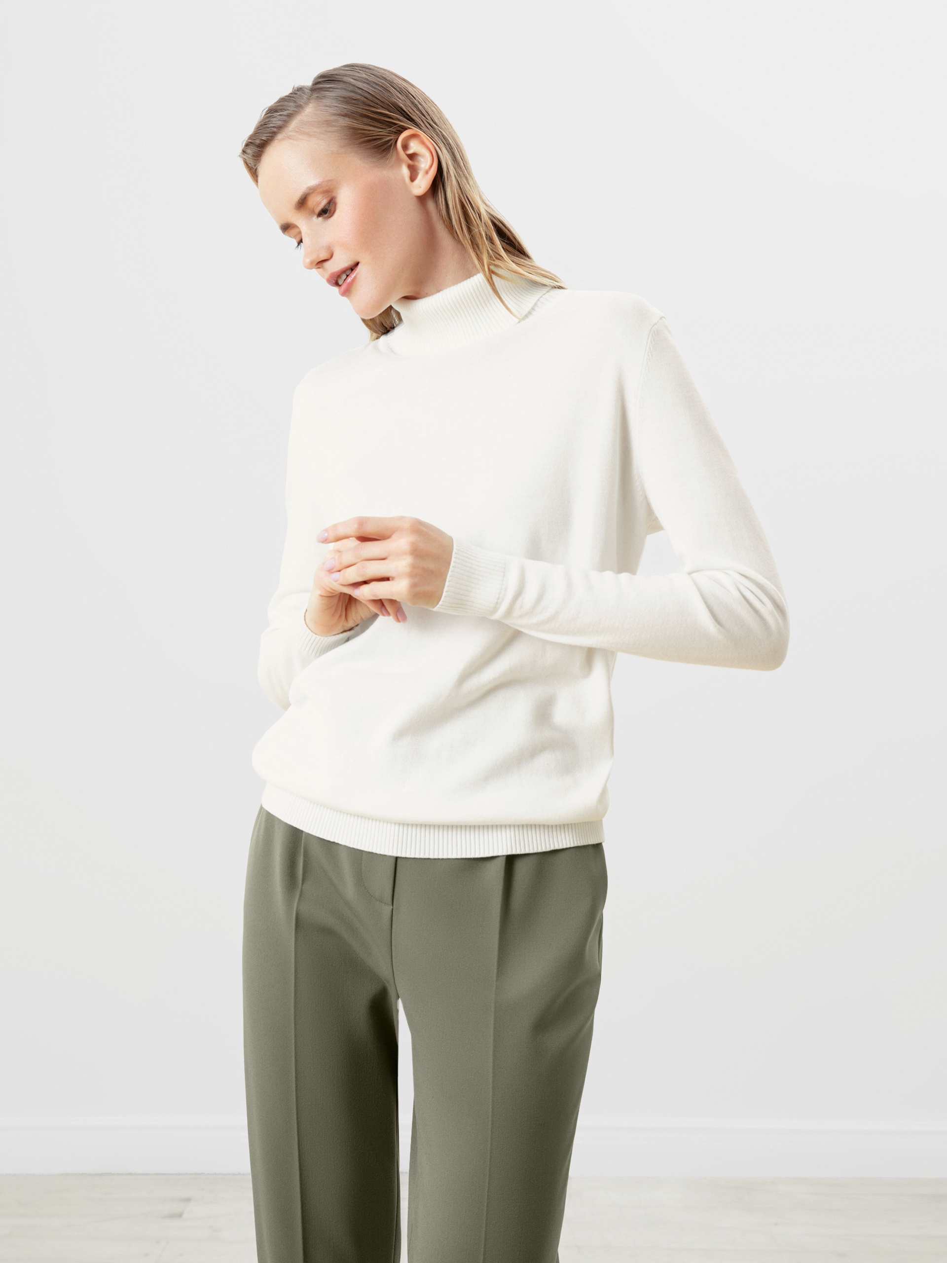 Базовый белый свитер из вязаного трикотажа свободного силуэта с воротником-стойка и втачным рукавом полной длины. Эта модель - идеальный нижний слой под жакеты для создания стильных и комфортных осенних образов.