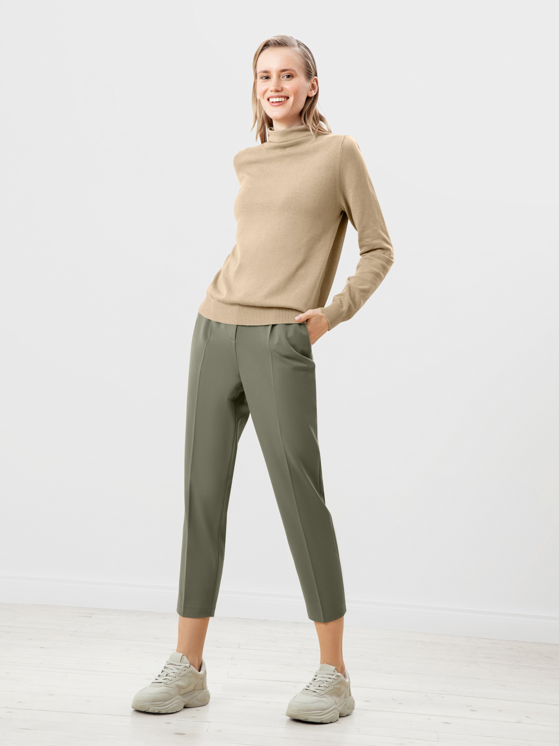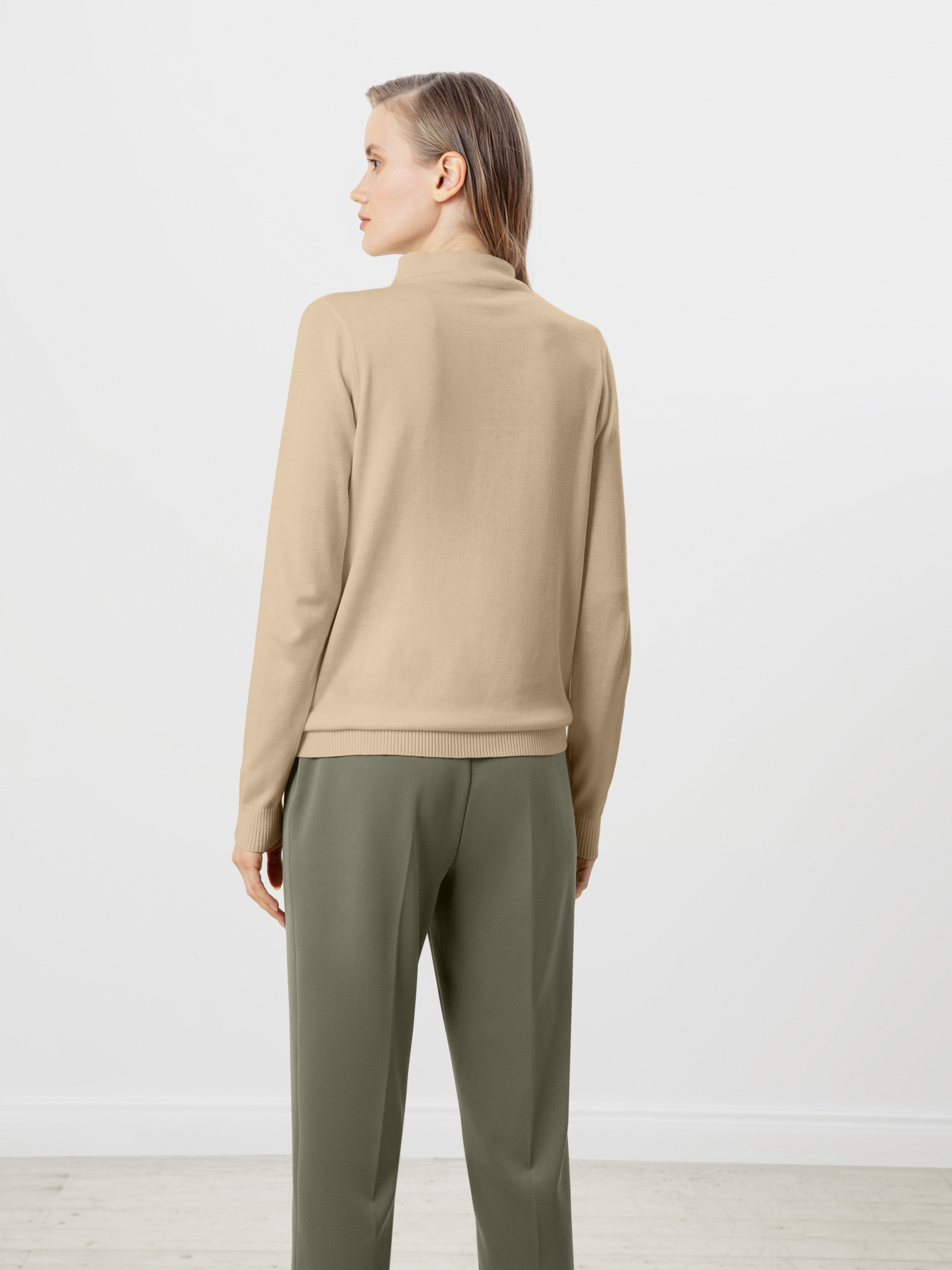 Базовый свитер из вязаного трикотажа свободного силуэта с воротником-стойка и втачным рукавом полной длины. Эта модель - идеальный нижний слой под жакеты для создания стильных и комфортных осенних образов.