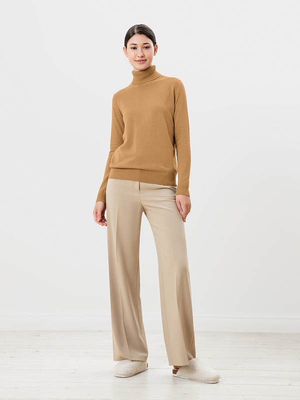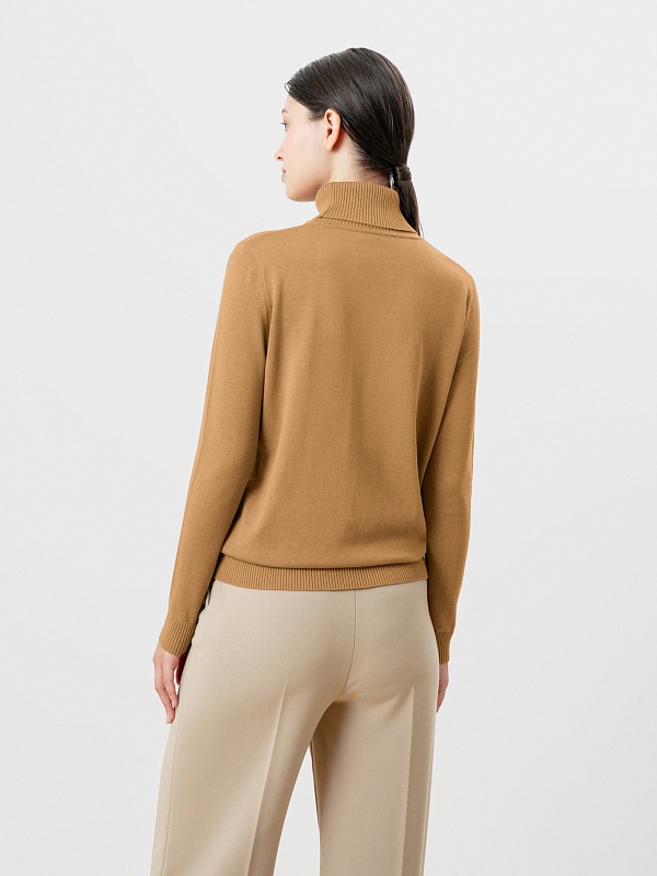 Базовый свитер из вязаного трикотажа полуприлегающего силуэта с воротником-стойка и втачным рукавом полной длины. Эта модель - идеальный нижний слой под жакеты для создания стильных и комфортных осенних образов.