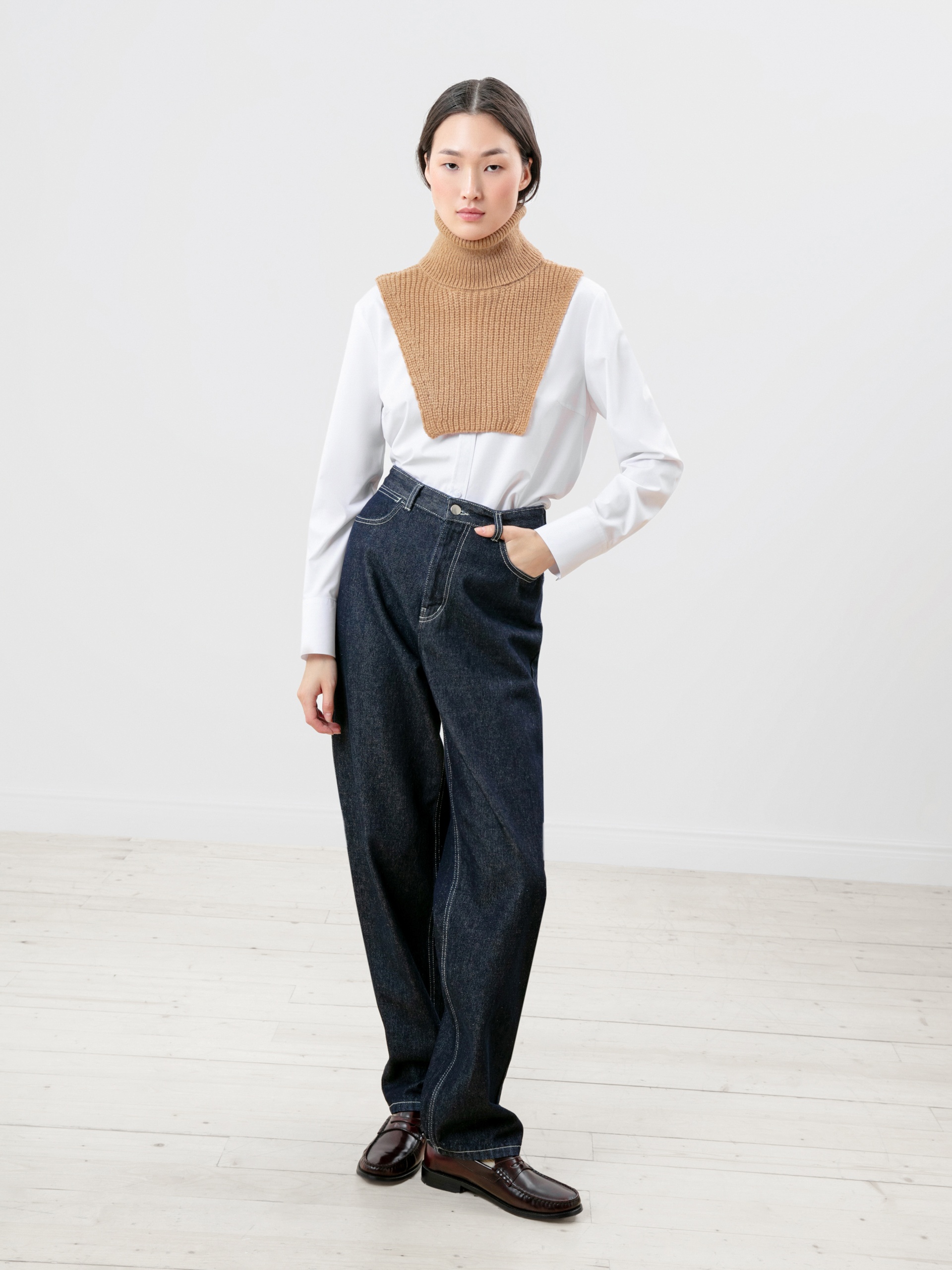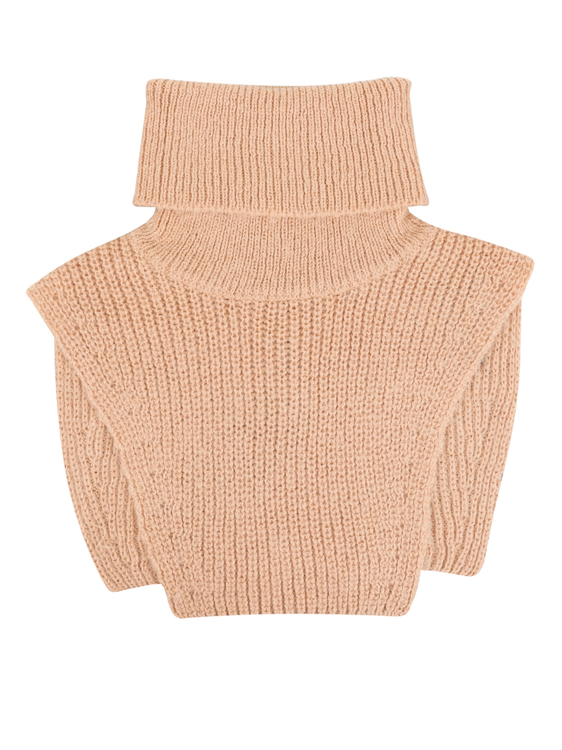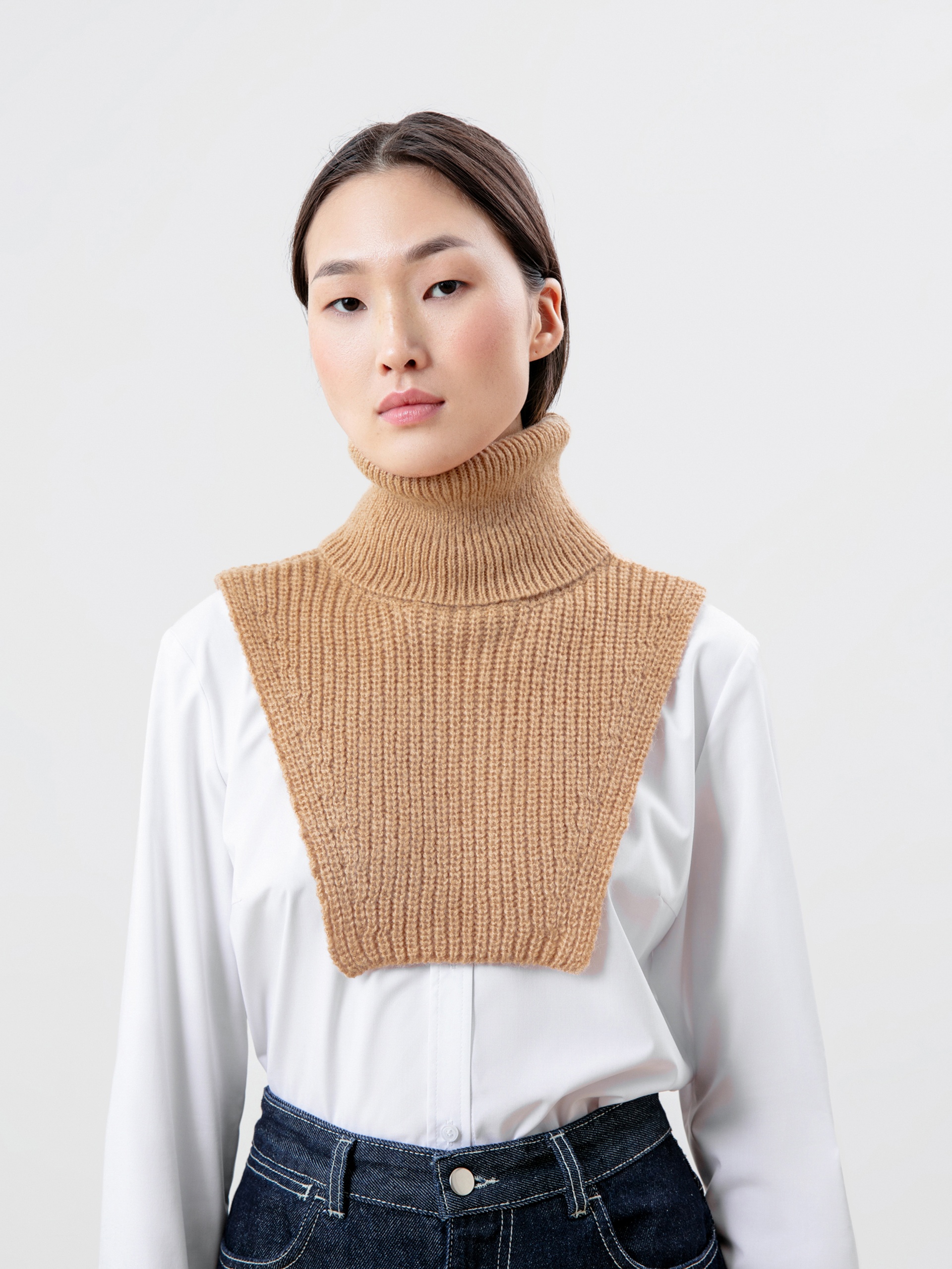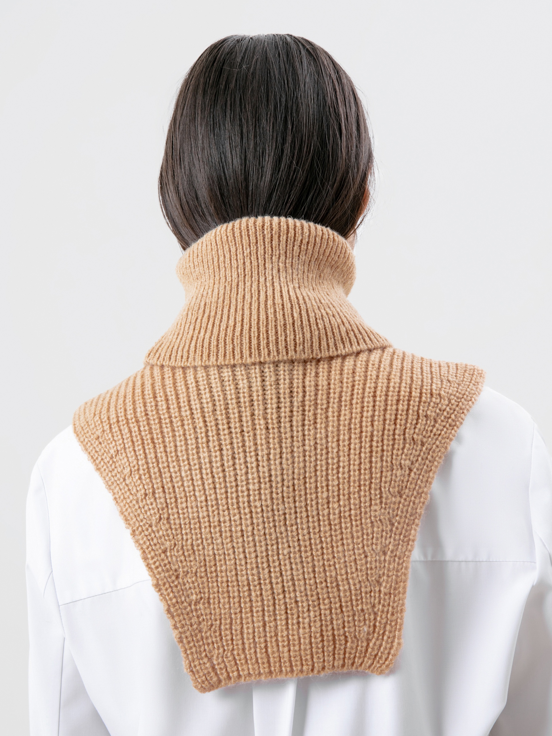 Мягкая и уютная манишка из фактурного вязаного трикотажа с широким воротником-стойкой. Незаменимая вещь для создания утепленных осенних образов.
