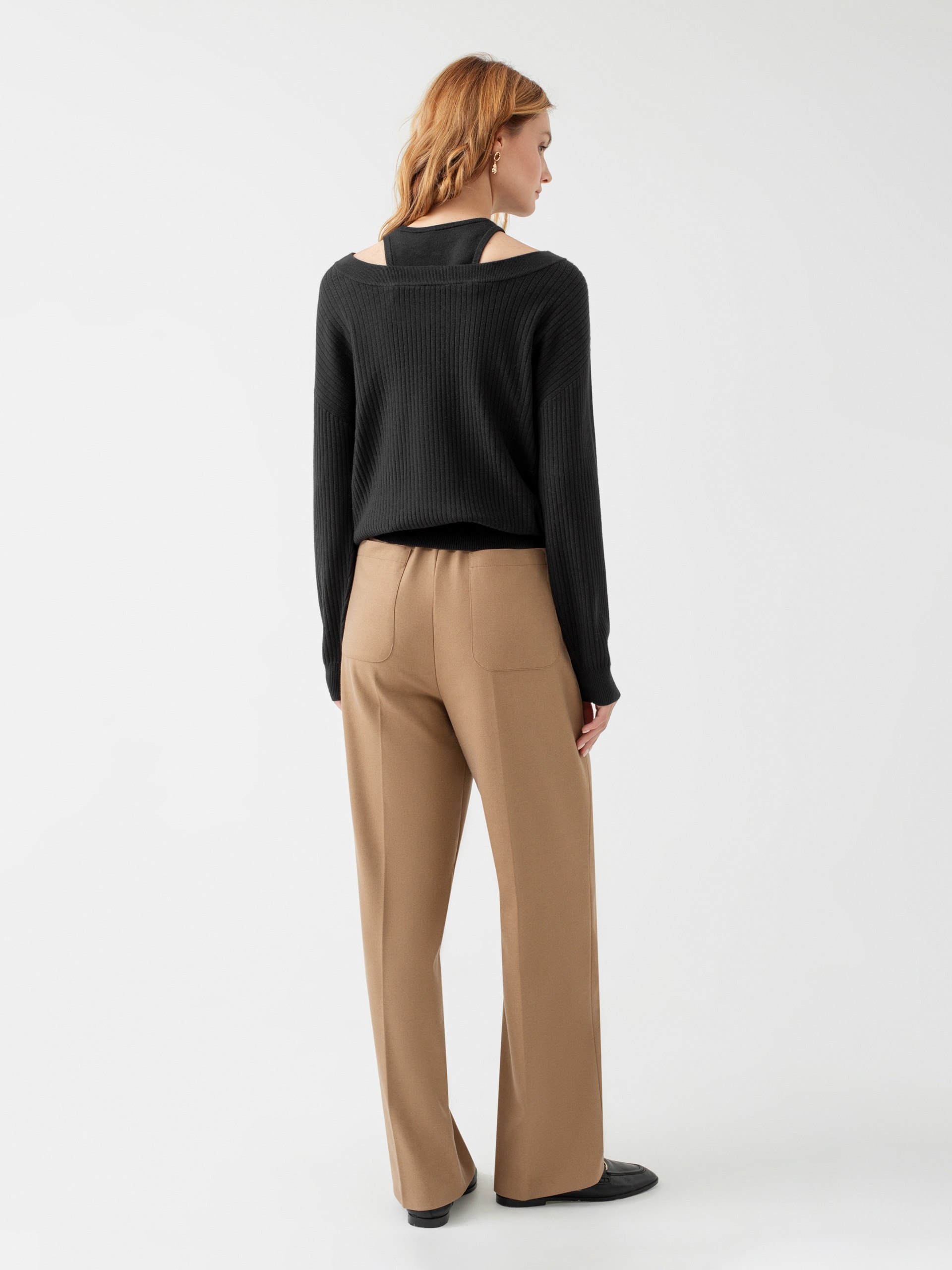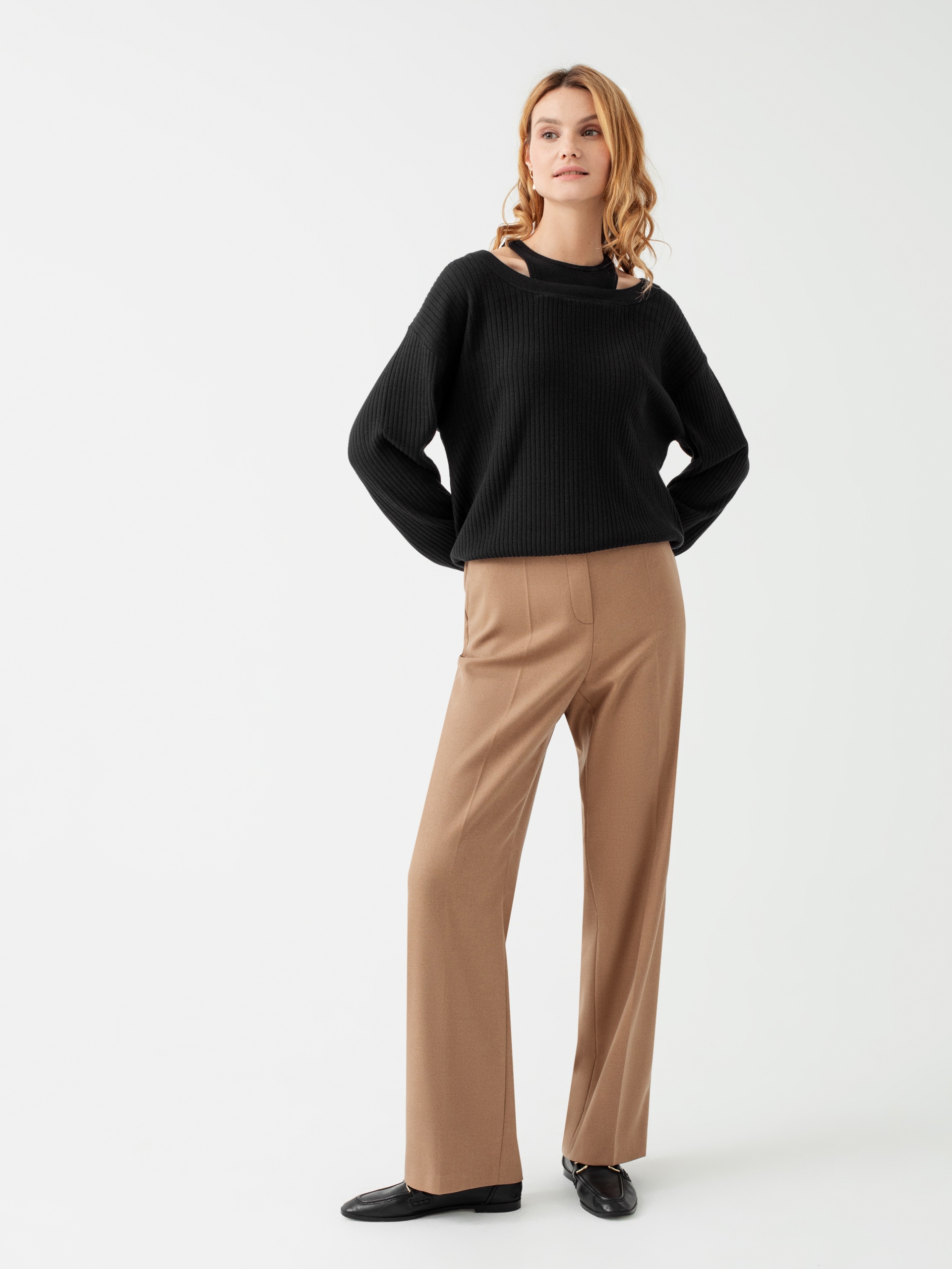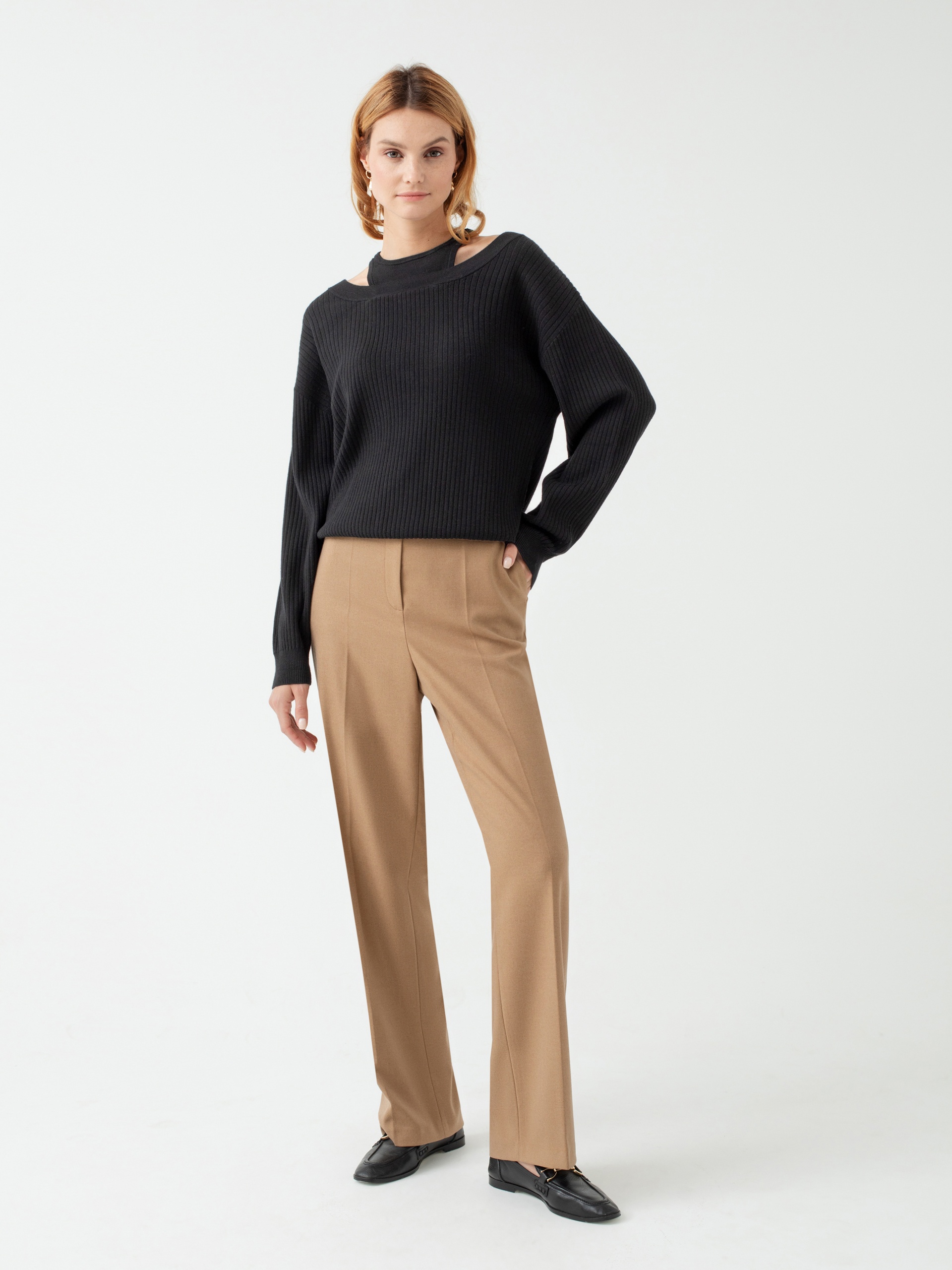 Стильный джемпер из фактурного вязаного трикотажа полуприлегающего силуэта с эффектом многослойности, круглым вырезом горловины, спущенным плечом и рукавом полной длины. Оригинальная модель добавит трендовый акцент в любой повседневный образ.