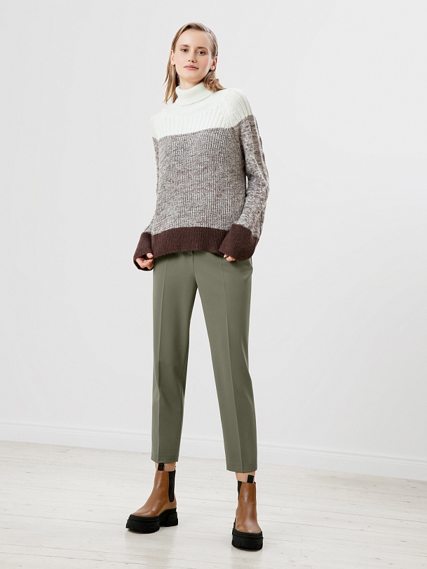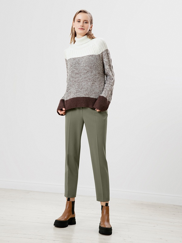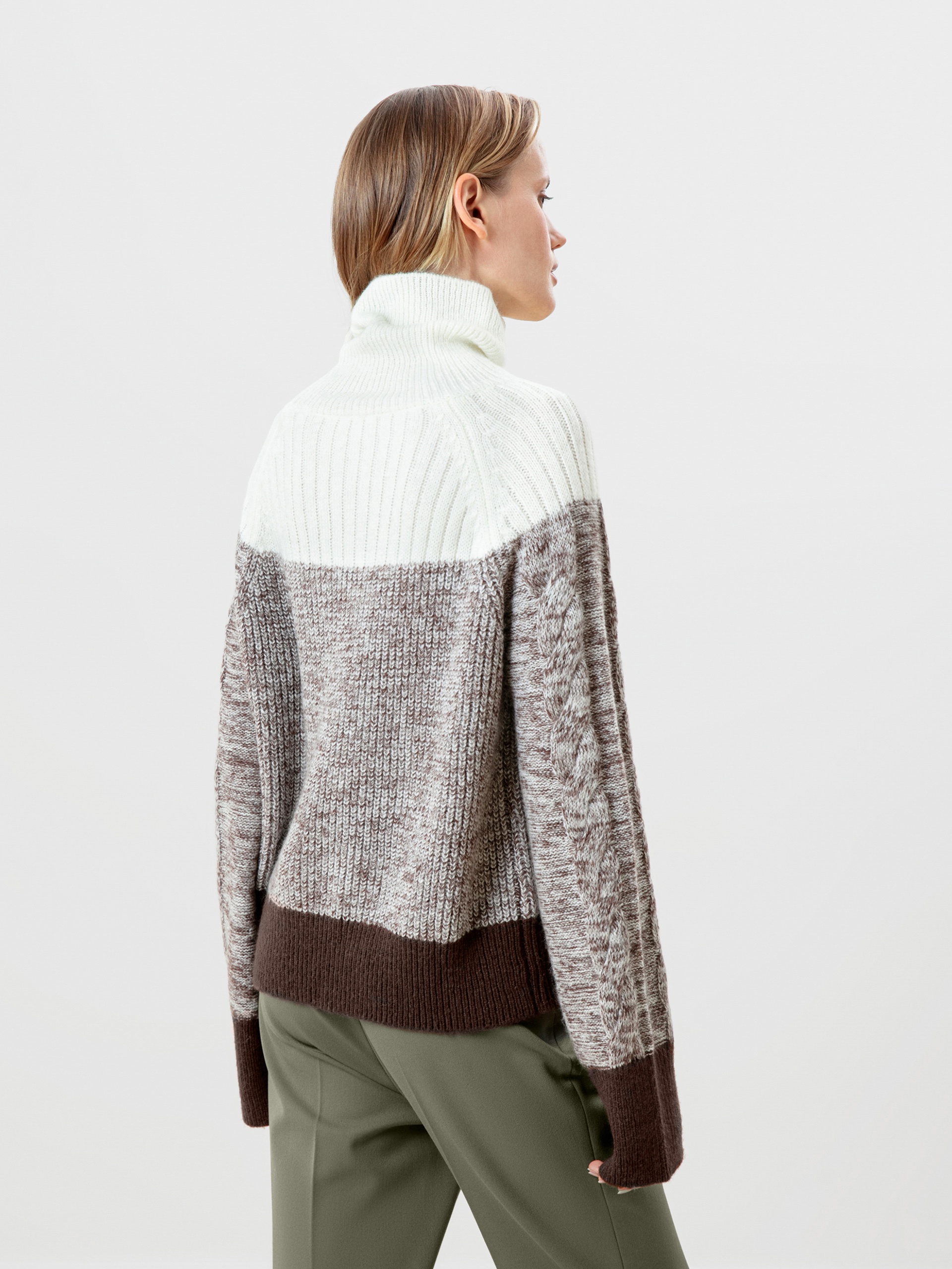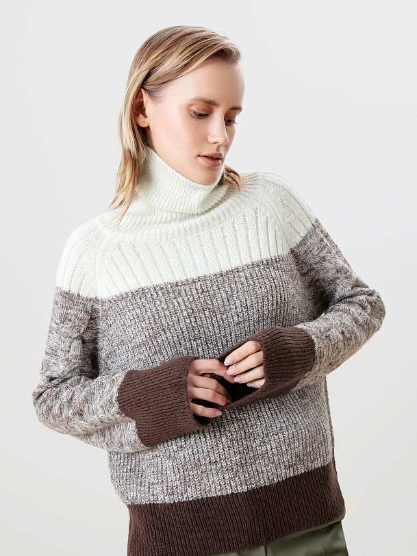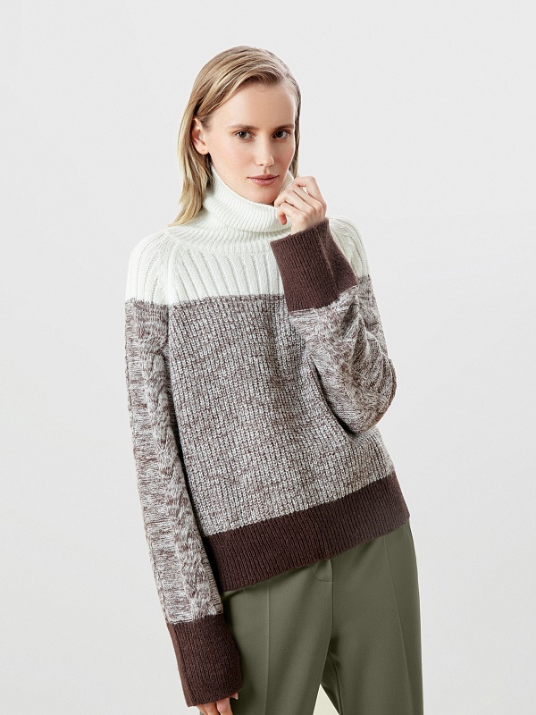 Мягкий свитер из фактурного вязаного трикотажа в стиле колор-блок свободного силуэта с широким воротником-стойка и рукавом реглан полной длины. Незаменимая вещь для комфортного и стильного осеннего гардероба.
