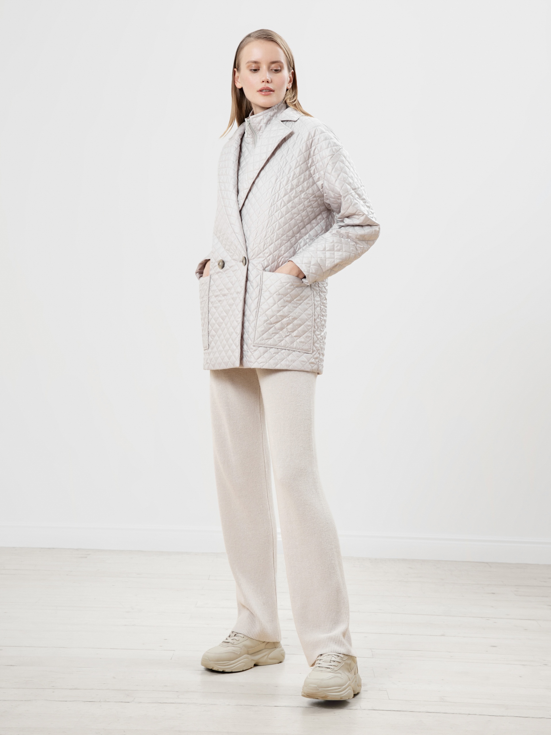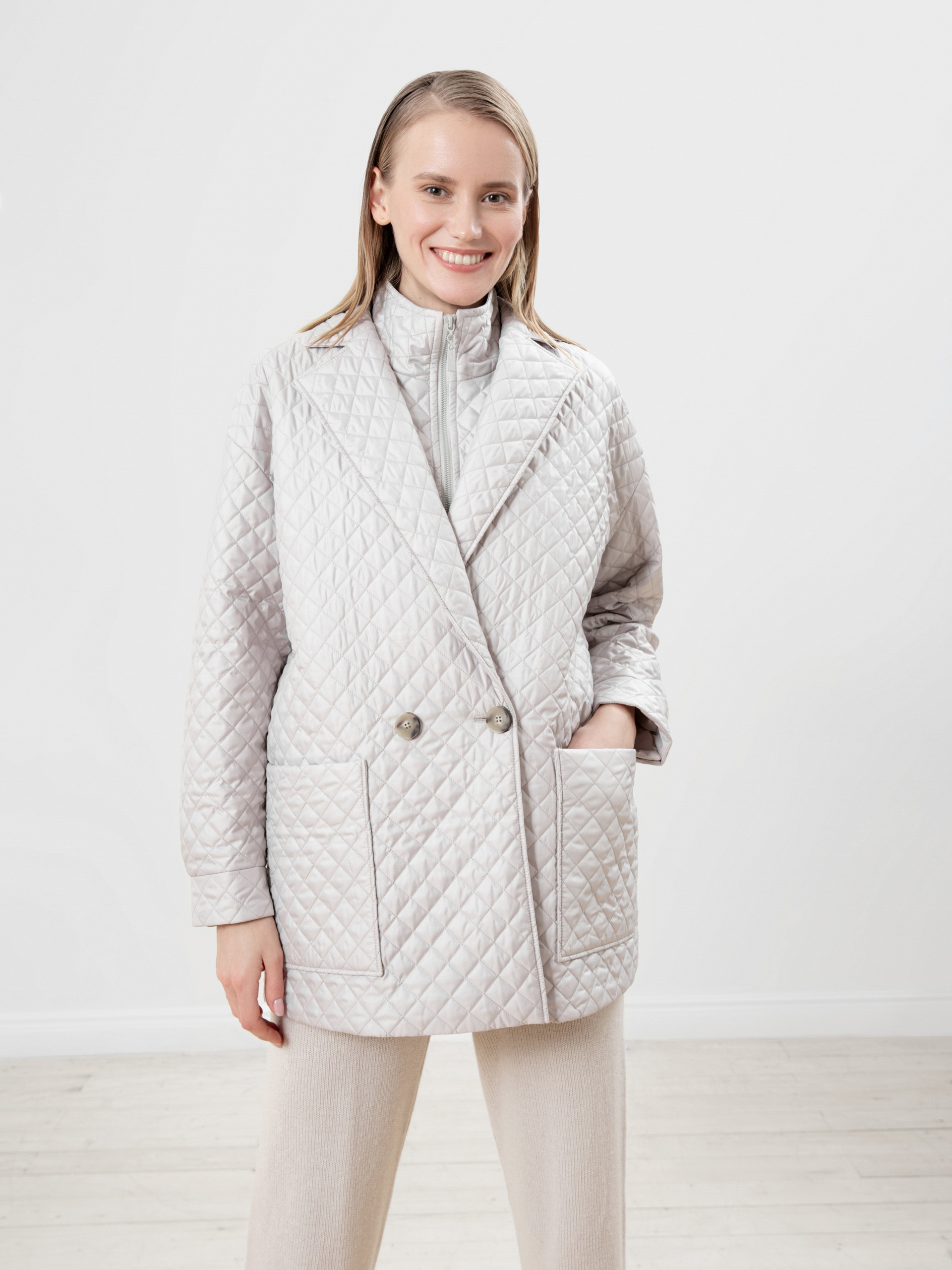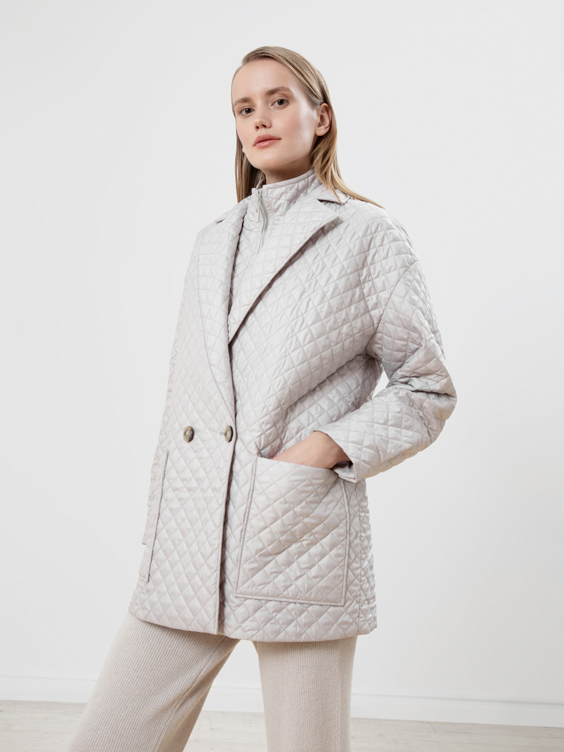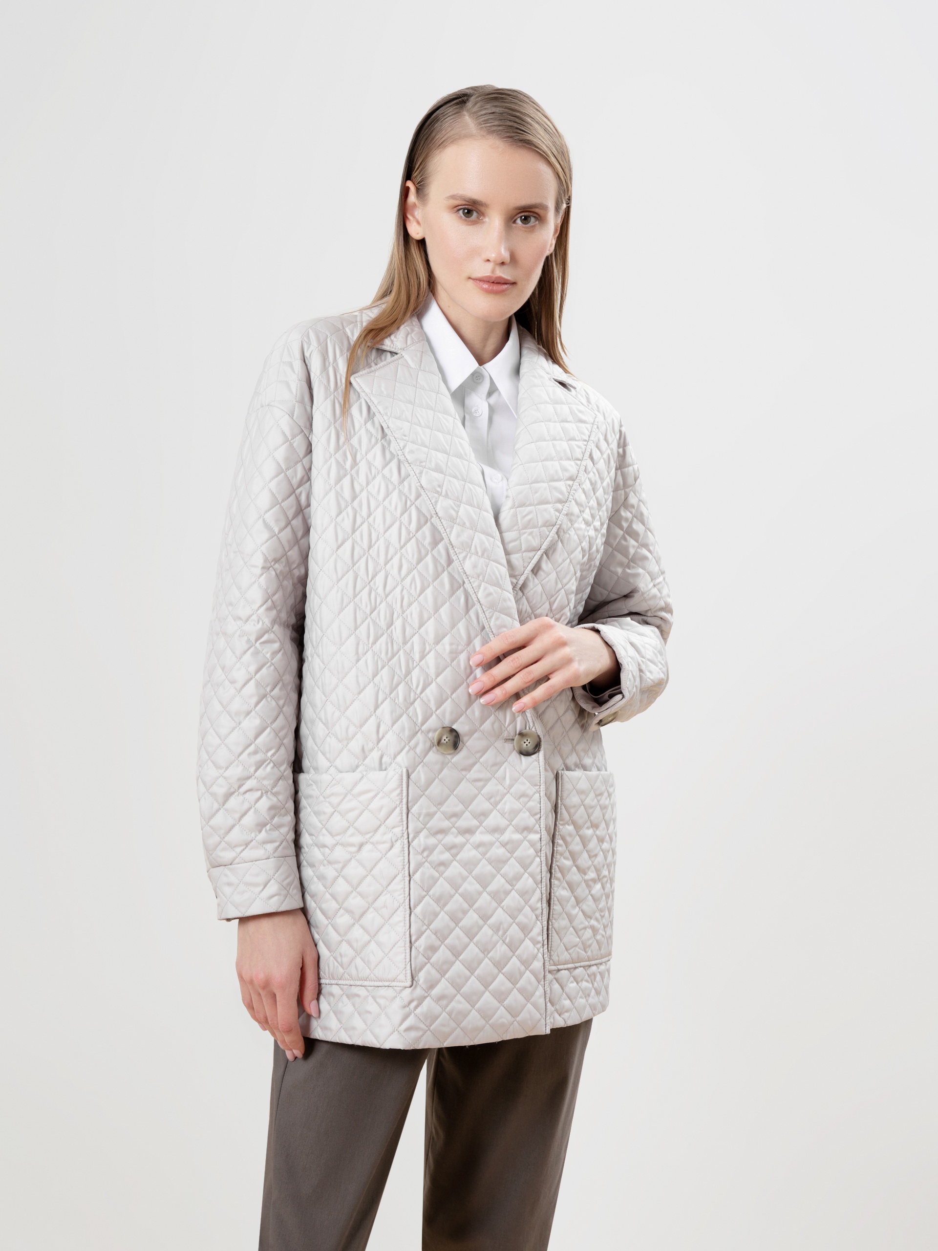 Удлинённый двубортный жакет прямого силуэта из стёганой плащевой ткани жемчужного цвета с v-образным вырезом горловины, английским воротником, спущенным плечом и втачным рукавом полной длины. Спереди два крупных накладных кармана и застежка на две пуговицы. В этом жакете вы будете не только самой модной, но и точно не замерзнете в осенний период времени.