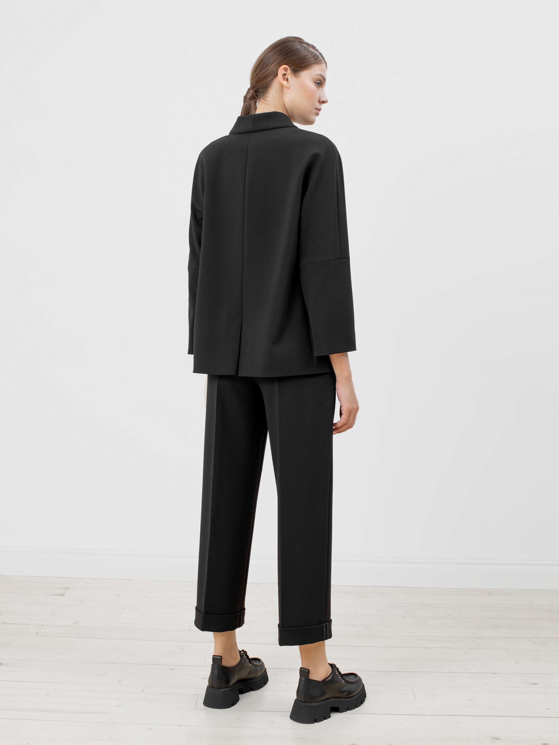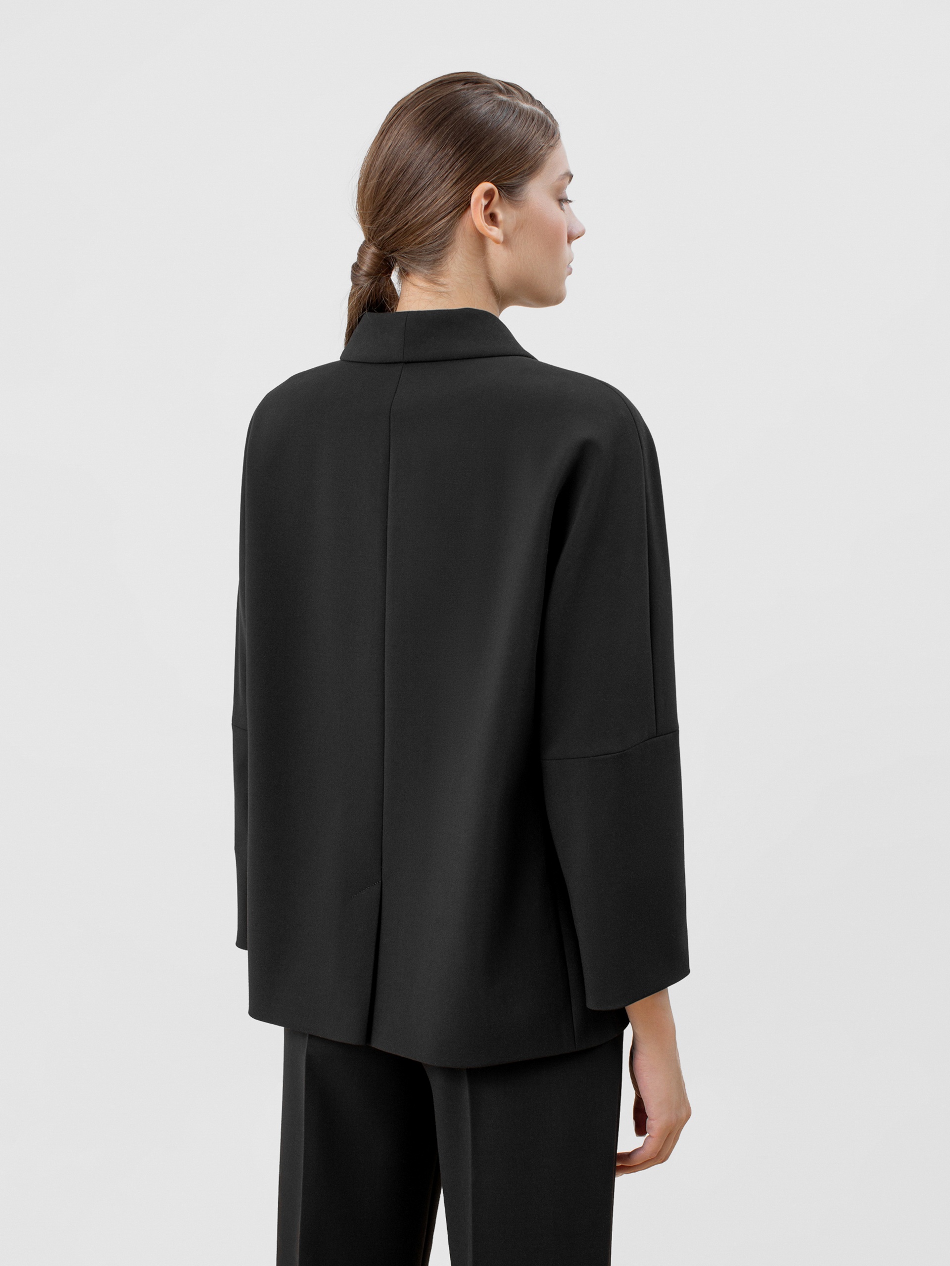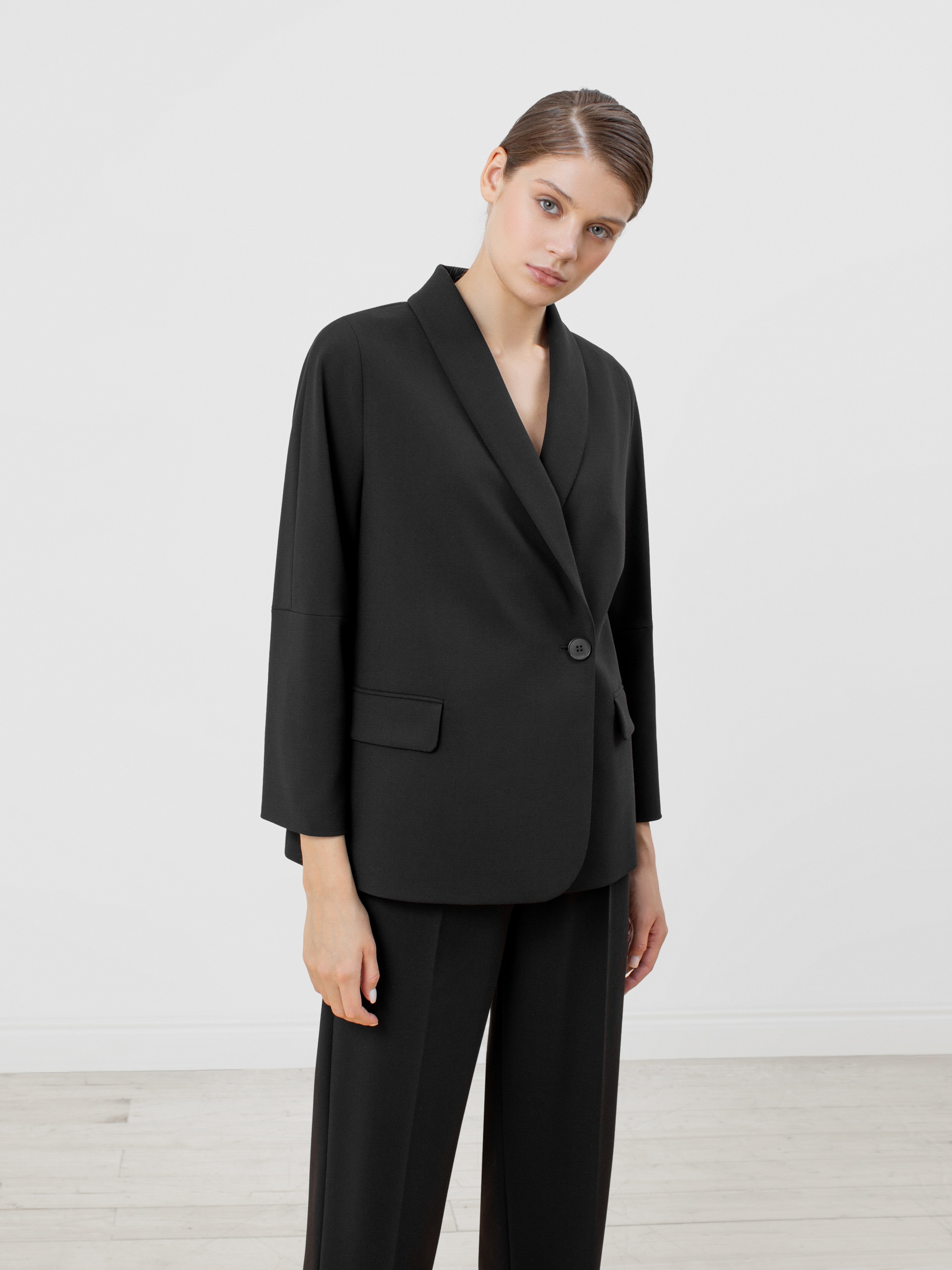 Жакет прямого силуэта из костюмной ткани , с V-образным вырезом горловины, воротником-шаль и рукавом-кимоно. Спереди прорезные карманы с крупными клапанами и застежка на пуговицу. Жакет прекрасно сочетается с брюками из такой же ткани.