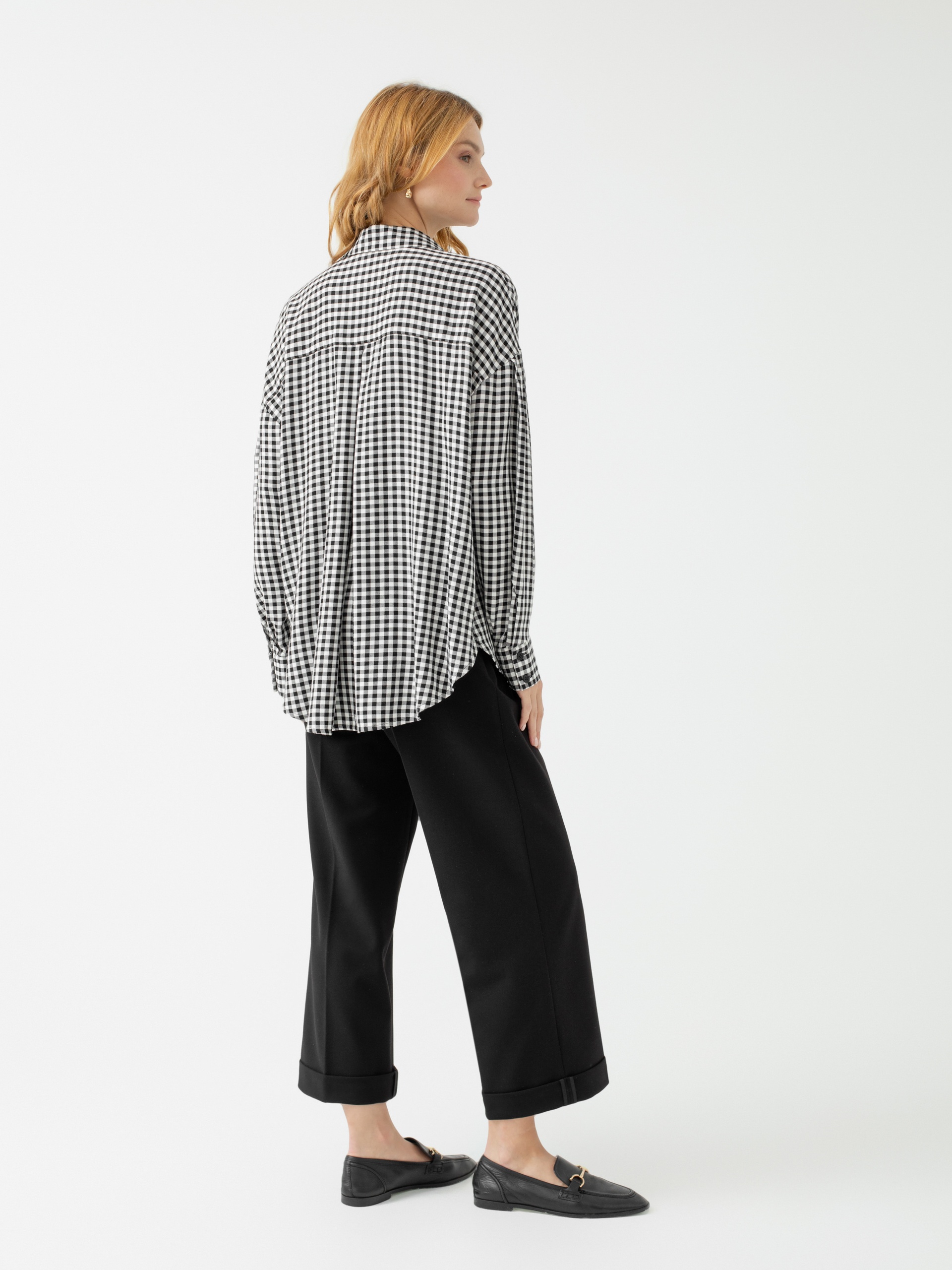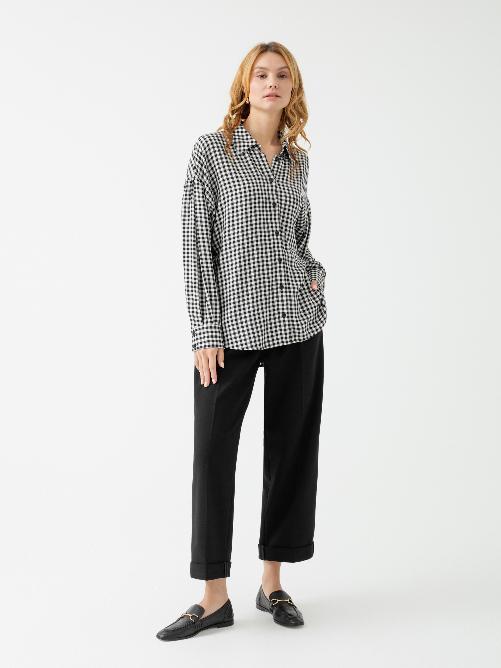 Рубашка прямого, свободного силуэта со спущенным плечом, рукавом полной длины с манжетой, отложным воротником и потайной застежкой спереди на пуговицы из легкой ткани с принтом в виде черно-белой клетки "виши". Объемный рубашечный рукав получается благодаря декоративным складкам. Низ рубашки фигурный с удлиненной спинкой.