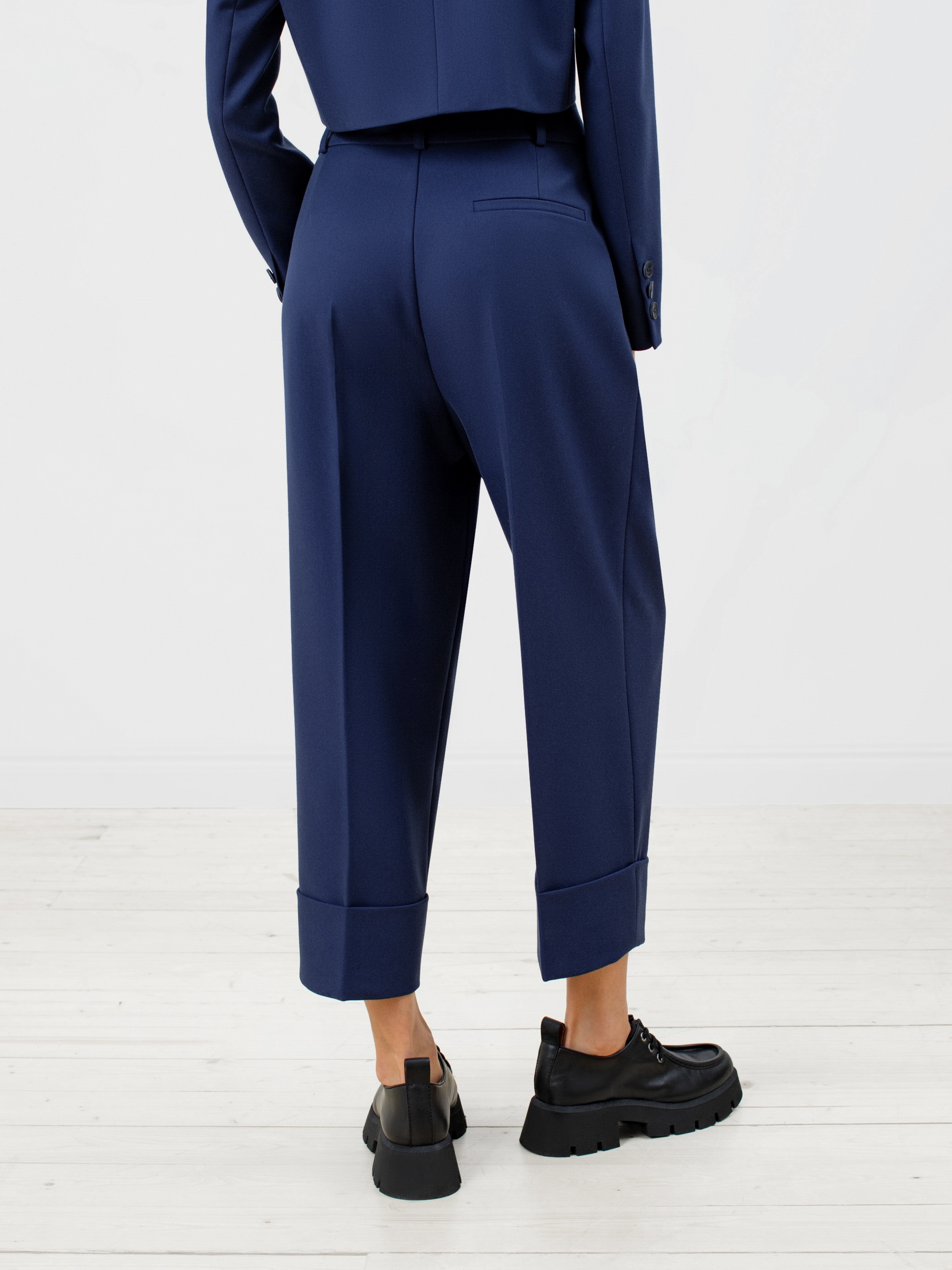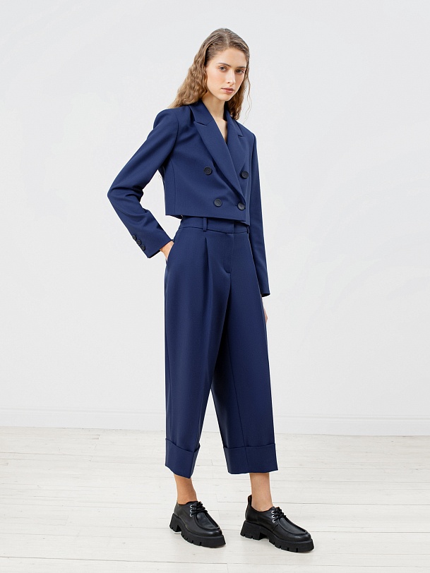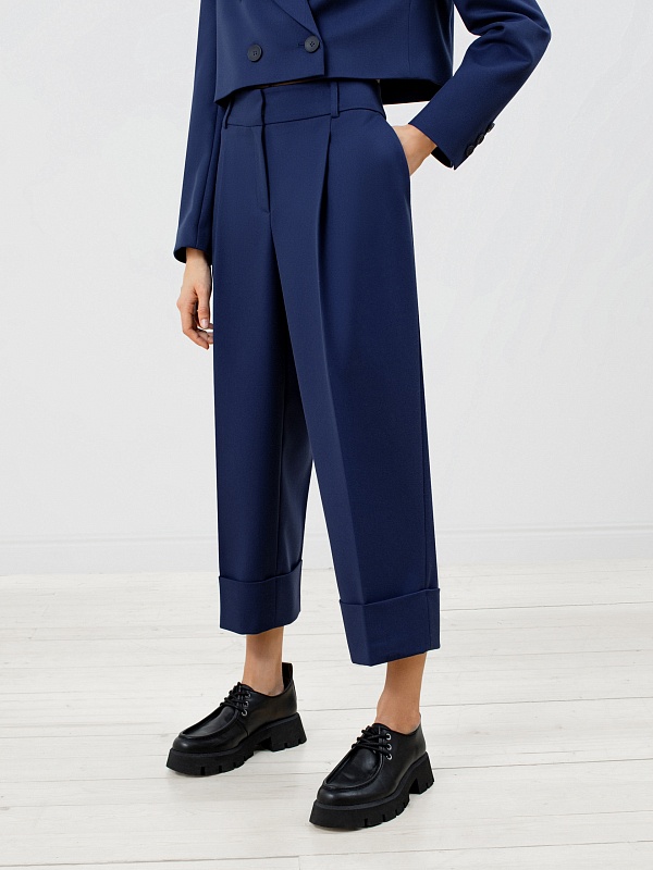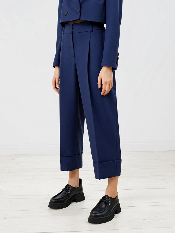 Стильные брюки из костюмной ткани со стрелками прямого силуэта на притачном поясе с шлевками. Спереди рабочие боковые карманы, складки и застежка на молнию. По низу изделия широкие отвороты. Эта модель идеально сочетается с жакетом из этой же ткани.