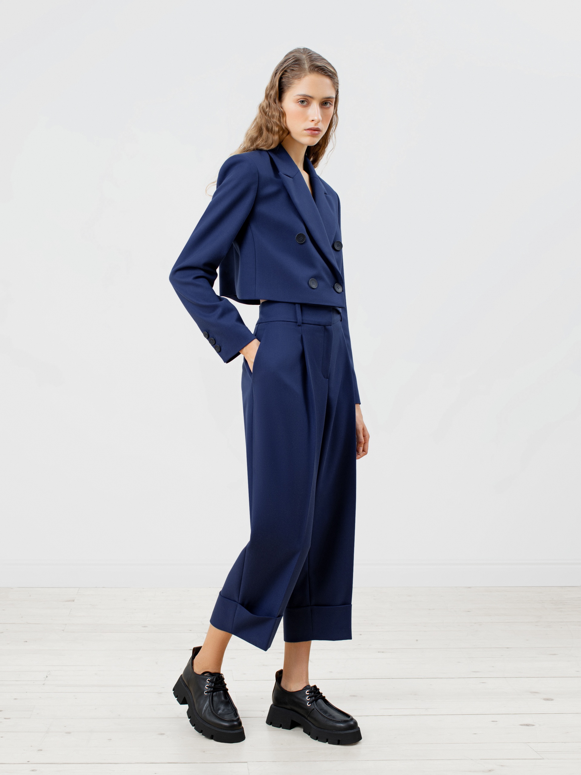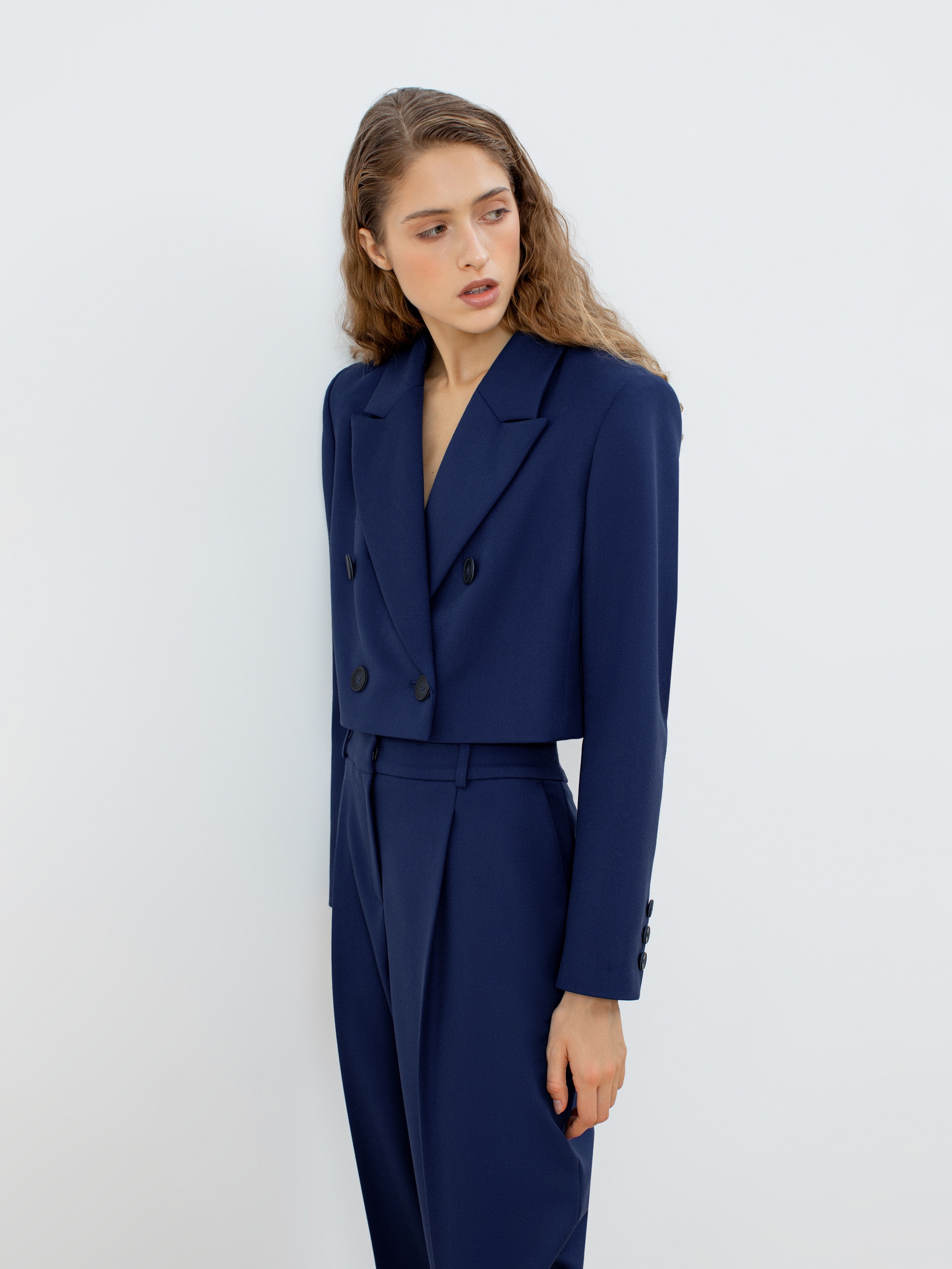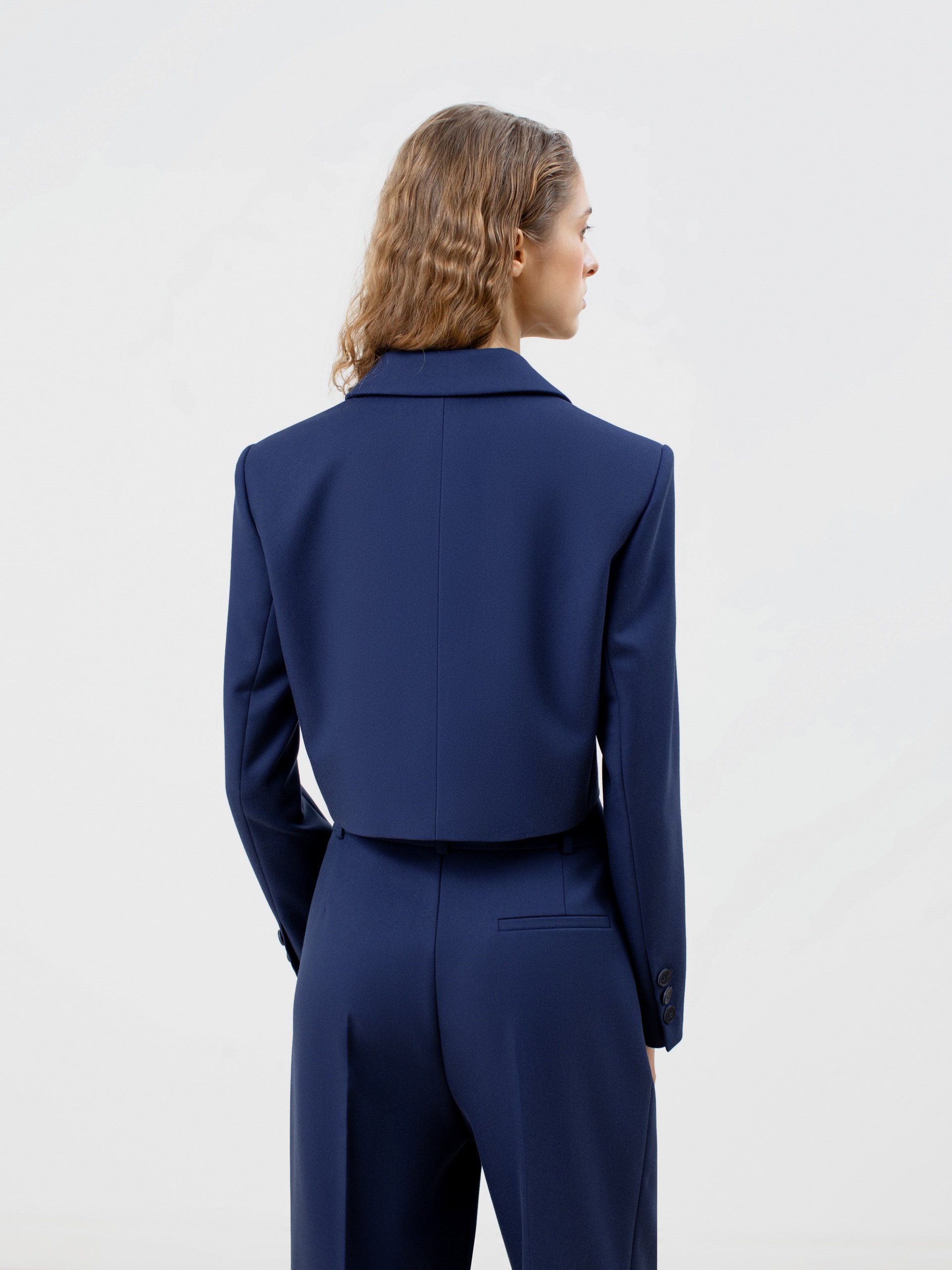 Трендовый двубортный жакет укороченного прямого силуэта из костюмной ткани насыщенного синего цвета. Модель имеет v-образный вырез, классический английский воротник и втачной рукав полной длины. Застёжка спереди на пуговицы. Жакет идеально сочетается с брюками из этой же ткани.