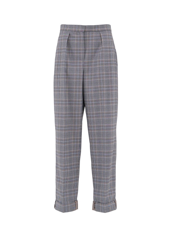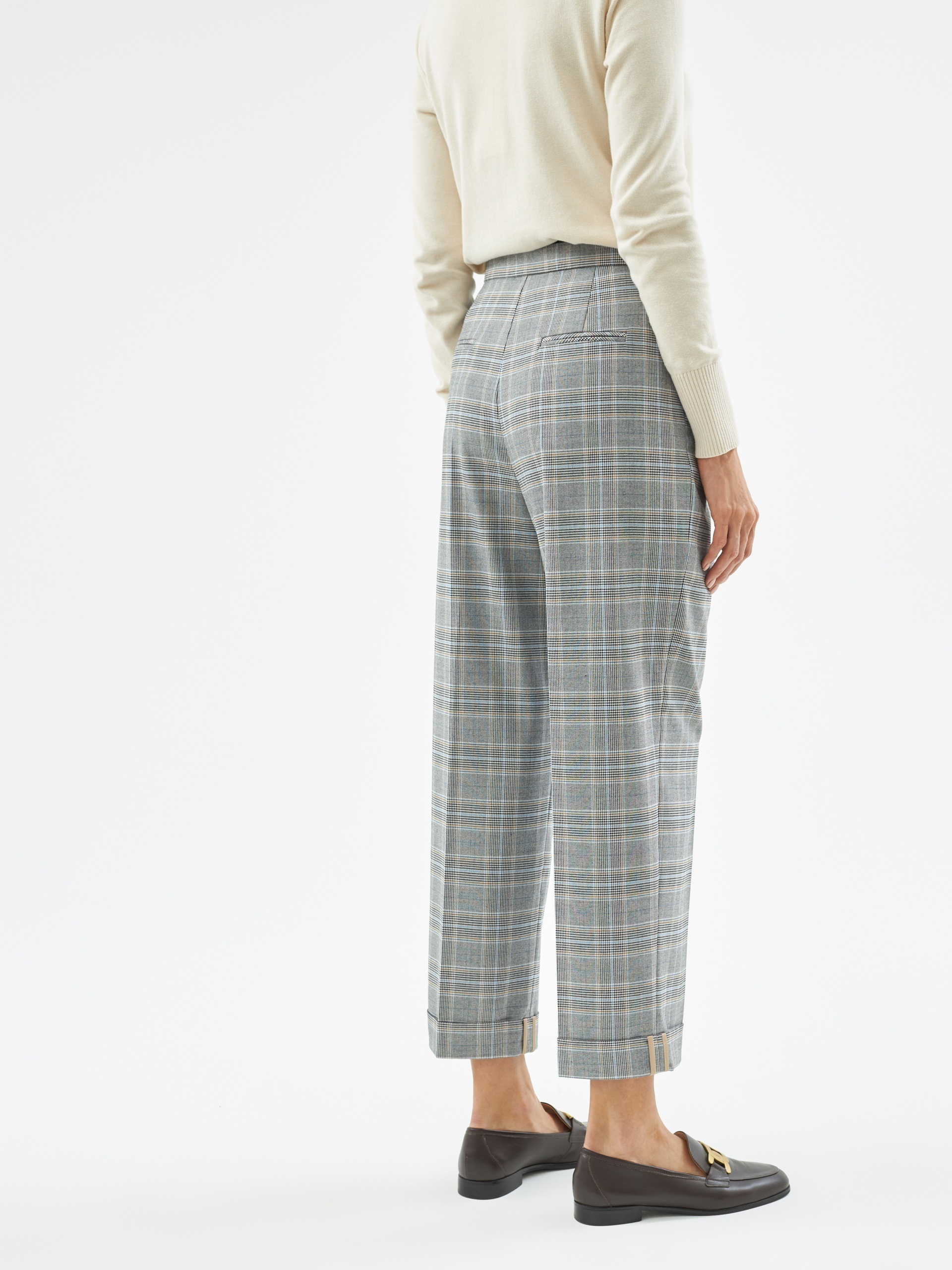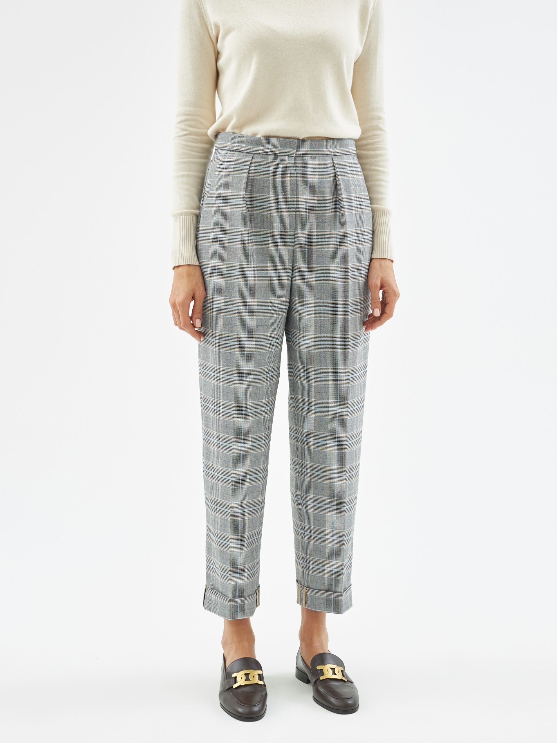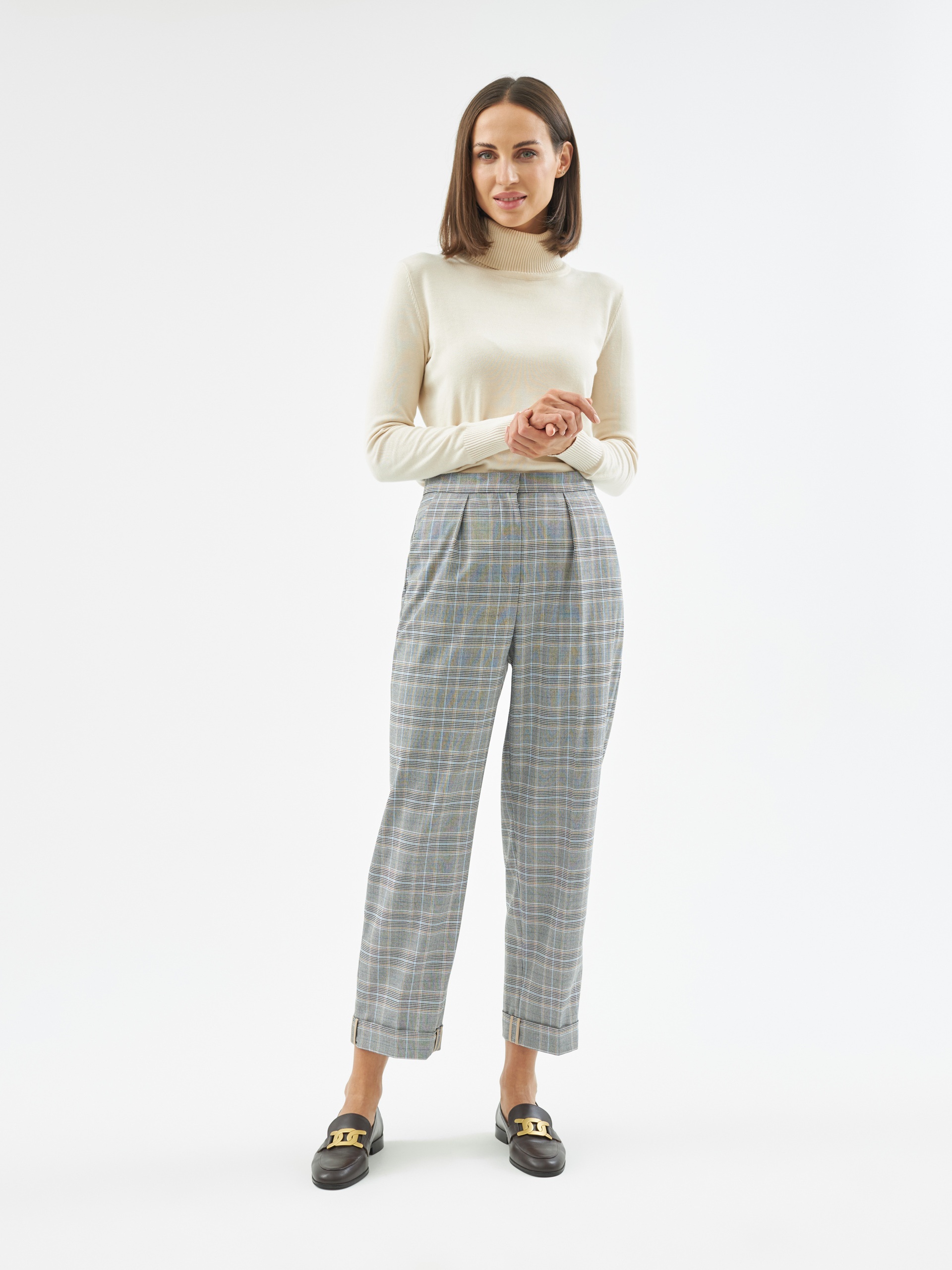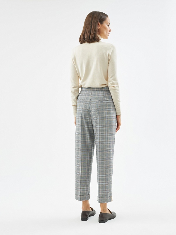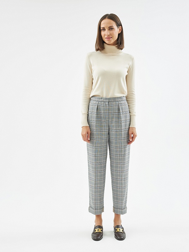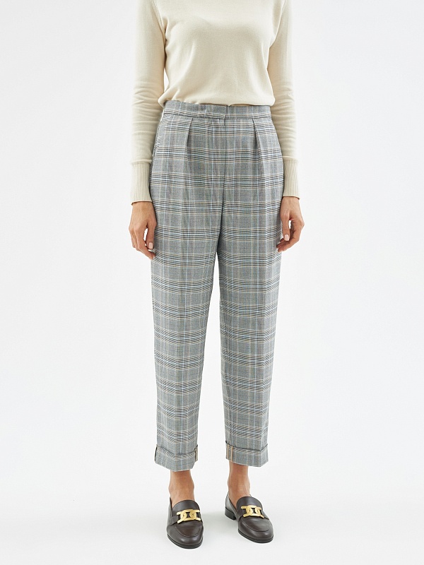 Брюки со стрелками из серой костюмной ткани в контрастную клетку прямого силуэта на притачном поясе с шлёвками. Спереди боковые карманы, складки и застежка на молнию. По низу брюк декоративные отвороты. На задней части брюк два прорезных кармана. Брюки идеально сочетаются с жакетом из такой же ткани.