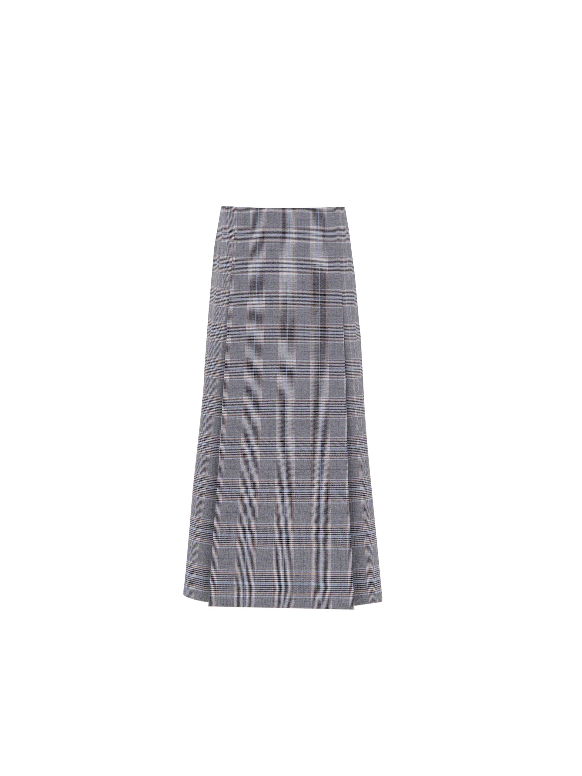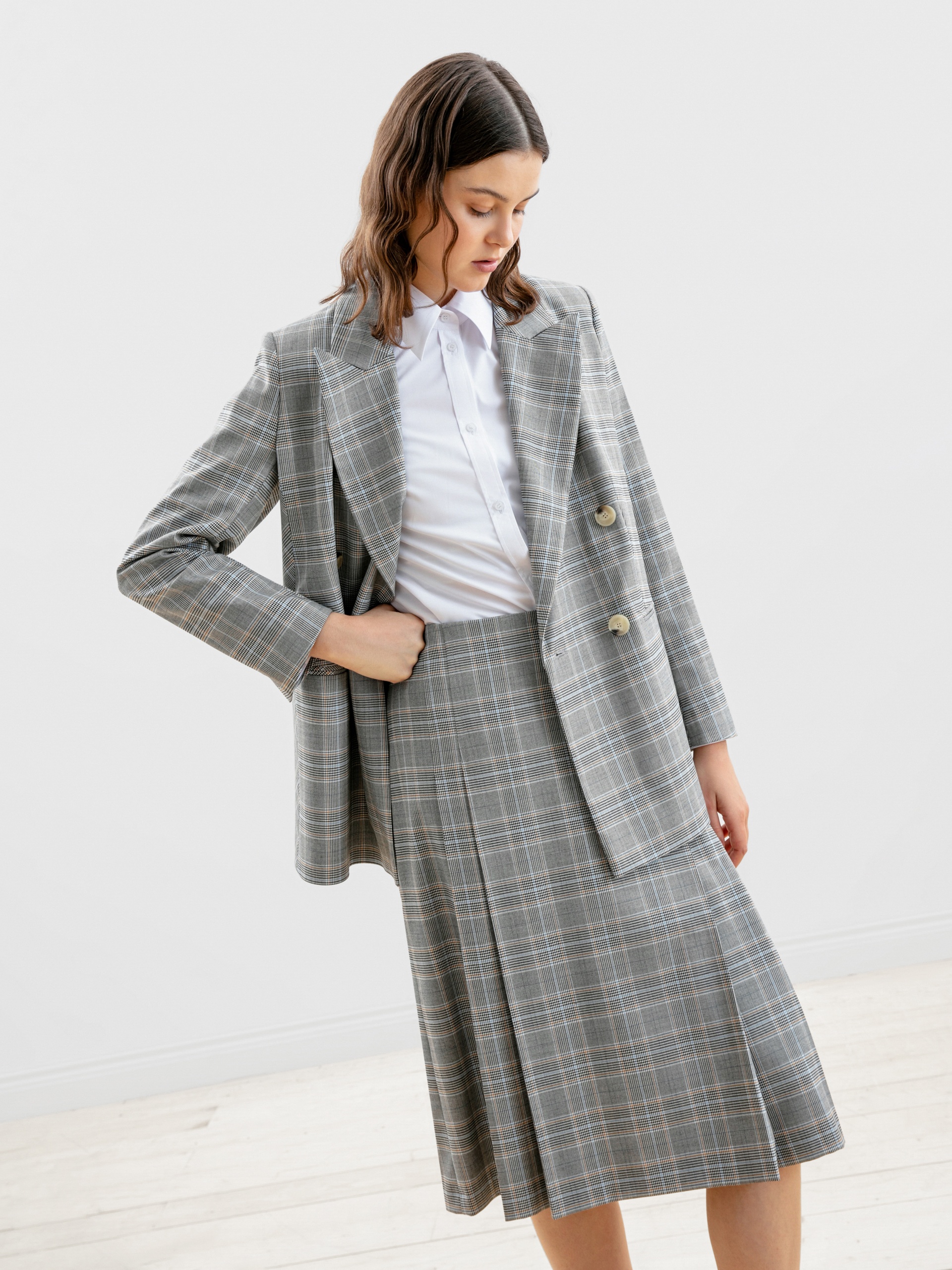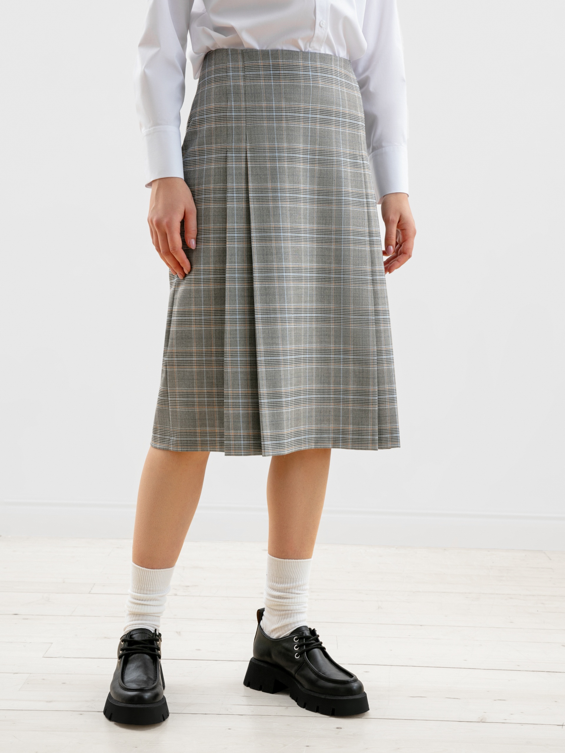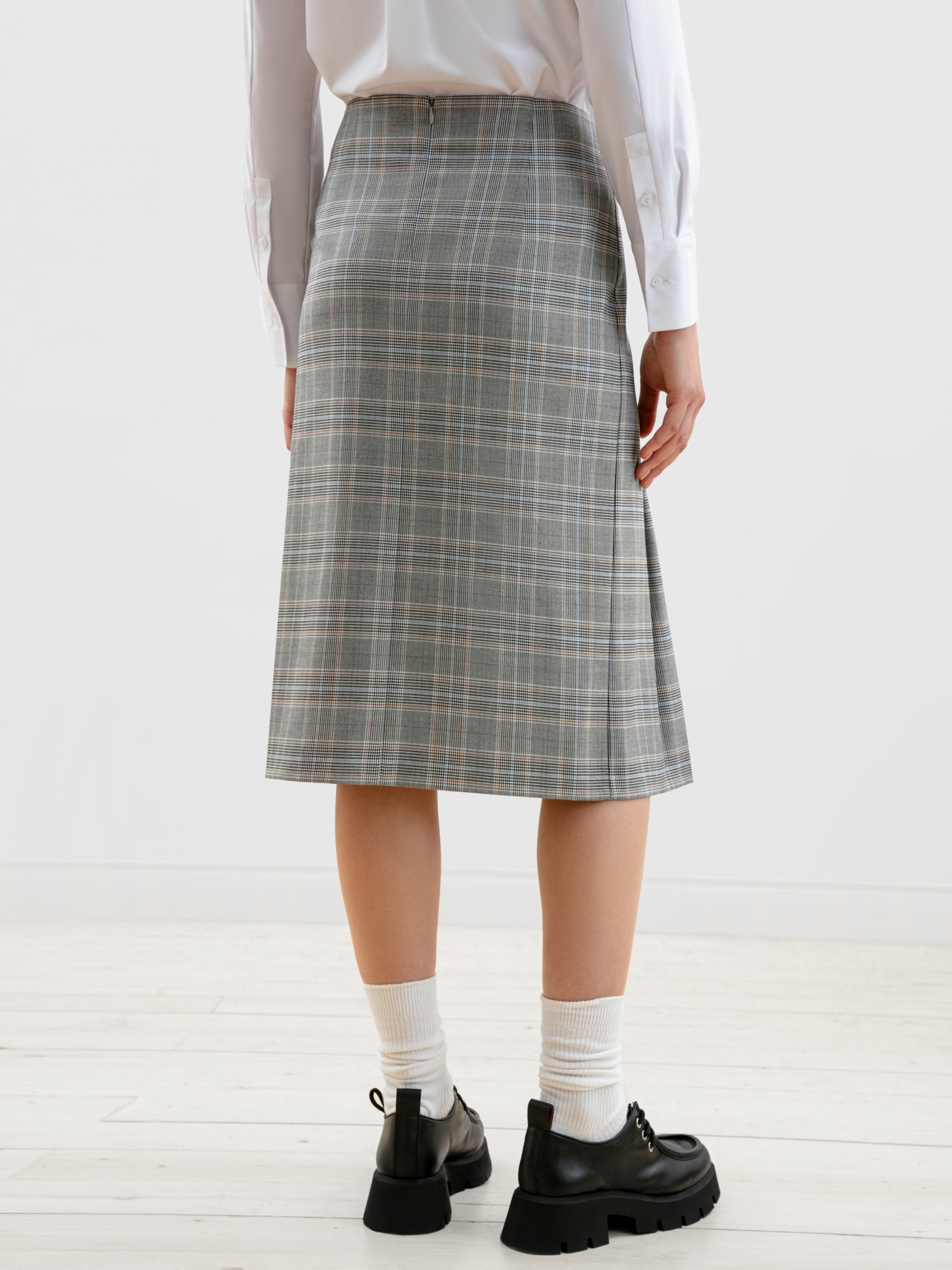 Юбка на подкладке из серой костюмной ткани в контрастную клетку. На передней части две широкие декоративные складки. Застежка сзади на потайную молнию.