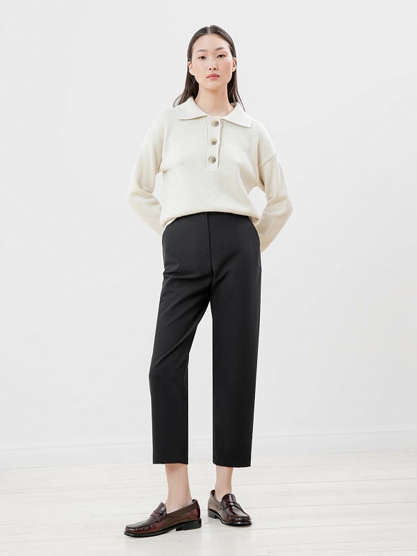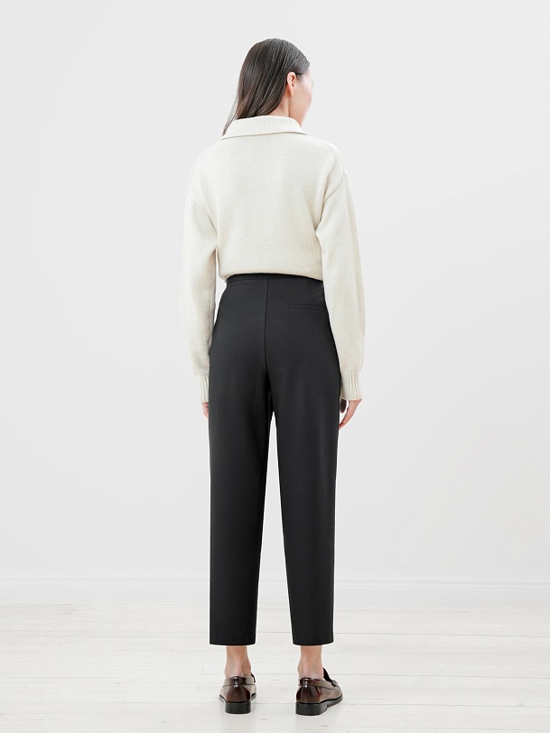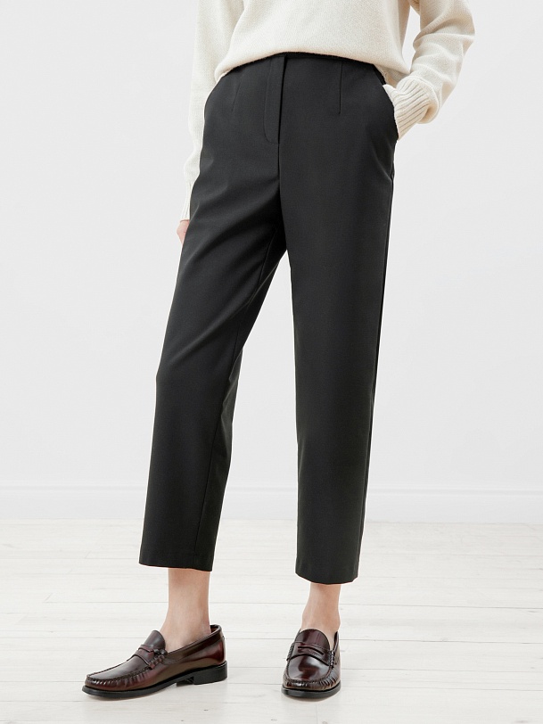 Данная модель брюк из костюмной ткани утеплена с изнанки флисом. Силуэт - полуприлегающий, слегка заужен к низу. Длина по щиколотку. Создайте гармоничный образ с ботинками и ботильонами, которые слегка будут скрываться под брюками.