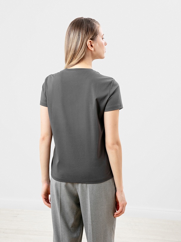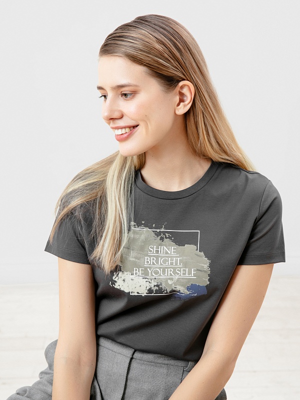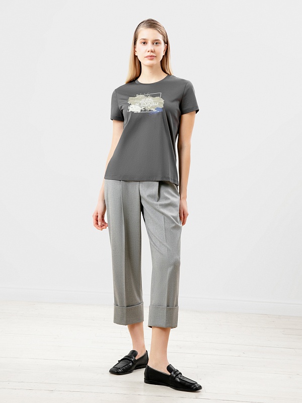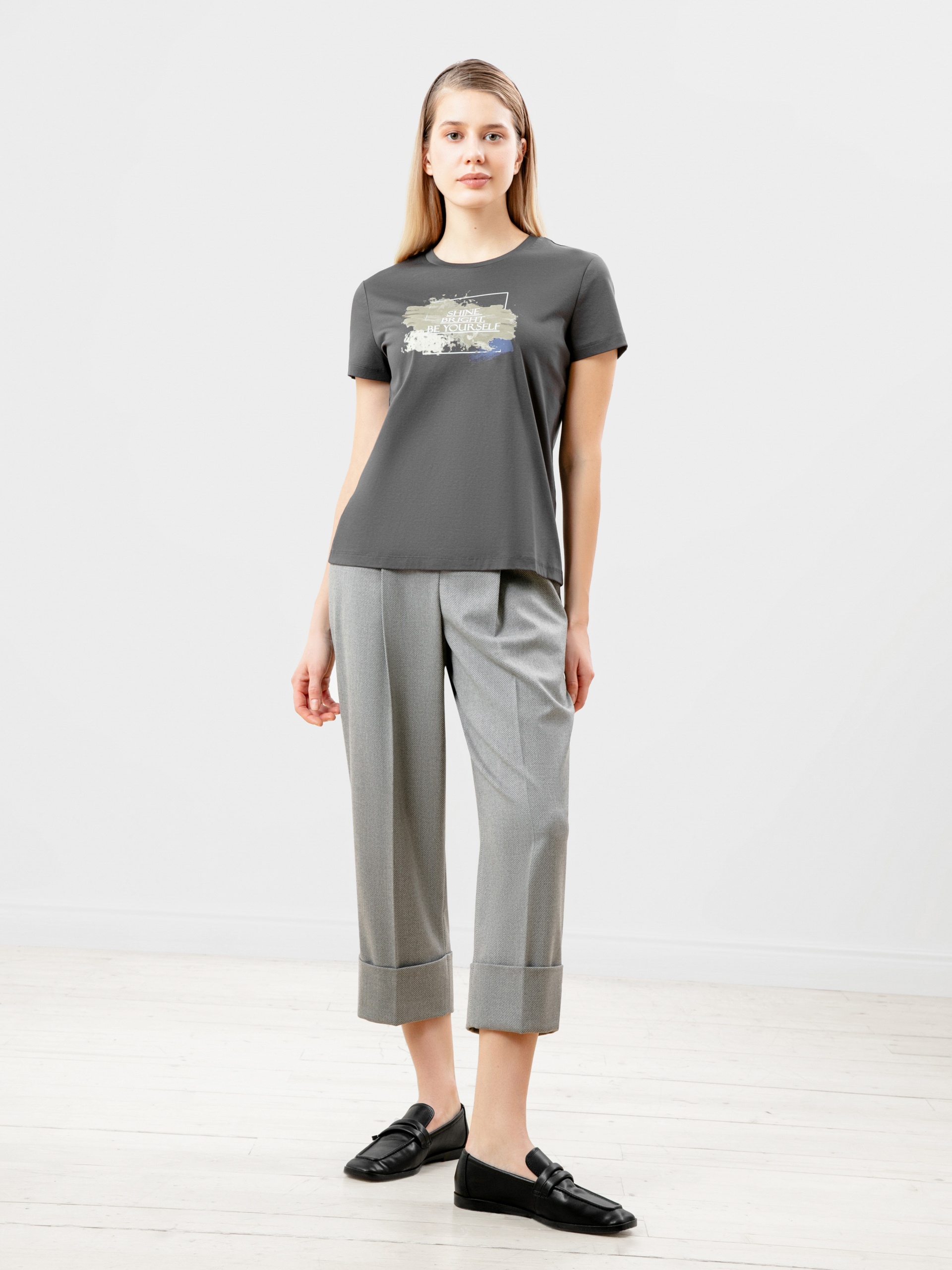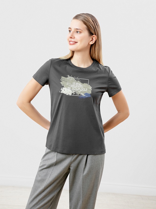 Футболка полуприлегающего силуэта из трикотажного полотна темно-серого цвета с ярким контрастным абстрактным принтом. Вырез горловины круглый, рукав короткий втачной. Эта модель станет прекрасным нижним слоем под жакеты.