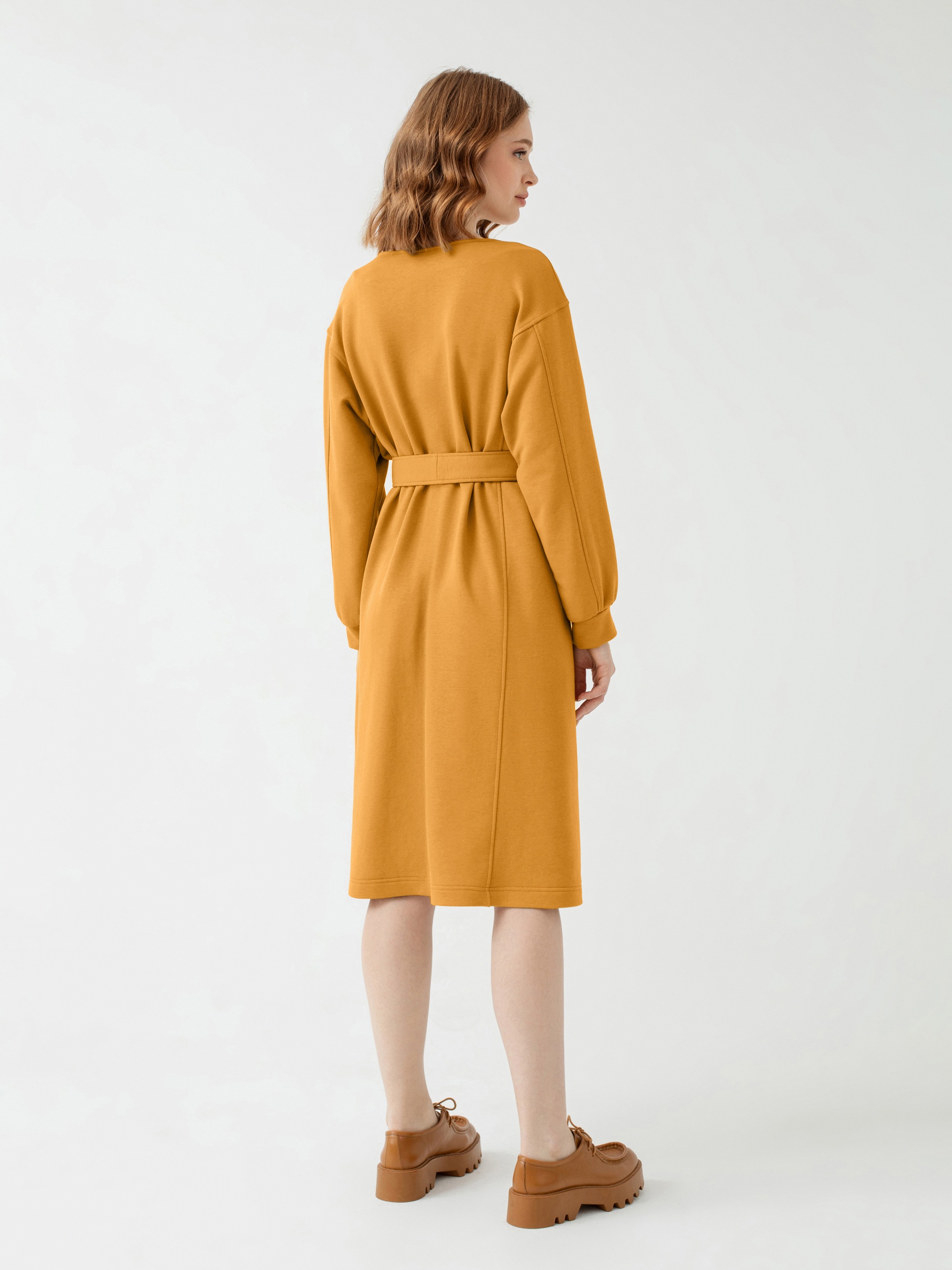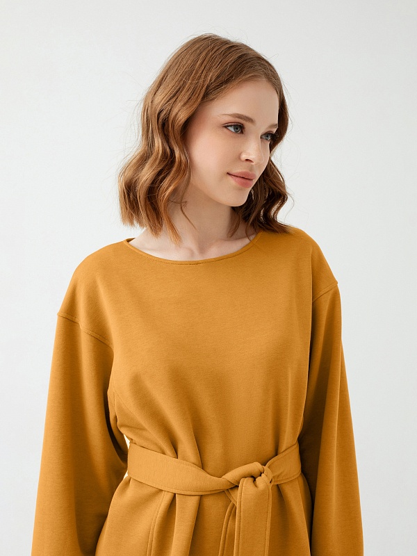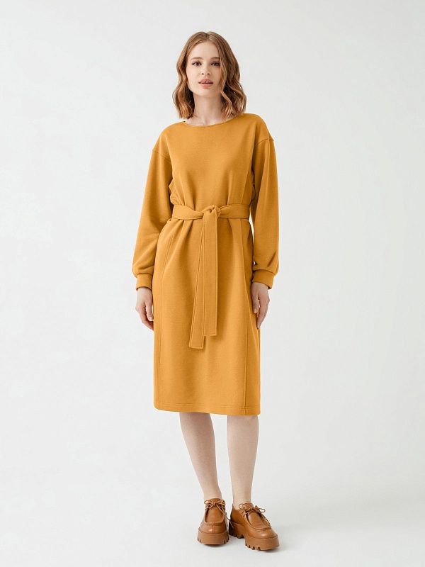 Теплое платье приталенного силуэта из трикотажного полотна в цвете корица с горловиной лодочка , спущенным плечом и объёмным рукавом с манжетой. Вертикальные рельефы визуально вытягивают фигуру. Пояс из основной ткани дополнит образ и подчеркнёт талию.